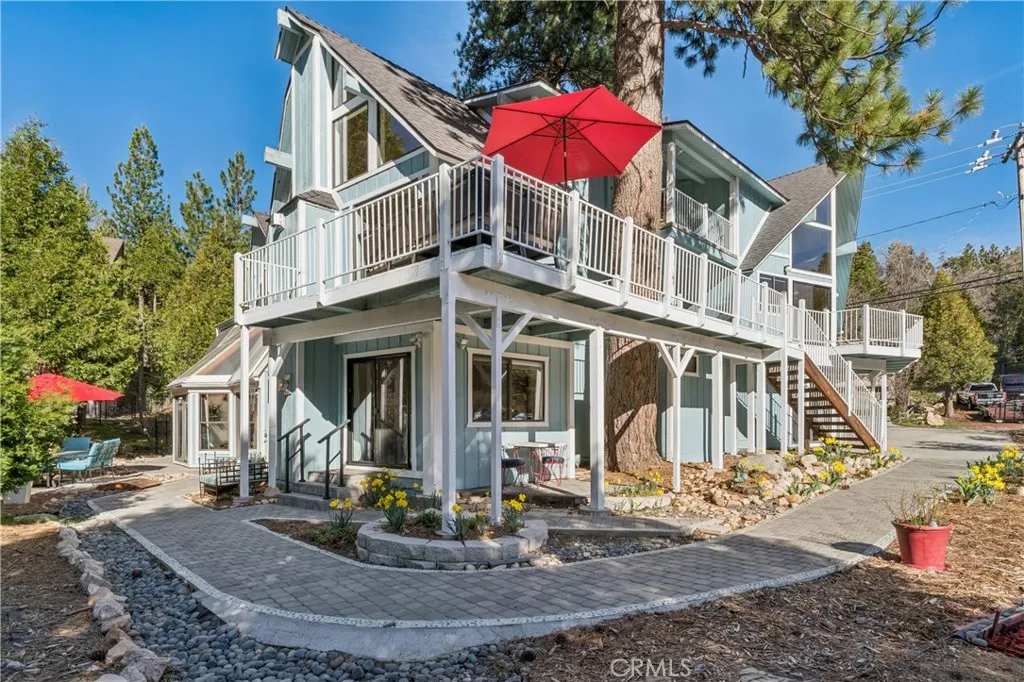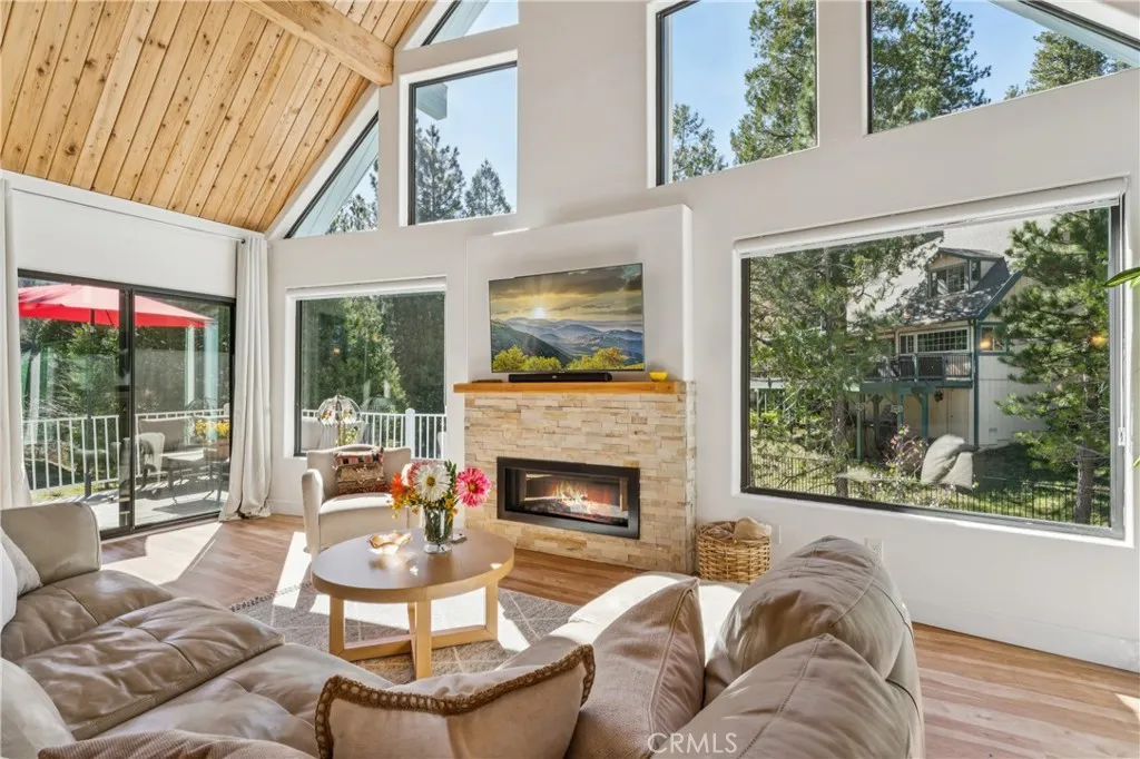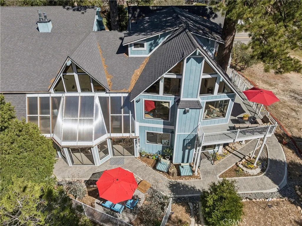An extraordinary mountain estate showcasing timeless architectural appeal blended seamlessly with modern comforts and conveniences. Thoughtfully designed and extensively renovated, this stunning approximately 5,585 square foot, six-bedroom residence was completed in 2022 with high-end upgrades tailored for todays lifestyle. Directly across from the prestigious Lake Arrowhead Country Club and near National Forest trails, the property also offers convenient commuter access. An adjacent golf course lot is available for purchase, presenting a rare opportunity for expansion or enhanced privacy. Currently configured as a single-family home with a separate yet attached two-bedroom, one-bath unit, the property offers exceptional flexibility for multi-generational living, guest accommodations, or income-producing rental opportunities.The main level welcomes you with vaulted ceilings and a dramatic wall of windows to create an airy ambiance, while the spacious living room features a beautiful stone, wood-burning fireplace. The upgraded kitchen is both elegant and functional, complete with high-end appliances and a generous dining area ideal for entertaining. This level also includes a bedroom and an office with a full guest bathroom. Two separate staircases lead to private ensuite bedrooms, offering comfort and privacy for family and guests. The lower level is designed for entertainment and versatility, highlighted by a remarkable recreation and game room with a striking atrium ceiling that fills the space with natural light. This level also includes a well-appointed secondary kitche