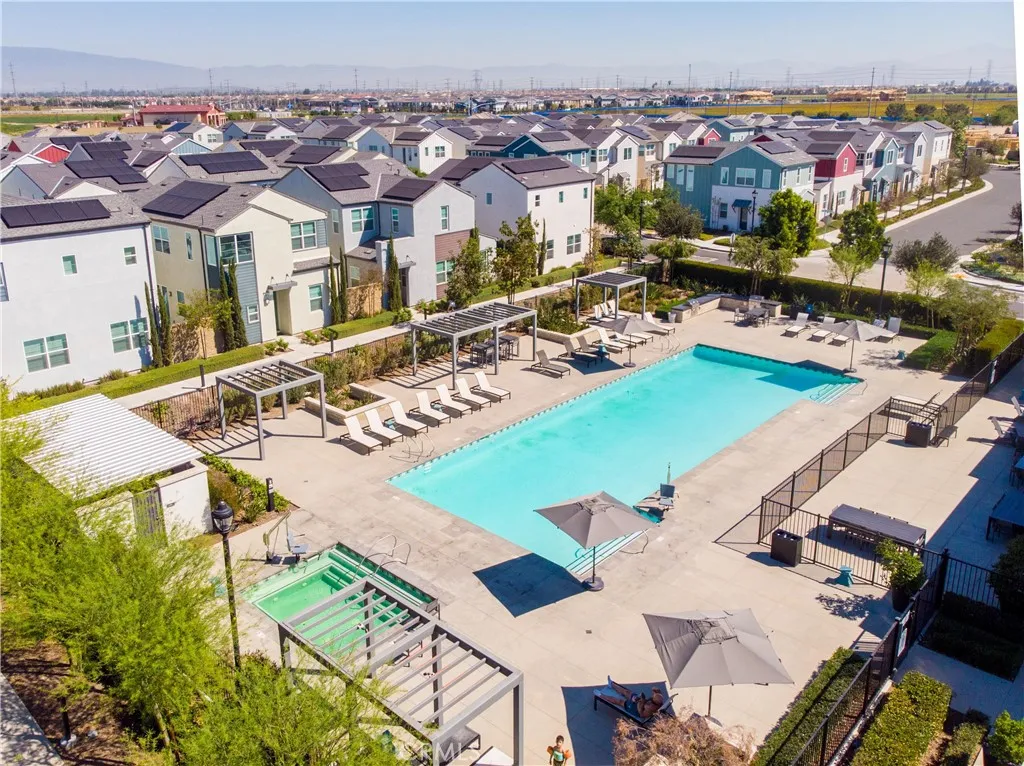 Welcome to a modern built 3 bedroom, 2.5 bathroom home located in the gated Nuvo Parkside community within Ontario Ranch. This elegant residence features a chef-inspired kitchen with stylish shaker cabinets, a large center island, stainless steel appliances, and tasteful finishes throughout. Enjoy energy-efficient living with upgrades including **PAID-OFF SOLAR**, **1 YEAR PAID HOA**, **NEW INTERIOR PAINT**, custom shutters, ceiling fans, EV power source, newly finished garage floor, paved patio, and appliances. Residents enjoy resort-style amenities such as a pool, spa, modern clubhouse, fitness center, park, tot lot and BBQ areasperfect for relaxation and entertaining. Ideally situated with convenient access to Ontario International Airport, Los Angeles and Orange County, Toyota Arena, Top Golf, the upcoming Ontario Sports Empire and Ontario Field, and premier shopping and dining at Ontario Mills. This home offers the perfect blend of modern comfort, luxury, and convenience.