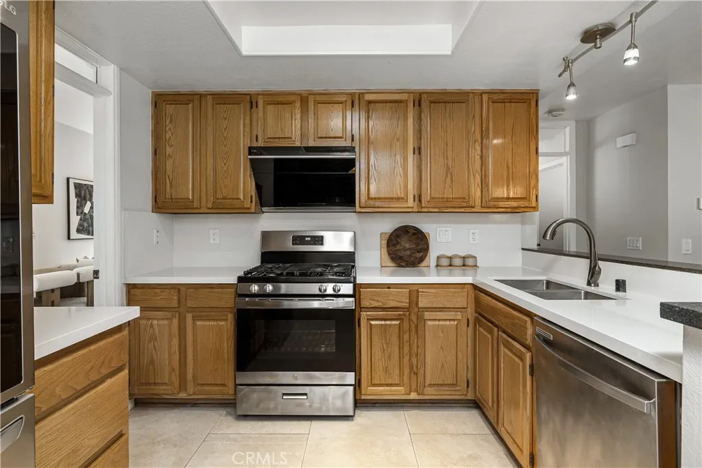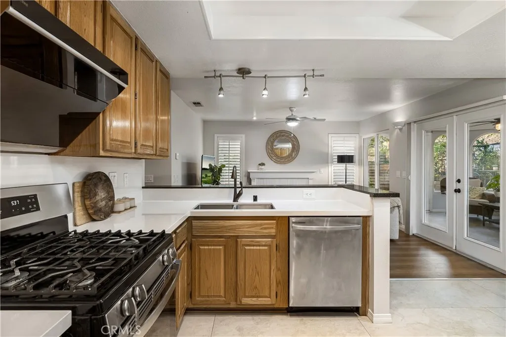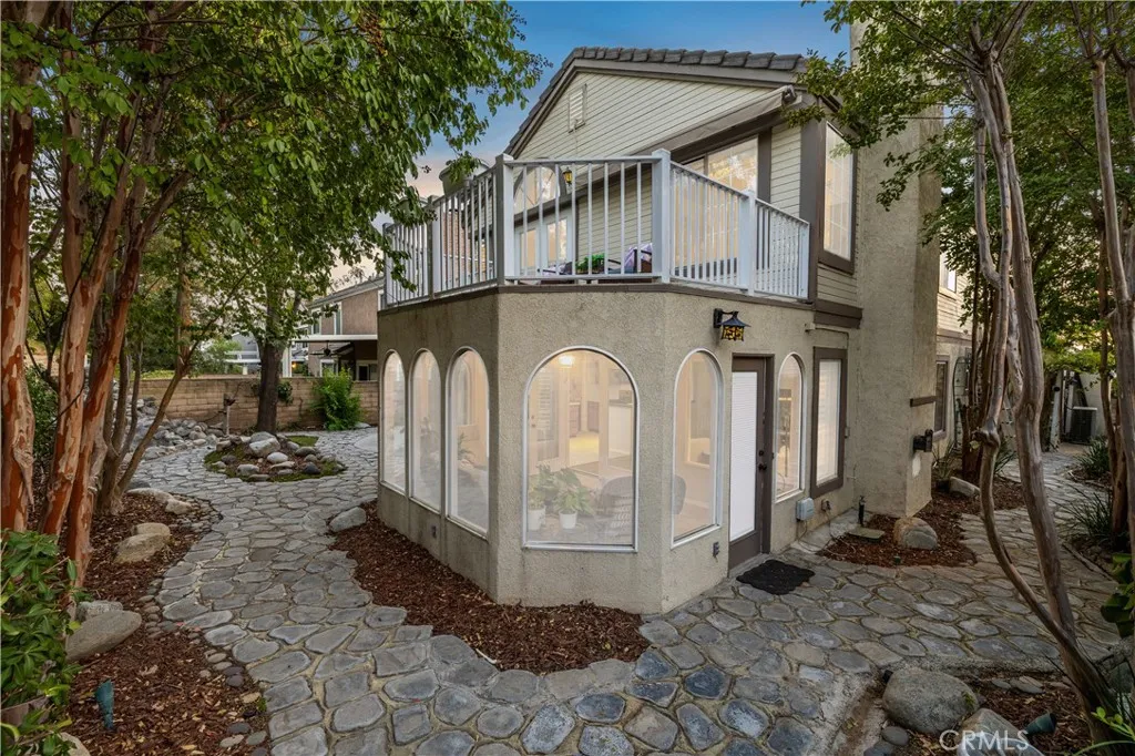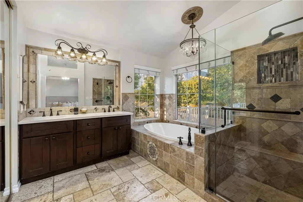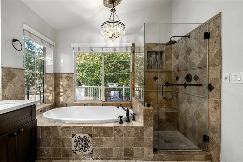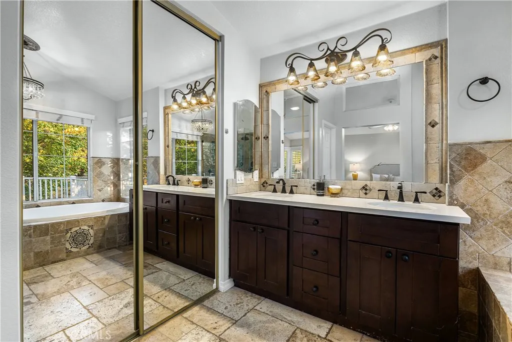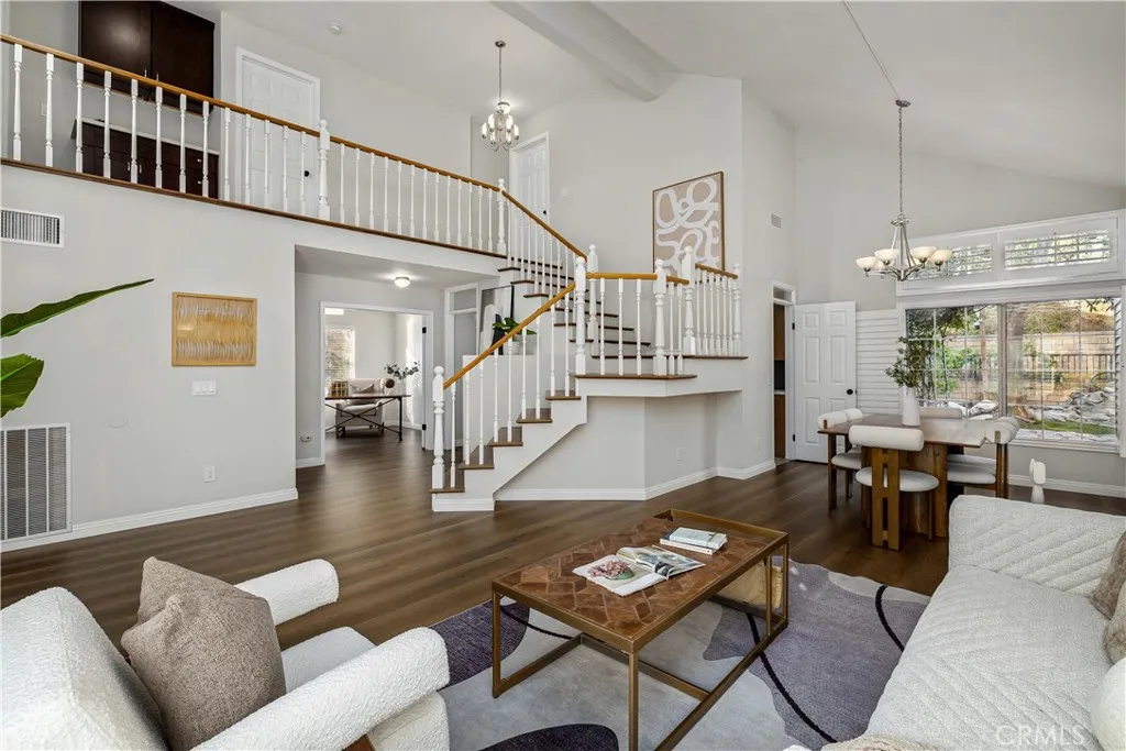 Remodeled home situated in a tucked lot of a quiet cul-de-sac located in the Emerald Ridge at Live Oak gated community. This home offers a long driveway leading to a two-car garage, landscaped front yard, and a covered front porch. Inside, enjoy soaring ceilings and a bright, open floor plan with a view of the center staircase and the living room featuring durable LVP flooring, large windows with plantation shutters, and an adjacent formal dining room with a chandelier and backyard view. The updated kitchen includes wood cabinetry, quartz countertops with full backsplash, stainless steel appliances, recessed lighting, and a breakfast nook, and is open to the family room. The family room has a fireplace with a mantel, windows with shutters, and access through glass French doors to a versatile space, ideal as a playroom, office, or additional lounge, that can remain private or open to the family room. Downstairs also offers a bedroom with double entry doors (currently used as an office), a remodeled bathroom with a custom tiled shower and updated vanity, a laundry room with cabinetry, and direct access to the attached two-car garage. Upstairs, the primary bedroom features a vaulted ceiling, double glass French doors leading to a balcony with mountain and greenbelt views, and direct access to the bathroom. The bathroom offers travertine tile in a versailles pattern, dual sinks, a frameless glass shower, separate tub with greenbelt views, and a walk-in closet with mirrored doors. Two additional bedrooms and a remodeled hall bathroom complete the upstairs. The backyard is set ag