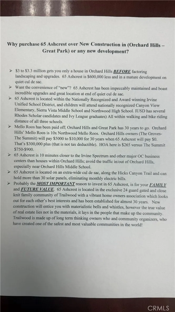Thinking about buying brand-new construction? Read this first. Before you pay extra taxes, higher HOA fees, and wait months for completion, take a look at 65 Ashcrest. Welcome to 65 Ashcrest, a rare opportunity to own a spacious, beautifully appointed residence in the exclusive 24-hour guard-gated community of Trailwood. Combining timeless design, natural light, and an established neighborhood setting, this home offers the lifestyle many buyers hope to findbut rarely do. Spanning approximately 3,000 square feet, this thoughtfully designed home features 5 bedrooms plus a private office and versatile loft, along with 4.5 bathrooms, including a highly desirable main-level guest suite ideal for multigenerational living or visiting guests. An eastwest orientation fills the home with warm natural light throughout the day, enhancing the open living spaces and creating an inviting atmosphere for both everyday living and entertaining. The surrounding community is known for its mature landscaping, tree-lined streets, and tranquil ambiancea refreshing alternative to newly built developments. Residents of Trailwood enjoy access to two resort-style swimming facilities, including one within the guard gates and another at nearby Meadwood Park, offering exceptional recreation just moments from home. Located within the National Blue Ribbon Awardwinning Irvine Unified School District, the home is also uniquely positioned with all three neighborhood schools less than one mile away, making daily life both convenient and connected. Adding to the communitys charm is the beloved annual Trailwood