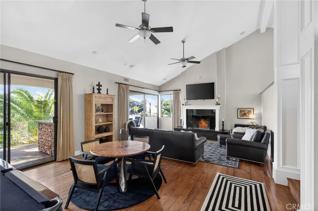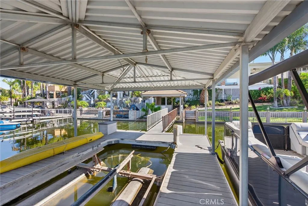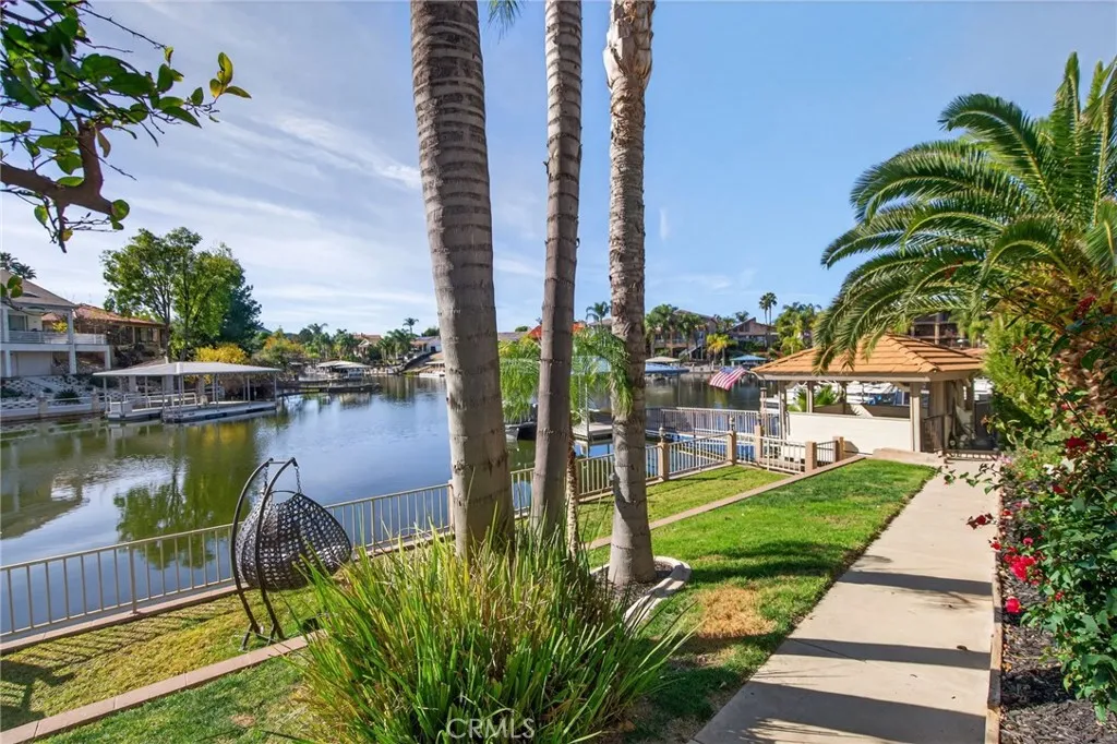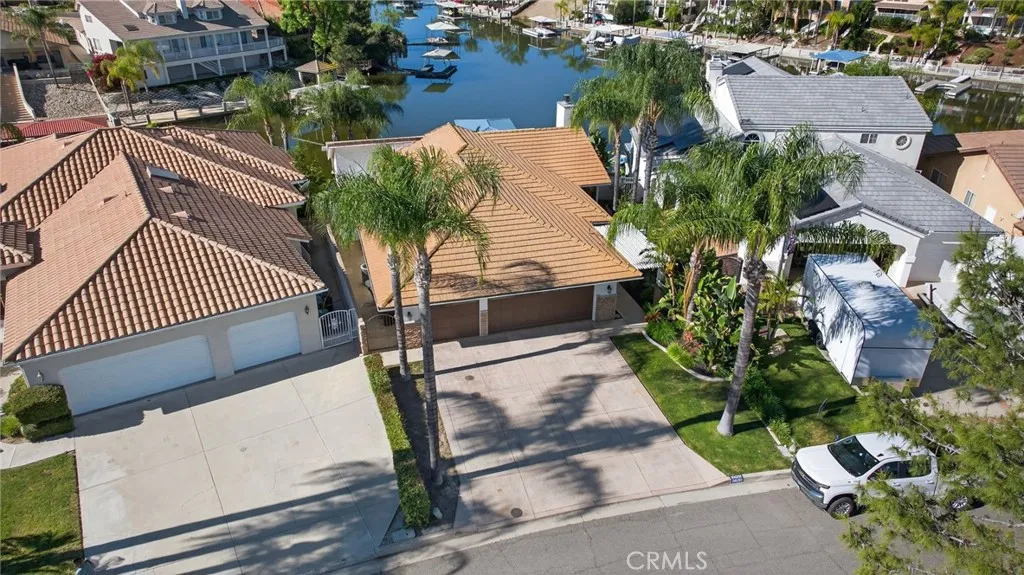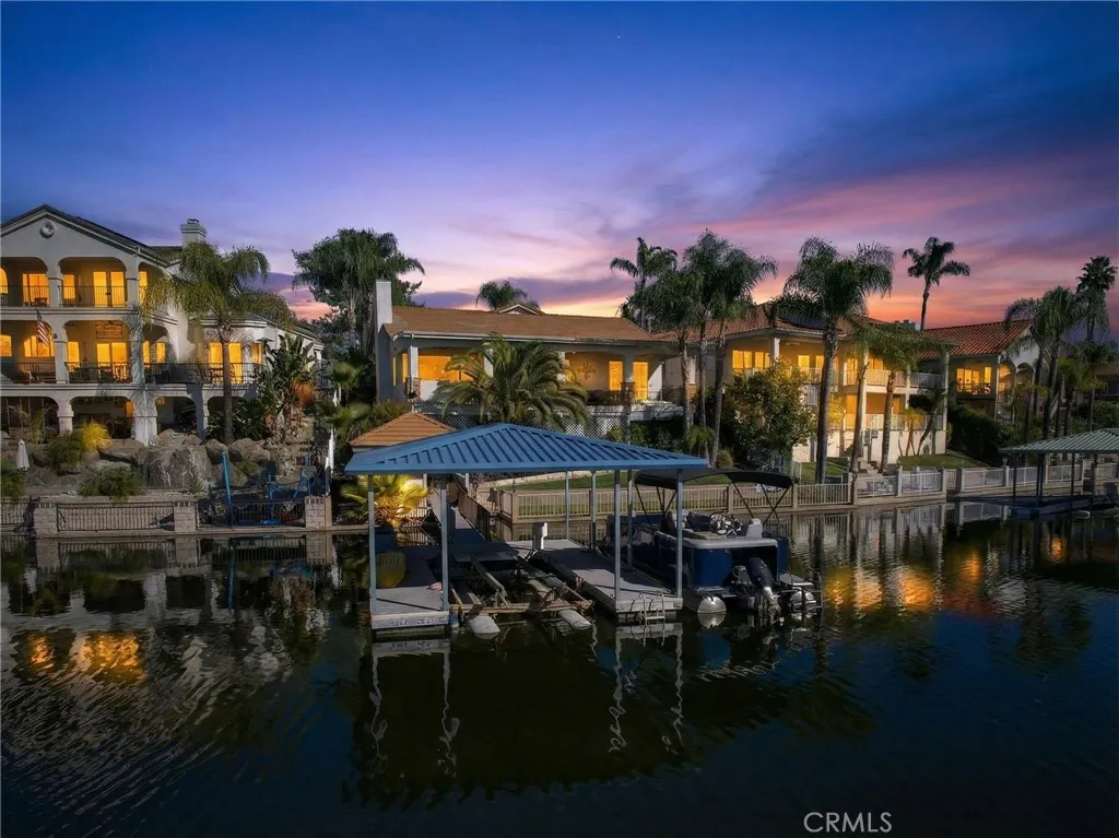 This is the lakefront lifestyle youve been waiting for - showcasing gorgeous water views, a beautifully upgraded interior, private dock, 3-car garage, and a flat driveway, all set within Canyon Lakes highly desirable East Bay. From the moment you arrive, the home welcomes with mature tropical landscaping, soaring palm trees, and an inviting Dutch door entry. Upon entering, youre instantly greeted by expansive lake views and dramatic vaulted ceilings. The light-filled, open layout is designed for both everyday comfort and effortless entertaining, featuring rich wood and travertine flooring, a formal dining space, and a spacious living room centered around a cozy wood-burning fireplace. The kitchen is both functional and impressive, offering stainless steel appliances, double wall ovens, a center island, pantry, and seamless connection to the main living areas-all thoughtfully positioned to take in the views. Privately situated, the expansive primary suite captures tranquil lake views and features vaulted ceilings, dual closets, and sliding glass doors that open to the outdoor living space. The en suite bath offers a spa-like experience with a soaking tub, frameless glass walk-in shower, and dual vanities. Step outside to your own waterfront retreat. The expansive terrace is designed for entertaining with a covered patio, breathtaking lake views, built-in spa, and a fully equipped outdoor kitchen featuring a built-in BBQ, beverage center, and prep space. A lakeside pergola adds both charm and functionperfect for relaxing in the shade or conveniently storing paddleboards and w