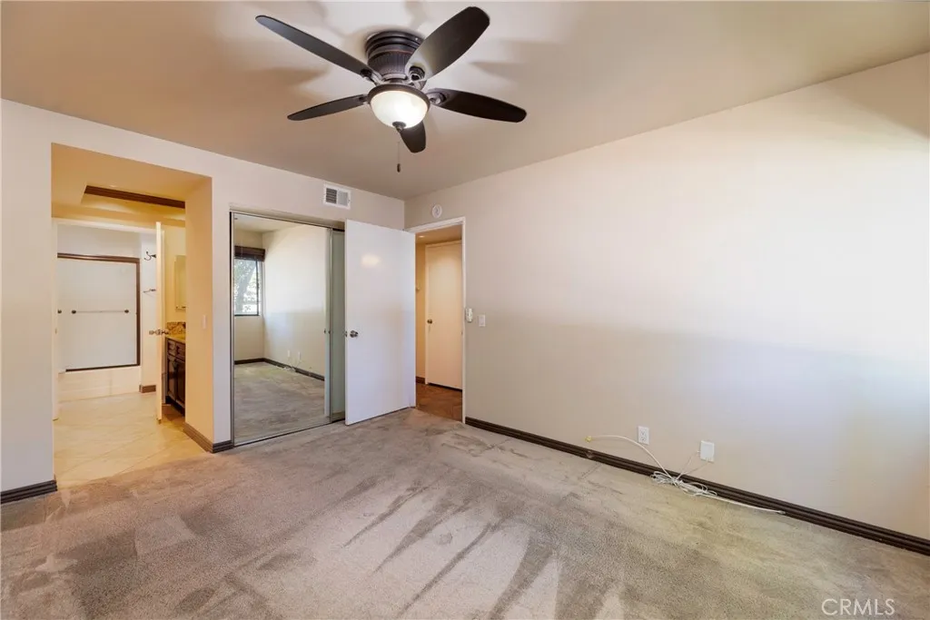 Great location within the popular Landmark+55 retirement community! What makes this location so ideal is the easy access from the garages and the privacy of being in the back of the building next to a large sloped green belt area directly behind the home. Therefore, it is a very quiet location. It is an upper unit but it is ground level with the back of the unit, including a nice patio area that is part of the property. Another important feature is this unit has two garages where typically most units in Landmark only have one garage. This section of Landmark was built in 1981 and has gas connections unlike the units that were built in 1975. The entry has vaulted ceilings with recessed lighting and skylight, creating a nice spacious living room area. The covered patio extends off the living room and is a very private area that enjoys views of the greenbelt. The kitchen and bathrooms have been beautifully updated and both bathrooms have skylights. The primary suite also has two closets. The tile floors in the living room, kitchen and hallway are a special tile designed to not get too hot or cold. Refrigerator, washer and dryer are included in the sale. Landmark is a special community offering a variety of amenities starting with 24/7 guarded security. The large clubhouse offers a variety of different events and activities, supplemented by tennis courts, large pool/spa area, pickleball court, putting green, fitness center, library, etc. Also directly across from La Mirada Golf course and Regional Park.