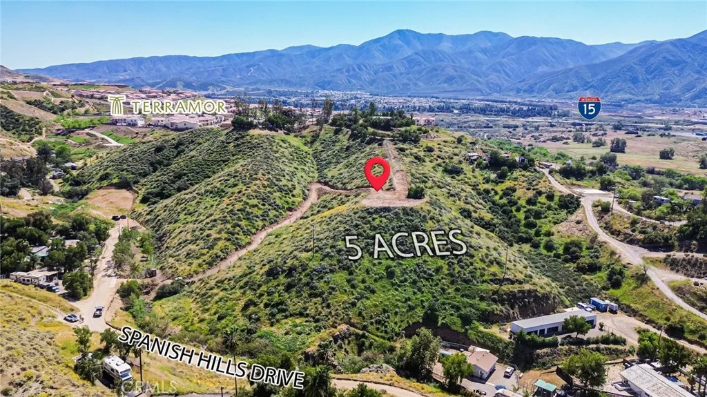 Perched atop a scenic hillside in the highly desirable Temescal Valley area of South Corona, this exceptional 5 acre parcel offers a rare blend of privacy, natural beauty, and prime location. Adjacent to the prestigious Terramor master planned community, home to approximately 1,450 residences, this property presents a unique opportunity to build your dream estate while benefiting from the growth and desirability of the surrounding area. This property is not subject to an HOA, giving you greater flexibility and freedom to design and use the land to suit your vision. Enjoy sweeping views of rolling hills and nearby communities, all while being thoughtfully set apart in a peaceful and serene setting. A gentle stream meanders at the northern edge of the property, creating a peaceful setting where ducks can often be seen gliding across the water. The current owner has already invested in the lands beauty and character, planting over 300 trees including mature olive trees, California pepper trees, and ash trees, along with 20 to 30 varieties of vibrant flowers that add color and charm throughout the landscape. The owner has also cleared vegetation to create a flat building pad measuring approximately 100 feet by 150 feet, totaling about 15,000 square feet. Electricity is already available on the property, and with many neighboring homes nearby, you can enjoy both convenience and a strong sense of community while still maintaining privacy. Conveniently located just 5 minutes from Interstate 15, this property offers easy access to Orange County, Los Angeles, and San Diego, making i