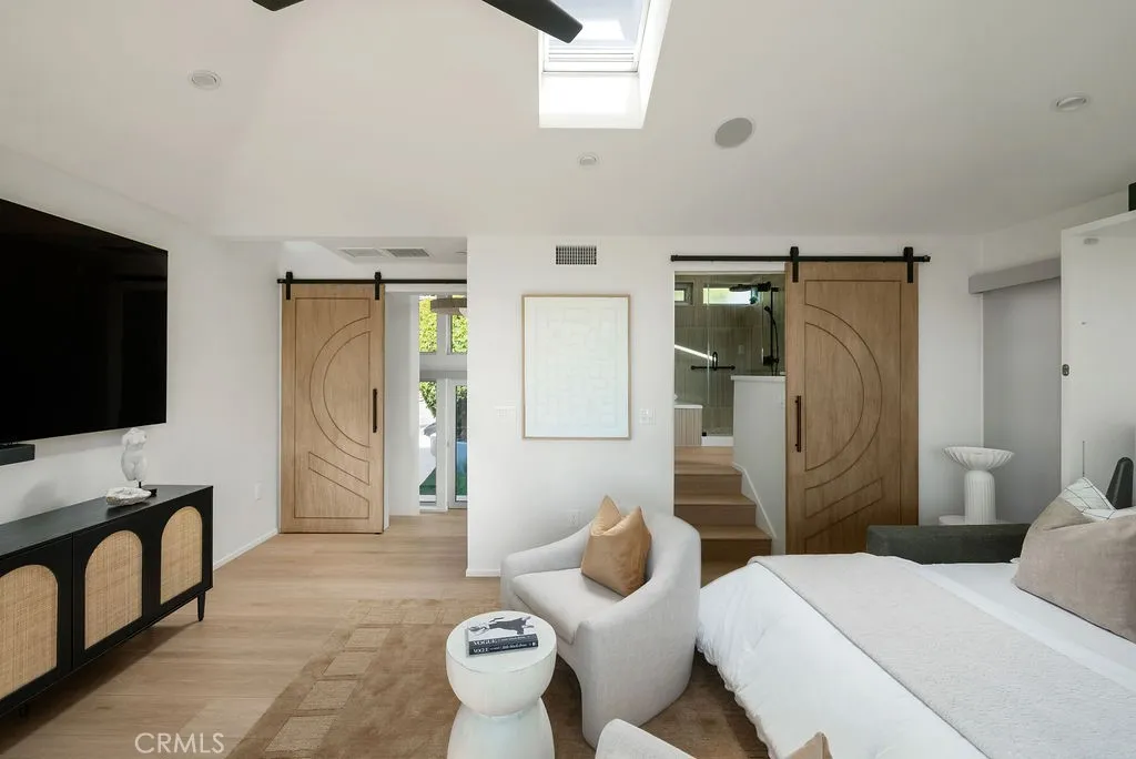 Tucked away on a quiet cul-de-sac just steps from the beach, this beautifully updated home offers the ideal blend of privacy, coastal living, ocean views, and modern design in the heart of South Laguna. The home is thoughtfully designed across multiple levels, emphasizing maximized space, natural light, and functionality. High ceilings, expansive windows, and thoughtful details, such as barn doors and custom built-ins, create a bright, airy feel that lives larger than its footprint. Tall windows and sliding glass doors surround the main living area, creating an inviting atmosphere with a seamless connection to the beautifully landscaped outdoors. A sleek, updated kitchen features a quartz peninsula, high-end appliances, custom cabinetry, and refined finishes, flowing into the living space complete with a statement fireplace, surround sound, Lutron lighting, and motorized blinds. Just off the kitchen, a dedicated laundry and storage room adds everyday convenience. The lower level includes a spacious private guest bedroom with tall glass sliders and windows. The primary suite occupies its own level, offering soaring ceilings, abundant natural light, a beautifully remodeled bath, and stunning ocean views. Perched just above this level, the expansive rooftop deck captures an awe-inspiring panoramic ocean view. This creates the perfect space for entertaining, featuring a built-in weatherproof TV, refrigerator, and retractable awning for year-round comfort and privacy. Additional property highlights include an outdoor shower, central A/C, recessed lighting, a spacious one-car gar