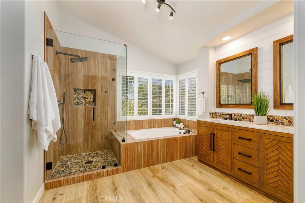Welcome to this beautifully remodeled 4 bedroom, 3 bathroom home with a versatile bonus room off the primary suite, perfect for a nursery, home office, or private retreat. This stunning Warmington Plan I is ideally situated in the highly sought after Northbridge community of Valencia, tucked away on a quiet cul-de-sac with convenient access to scenic paseos, community pools, tennis courts, Helmers Park, and award-winning Charles Helmers Elementary School. Thoughtfully updated, this move-in-ready home features modern finishes throughout, including new flooring, refreshed bathrooms, fresh interior and exterior paint, and a new stovetop and microwave. The inviting layout blends comfort and style, making it perfect for both everyday living and entertaining. Step outside to a low-maintenance backyard designed for gatherings, complete with a built-in bar, BBQ, refrigerator, fire pit, and ambient lighting. Enjoy the added charm of mature palm trees along with apricot and apple trees, offering fresh fruit right from your own yard. The spacious three car garage provides exceptional storage with custom cabinetry, built-in shelving, and an overhead loft for larger items. Additional upgrades include a newer roof, garage door opener, hot water heater, updated interior lighting, and pre-wiring for a hot tub in the backyard. This exceptional home combines modern upgrades, thoughtful features, and a prime location ready for you to move in and enjoy. Welcome home to 23609 Wilmington Court!