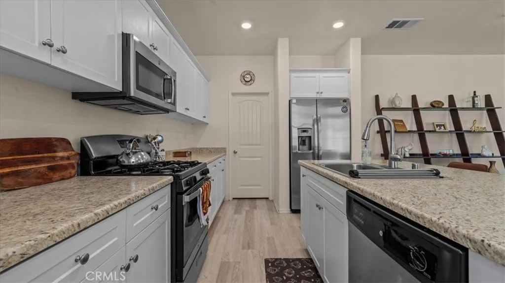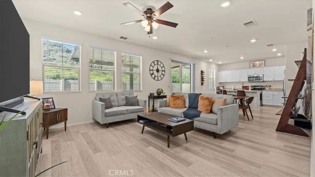 Welcome to this beautifully maintained 3-bedroom, 2.5-bathroom home offering modern design, clean lines, and an inviting open-concept layout perfect for everyday living and entertaining. The bright and spacious main level features a seamless flow between the living room, dining area, and a well-appointed kitchen with white cabinetry, stainless steel appliances, and a large island with bar seating, all enhanced by abundant natural light and stylish flooring throughout. Upstairs, youll find generously sized bedrooms, including a serene primary suite with a private bath and walk-in closet, along with well-positioned secondary bedrooms. The home also offers a convenient upstairs laundry area, recessed lighting, and an attached 2-car garage. Step outside to a private backyard with direct access from the main living space, offering the perfect setting for relaxing, entertaining, or enjoying the peaceful hillside views behind the home. With its thoughtful layout and move-in-ready condition, this home is a standout opportunity.