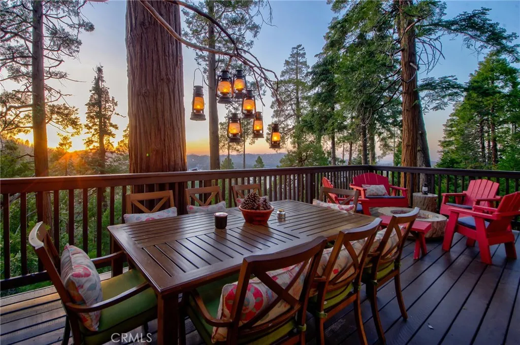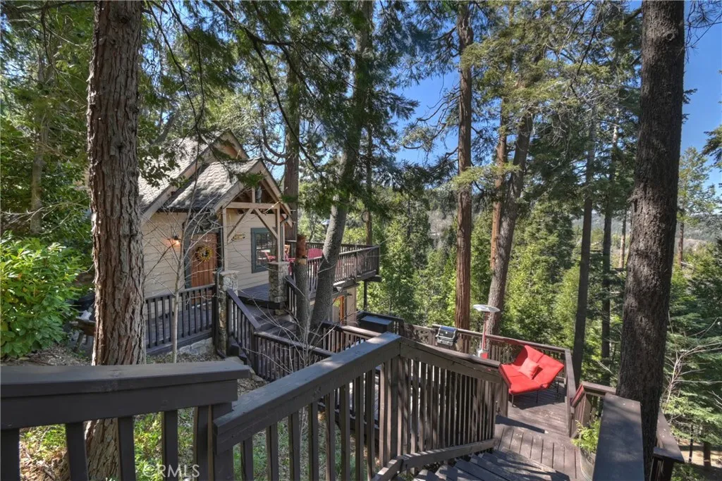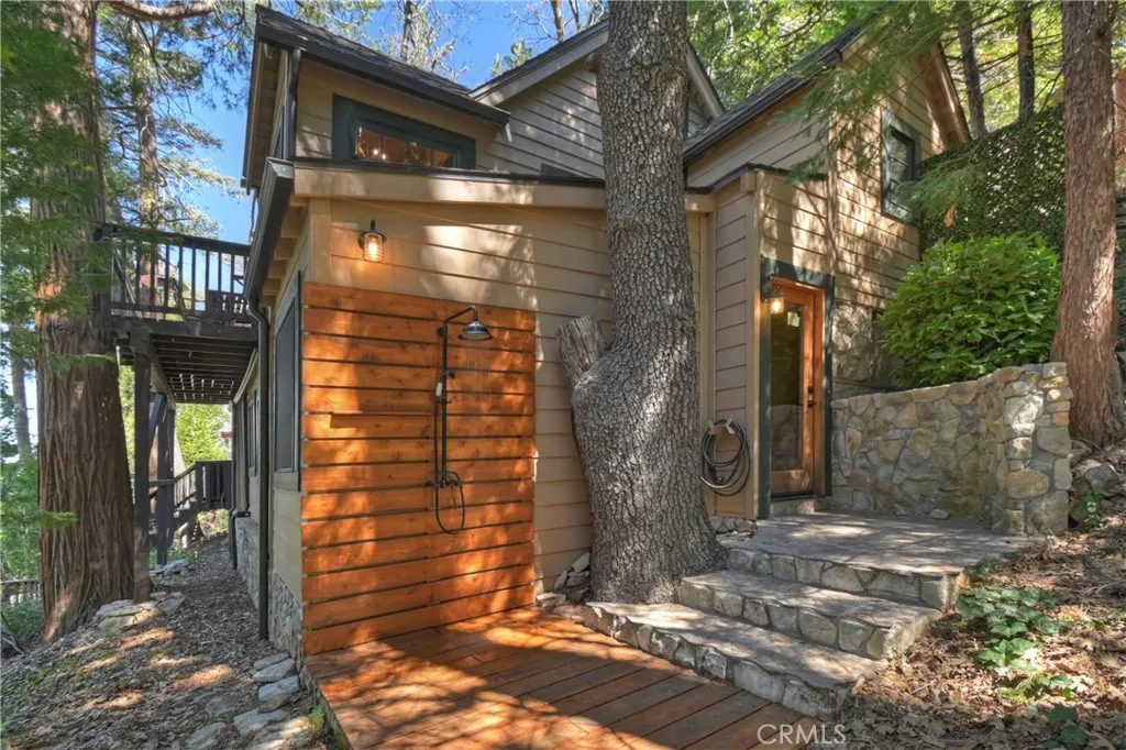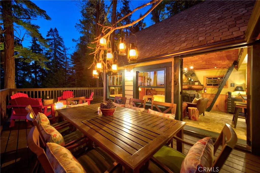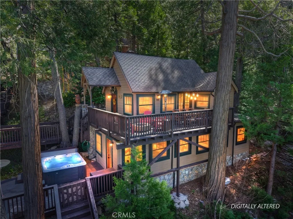 Step into a piece of Lake Arrowhead history with this charming and storied 1924 cabin, rumored to have once served as the hideout of a local bootlegger during the days of Prohibition ~ Today, this one-of-a-kind retreat has been thoughtfully refurbished in 2021, blending historic charm with stylish modern updates. Tucked away on the remote and exclusive southeast side of Lake Arrowhead, this cozy cabin offers a rare sense of seclusion while still being within reach of everything the mountain has to offer ~ Youll find approximately 1,000 square feet of gated deck space designed for outdoor living and entertaining ~ Enjoy the year-round hot tub spa, BBQ area, and fire pit while taking in breathtaking lake views and unforgettable sunset skies ~ The upper deck offers one of the most captivating vantage points of the lake, while fall brings a spectacular display as nearby maple trees turn vibrant shades of gold and crimson ~ On the 4th of July the night sky will come alive ~ Inside, the architect-owner infused the cabin with thoughtful design elements that complement its historic roots with a rustic tin ceiling in the kitchen, a farmhouse sink, and modern industrial lighting create a warm yet refined mountain aesthetic ~ The home is adorned with local mountain artwork, vintage photographs, and curated antiques that add character throughout ~ Relax and unwind in the copper clawfoot tub beneath a large skylight, where you can soak while gazing up at the treetops and star lit skies ~ In warmer months, enjoy the private outdoor cedar shower surrounded by pines for a true mountain ret