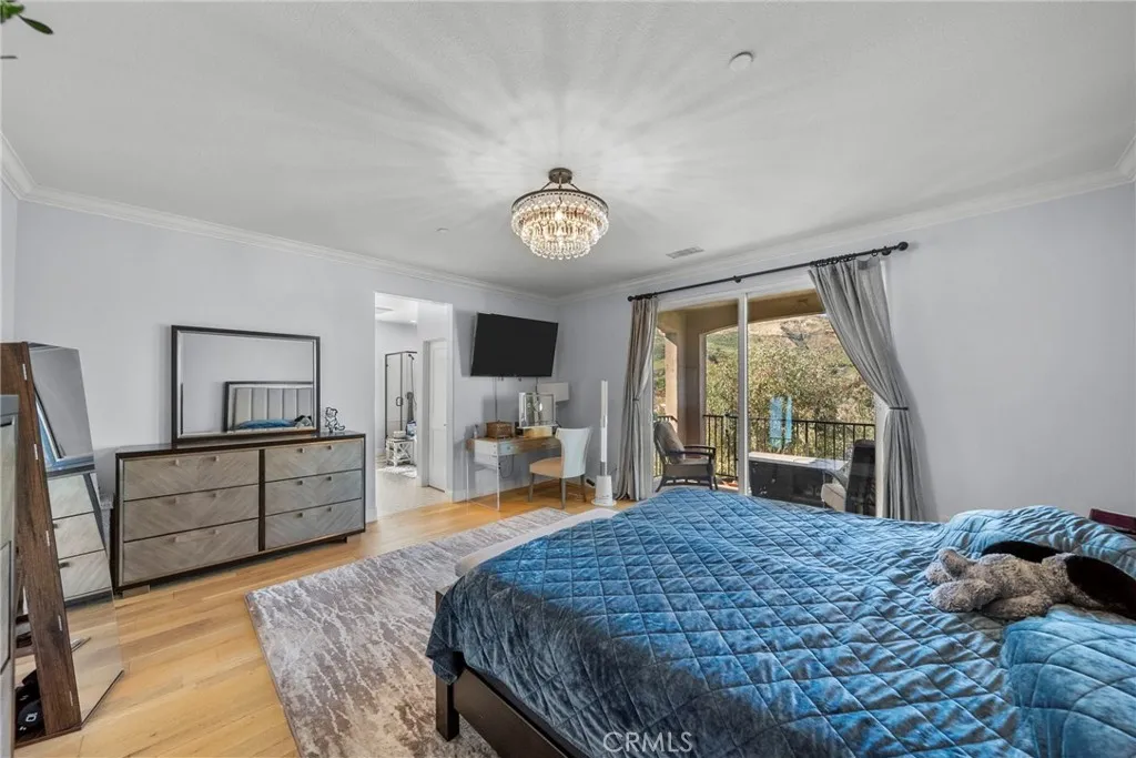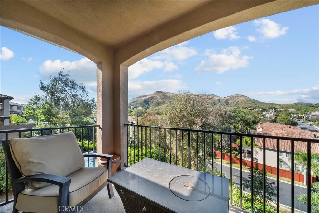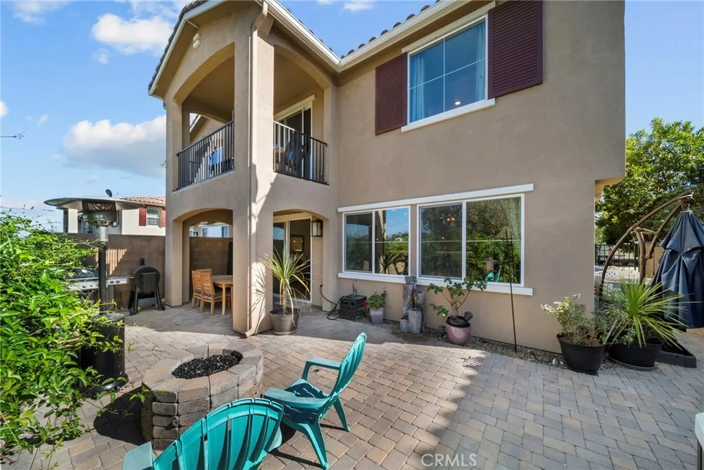 Amazing, move-in ready home in the highly sought-after Wood Ranch community, offering breathtaking views of Mount McCoy and surrounding hillsides. This beautifully upgraded residence showcases French Farm Wood flooring throughout, designer finishes, and an open-concept layout built for everyday living, serenity and entertaining. The centerpiece of the home is a stunning oversized kitchen island featuring a stainless steel sink, seating for six, and four elegant pendant lightsperfect for hosting and gathering. The gourmet kitchen also includes white shaker cabinetry, quartz countertops, designer backsplash, multiple pantry spaces, and high-end stainless steel appliances. The spacious family room is filled with natural light and highlighted by a cozy gas fireplace, enhanced with additional recessed LED lighting throughout the home. Sliding doors lead to a wrap around yard with one of the most private outdoor spaces in the communitya low-maintenance backyard with pavers, lush greenery, and stunning mountain views. Designed for true California indoor-outdoor living, the yard features an outdoor gas fireplace, above-ground spa, and multiple areas to relax or entertain. The flexible floor plan includes a highly desirable downstairs bedroom with a full bath, ideal for guests or multi-generational living. Upstairs, the expansive loft with custom built-in cabinetry offers a perfect space for a media room, office, or game room, with the option to convert to an additional bedroom. The spacious laundry room is upstairs and thoughtfully designed with a sink, cabinetry, and additional st
