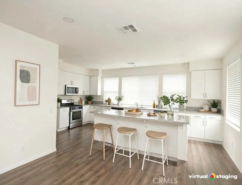 Welcome to 8276 Celestial Avenue in the gated Aldea Walk community. This beautifully maintained end-unit townhome offers 1,652 sq ft, a desirable tri-level layout, and direct access to a rare 3-car tandem garage. The open-concept great room is filled with natural light from windows throughout the home and features wood-laminate flooring and a built-in entertainment niche. The spacious kitchen includes a large center island, granite countertops, stainless steel appliances, wraparound cabinetry, and a reach-in pantry. The top level features a private primary suite with French doors leading to a private balcony, plus a walk-in closet and ensuite bath. Two additional bedrooms, a full hallway bath, and an upstairs laundry area provide comfort and convenience. Enjoy an expansive front patio and the large grass picnic area with BBQ station located directly in front of the home, with a second BBQ area also available in the community. Additional features include whole-house water-softener piping, kitchen water-filter hookups, recessed lighting, and custom window treatments. All within minutes of The Source OC, Portos Bakery, Knotts Berry Farm, schools, parks, restaurants, and the 5 and 91 freeways. Move-in ready and located in one of Buena Parks most desirable gated neighborhoods. Disclaimer: Some photos have been virtually staged to help illustrate potential furniture layout and room use.