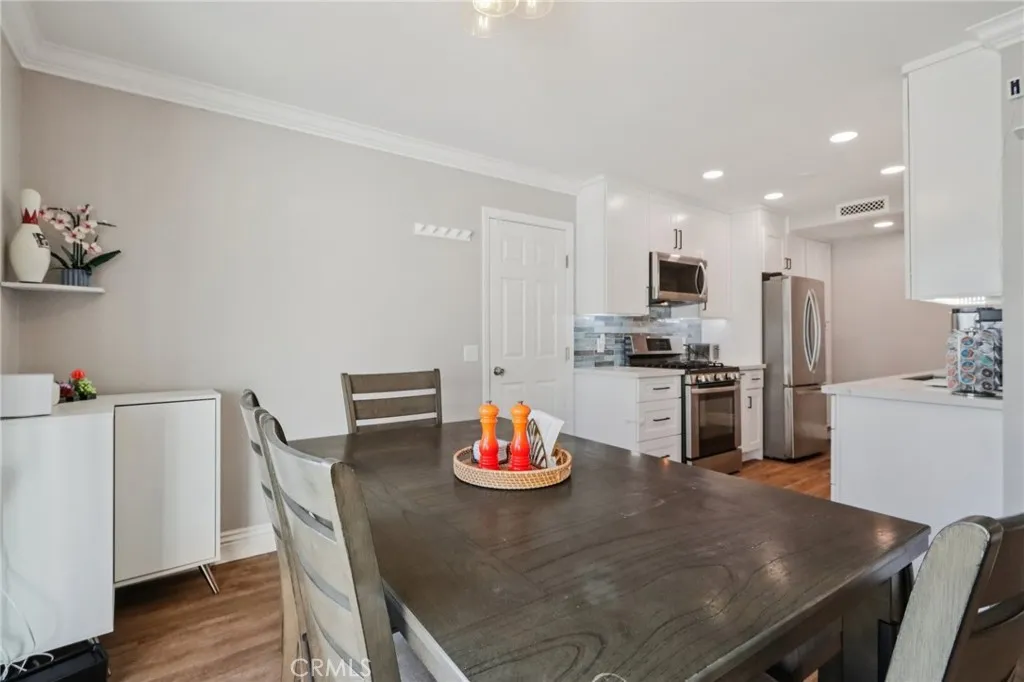Welcome to 22944 Via Pimiento, a beautifully updated 3 bedroom, 1.5 bathroom condo in the desirable Aliso Villas community with no one above or below. This thoughtfully improved home offers a functional and inviting layout with all bedrooms located upstairs, including a stunningly remodeled full bathroom featuring a tub/shower combination. The spacious primary bedroom includes a walk in closet and direct access to the upstairs bathroom, creating a comfortable and private retreat. Downstairs, the open concept living space seamlessly connects the living room, dining area, and a tastefully remodeled kitchen complete with shaker cabinets, quartz countertops, stainless steel appliances, and a stylish tile backsplash. A recently updated half bathroom adds convenience for guests, while new luxury vinyl plank flooring enhances the entire lower level. Crown molding, recessed lighting, dual pane windows, and fresh interior paint within the last few years add a refined and well maintained feel. Sliding glass doors lead to a private patio, perfect for relaxing or entertaining. Enjoy direct access from the unit into your attached one car garage, offering both convenience and privacy, along with ample storage and private laundry hookups, plus an additional reserved parking space conveniently located right in front of the home. Comfort and efficiency are top of mind with a brand new Carrier HVAC system along with newly installed ducting, as well as a new water heater. The HOA has recently replaced the water lines within the unit, providing an additional level of confidence for future owne
