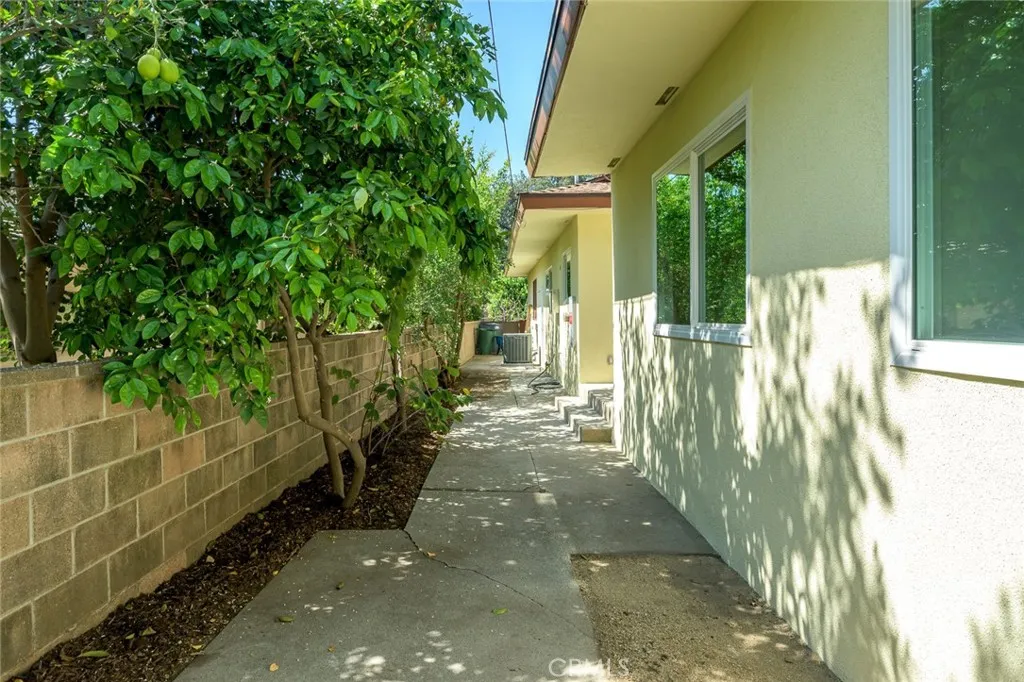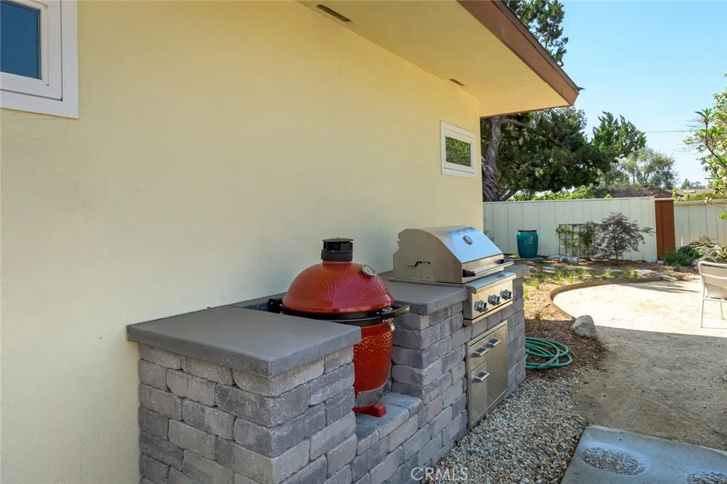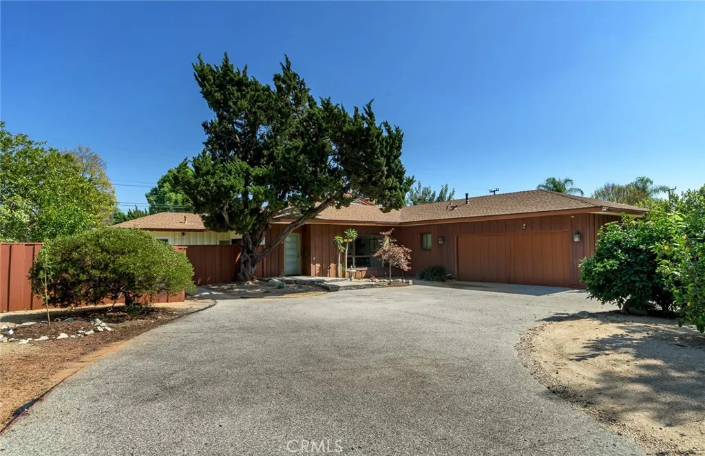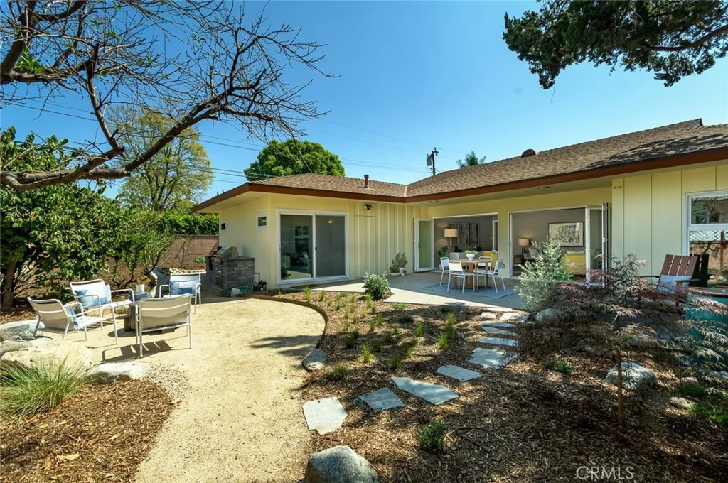 Sprawling single-story ranch with a large circular driveway set on a picturesque tree-lined street. Thoughtfully designed with a well-balanced floor plan, the scale of the house feels spacious and comfortable. Just past the formal entry, the living room is ideal for indoor-outdoor living, featuring two large folding glass doors that almost make the entire wall disappear, providing a seamless transition to the newly landscaped backyard. There are two dining spaces, including the formal dining room with a picture window with views to the large front yard. A welcoming family room with fireplace, distinctive mid-century built-in shelving, and a skylight flows with the kitchen while still providing enough separation. The brand-new kitchen is beautifully appointed with quality custom solid wood cabinetry, abundant storage, quartz countertops, high-end appliances, a built-in mini entertainment cabinet, and a cozy breakfast nook with bench seating. Each of the bedrooms are ample including the primary bedroom with an attached bath and new sliding glass doors to the back yard. The backyard is designed for both relaxing and entertaining, with multiple patios, fresh landscaping, a corten steel fire pit, an outdoor cooking area featuring a premium Delta Heat BBQ and a Kamado charcoal grill/smoker, a fountain, and an impressive collection of 47 fruit trees. The seller has invested approximately $400,000 in upgrades over the past two years, reflected throughout the home. Additional improvements include new interior paint, double pane windows and doors, newly refinished original hardwood f