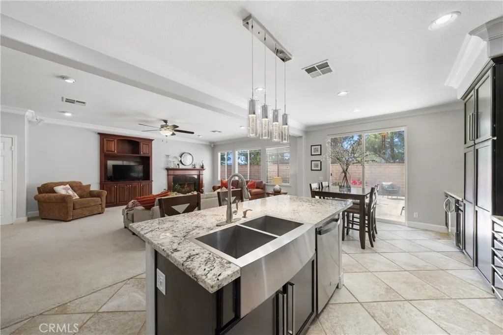 Welcome to your dream homewhere style, comfort, and entertaining come together beautifully! This stunning single-story home in Crowne Hill features a show-stopping, fully upgraded kitchen and an open-concept layout designed for effortless living and unforgettable gatherings. At the heart of the home is the entertainers dream kitchen, showcasing White Galaxy granite countertops, a spacious island with seating for five, custom cabinetry with elegant rainwater glass doors, and a striking glass subway tile backsplash. Enjoy all-new matching KitchenAid stainless steel appliances, including the refrigerator, along with a gas cooktop, designer stainless hood, double ovens, beverage refrigerator, and champagne-glow pendant lighting that adds the perfect touch of warmth and sophistication. The kitchen flows seamlessly into the inviting family room, complete with a cozy fireplace, built-in media center, and surround sound speakersideal for movie nights or hosting guests. In addition, the oversized living roomcurrently set up as a Pilates studiooffers incredible flexibility and space, making it perfect for large gatherings, celebrations, or whatever fits your lifestyle best. Step outside to your private, low-maintenance backyard oasis featuring a covered lanai, ample patio space for dining and BBQs, and outdoor surround sound to keep the good times going. Throughout the home, youll find beautiful travertine tile and neutral carpeting that complement any style. The luxurious primary suite offers a private foyer entry, spa-inspired ensuite with dual sinks, granite countertops, soaking t