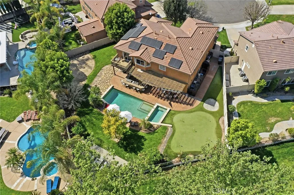 Positioned on a cul-de-sac overlooking the 15th tee of Redhawk Golf Course, this tastefully upgraded residence offers a refined blend of comfort, design, and lifestyle. The backyard is designed as a private retreat, ideal for both entertaining and everyday enjoyment. A custom putting green with sand trap, outdoor kitchen with built-in BBQ and bar seating, and an oversized fire feature create a resort-style setting. Mature fruit trees, including orange, apple, and lemon, along with thoughtfully placed landscape lighting, add both charm and ambiance. Inside, a redesigned floor plan creates an open concept living and entertaining space with a focus on both functionality and flow. The kitchen is beautifully appointed with custom cabinetry, quartz countertops, and a suite of premium appliances, including Sub-Zero, Wolf, and Miele. The adjacent family room features a sleek linear fireplace, illuminated built-ins, and integrated media, offering a space that is both elevated and comfortable. The main level includes a private office and powder room, with the office offering flexibility to serve as an additional bedroom. Upstairs, the primary suite offers a peaceful retreat with hardwood flooring, a custom built-in dresser, and a private balcony overlooking the golf course. The spa-inspired primary bath features dual vanities, a walk-in shower, and a spacious custom closet. Secondary bedrooms are well-appointed with custom closet systems and ceiling fans, with one bedroom offering its own en suite bath, ideal for guests or multigenerational living. An additional upstairs bonus room o