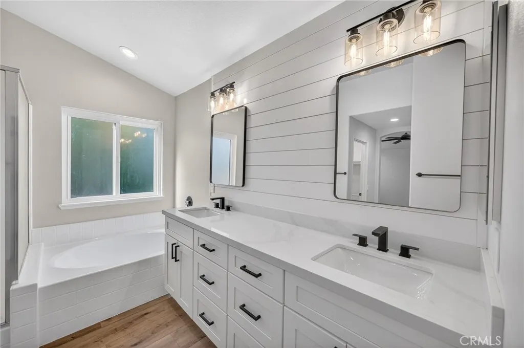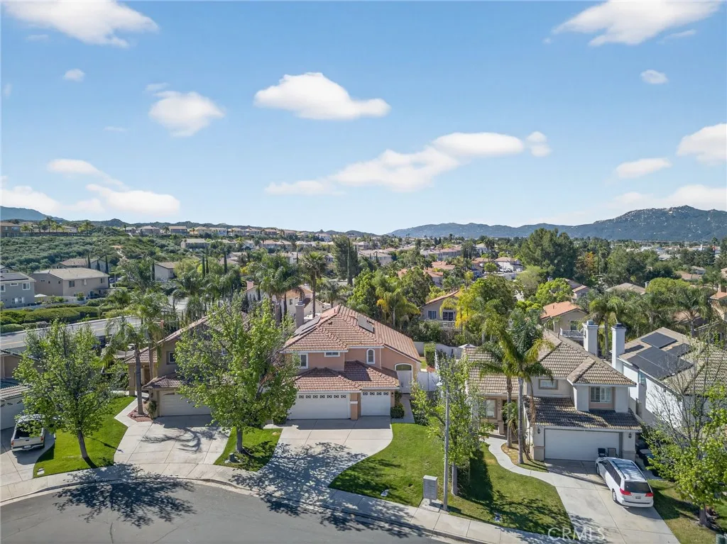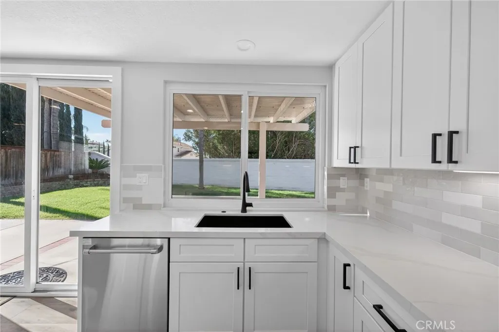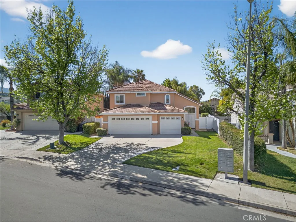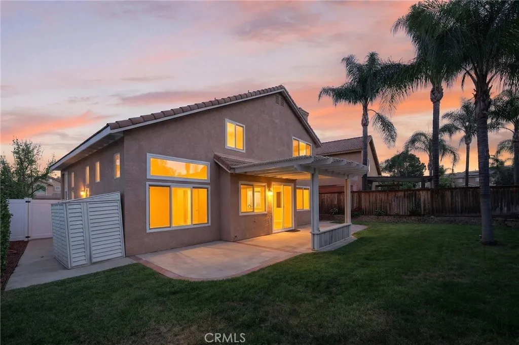 Welcome to Corte Sanchez, a fully renovated 4-bedroom, 3-bathroom two-story home on a cul-de-sac in Temecula, CA 92592. This 2,261-square-foot Spanish-style residence features upgrades throughout, a three-car garage, and a manicured front lawn with standout curb appeal. The interior was rebuilt with designer finishes featuring luxury vinyl plank flooring on both levels, fresh neutral paint, recessed lighting, and a consistent black matte hardware package from room to room. The formal living and dining area opens to a soaring vaulted ceiling with a chandelier and an open staircase featuring wood-tone treads and white painted balusters. The family room connects to the kitchen and includes a tile-surround fireplace with built-in cabinetry, dual ceiling fans, and a sliding glass door leading directly to the covered patio. The kitchen is fully updated with white shaker cabinets, quartz countertops, linear tile backsplash, black undermount single-basin sink, black hardware, and stainless steel appliances and a window overlooking the backyard pergola. The secondary bathroom features a shiplap accent wall, round black-framed mirror, marble-look quartz vanity, black matte fixtures, and a tub/shower combo. The primary bath includes a dual-sink quartz vanity, shiplap feature wall, two rectangular black-framed mirrors, and black matte faucets. All five bedrooms feature luxury vinyl plank flooring, ceiling fans, and closets. The backyard delivers a full-width pergola, generous concrete patio with brick accent border, lush grass lawn, multiple mature palm trees, and block wall privacy fe