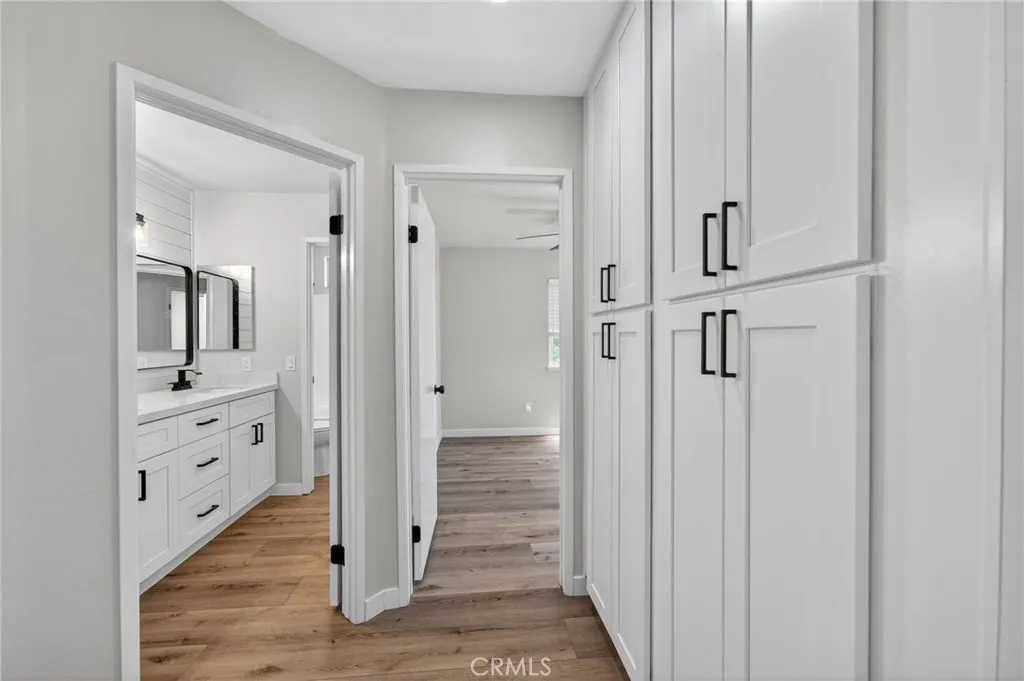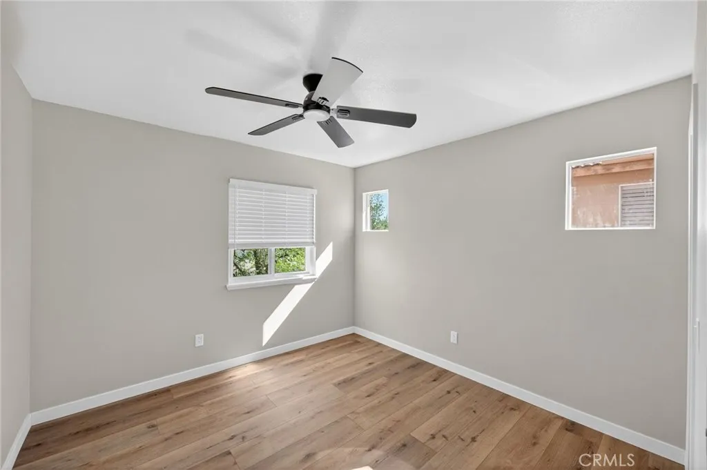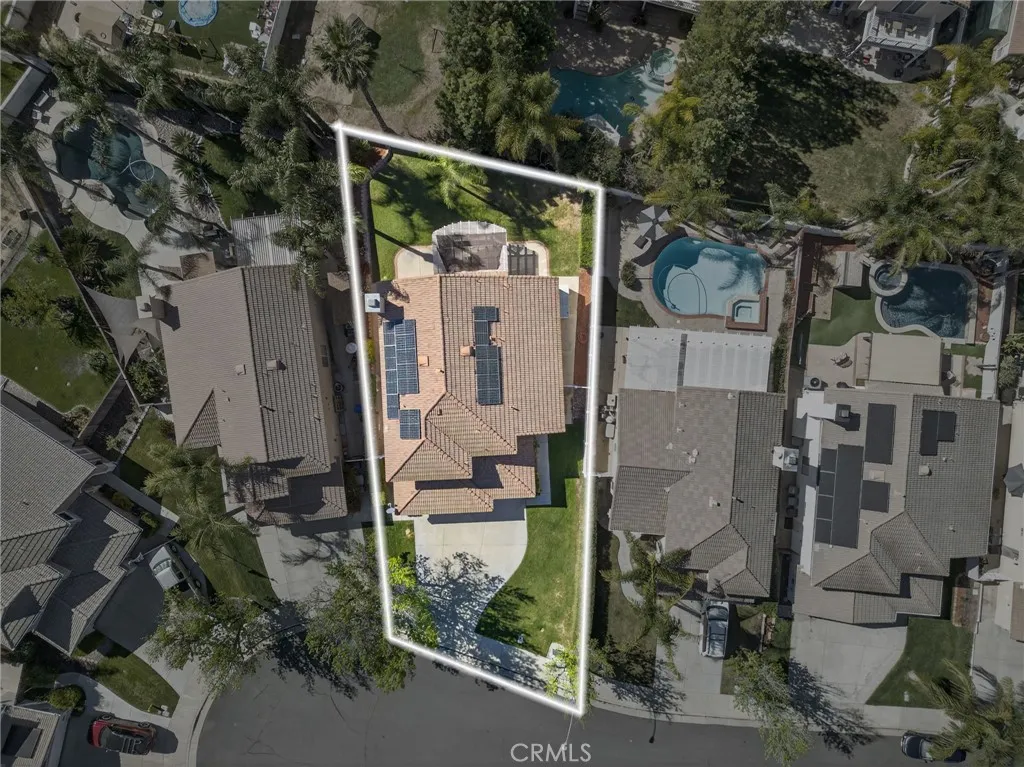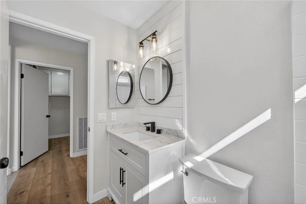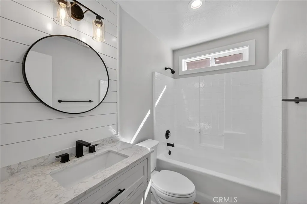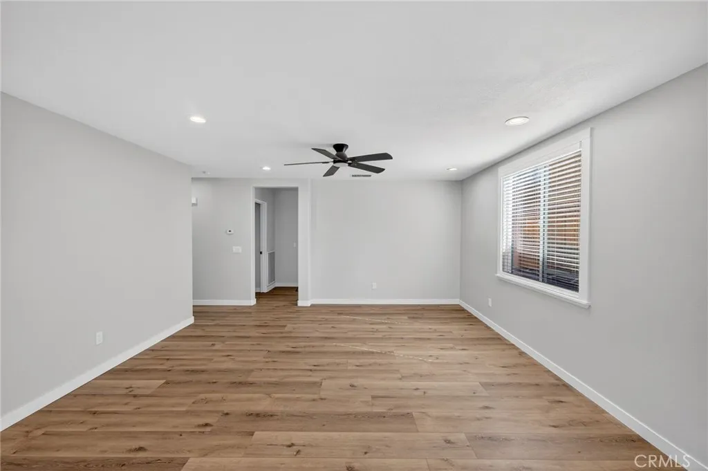 Welcome to Corte Sanchez, a fully renovated 4-bedroom, 3-bathroom two-story home on a cul-de-sac in Temecula, CA 92592. This 2,261-square-foot Spanish-style residence features upgrades throughout, a three-car garage, and a manicured front lawn with standout curb appeal. The interior was rebuilt with designer finishes featuring luxury vinyl plank flooring on both levels, fresh neutral paint, recessed lighting, and a consistent black matte hardware package from room to room. The formal living and dining area opens to a soaring vaulted ceiling with a chandelier and an open staircase featuring wood-tone treads and white painted balusters. The family room connects to the kitchen and includes a tile-surround fireplace with built-in cabinetry, dual ceiling fans, and a sliding glass door leading directly to the covered patio. The kitchen is fully updated with white shaker cabinets, quartz countertops, linear tile backsplash, black undermount single-basin sink, black hardware, and stainless steel appliances and a window overlooking the backyard pergola. The secondary bathroom features a shiplap accent wall, round black-framed mirror, marble-look quartz vanity, black matte fixtures, and a tub/shower combo. The primary bath includes a dual-sink quartz vanity, shiplap feature wall, two rectangular black-framed mirrors, and black matte faucets. All five bedrooms feature luxury vinyl plank flooring, ceiling fans, and closets. The backyard delivers a full-width pergola, generous concrete patio with brick accent border, lush grass lawn, multiple mature palm trees, and block wall privacy fe