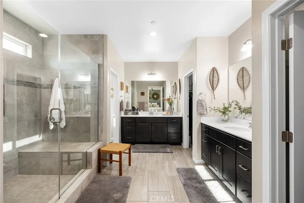 Beautifully upgraded 5-bedroom, 3.5-bath executive home located on a quiet cul-de-sac in highly sought-after Spencers Crossing, just minutes from the Oasis Pool. This spacious 3,411 sq ft home features an open-concept kitchen with quartz counters, ceramic stone backsplash, pendant lighting, soft-close drawers, stainless steel appliances, and a vented pyramid cooktop. The great room offers dual 12-foot sliding glass doors and upgraded finishes throughout. Downstairs includes a private bedroom, with glass French doors. Additional upgrades: luxury vinyl plank flooring on the first floor, plantation shutters throughout, upgraded stair railing, and paneled interior doors. The oversized primary suite boasts a walk-in closet, en-suite bath with walk-in tiled shower, dual vanities, and added privacy door. Upstairs includes a spacious loft, 3 secondary bedrooms, and a laundry room with sink and added shelving. Low-maintenance backyard with extended patio cover and a stock tank poolperfect for summer. Home includes PAID solar, whole-home water softener, and a 3-car garage. Spencers Crossing offers pools, parks, walking trails, and top-rated schools. Move-in ready!