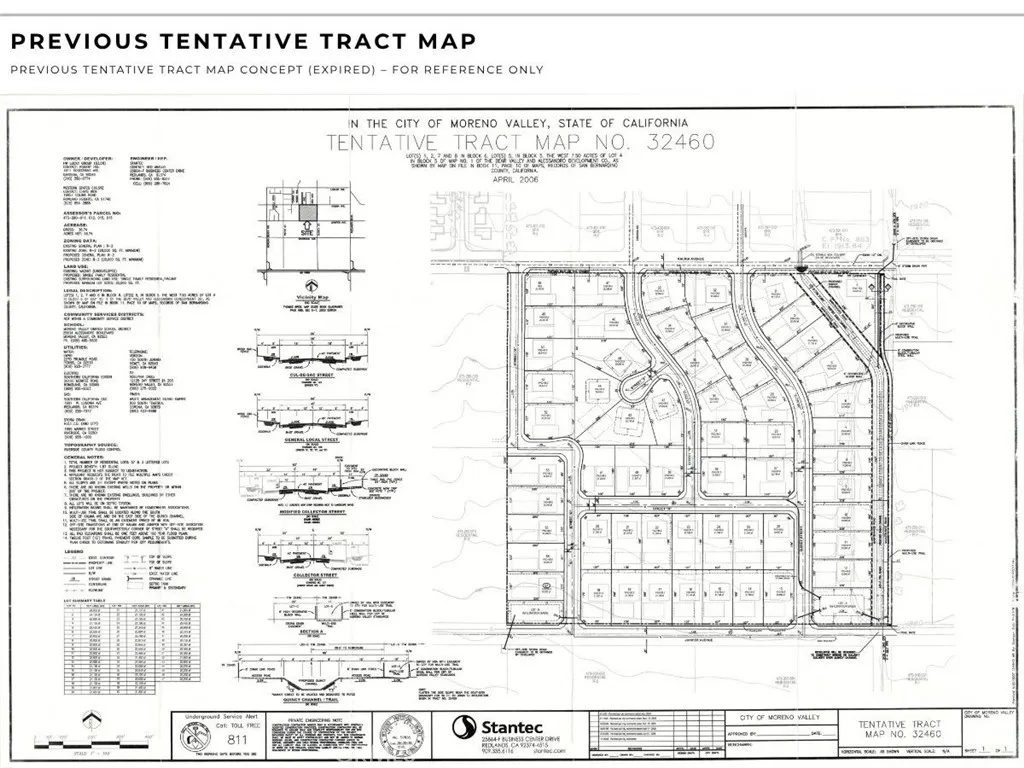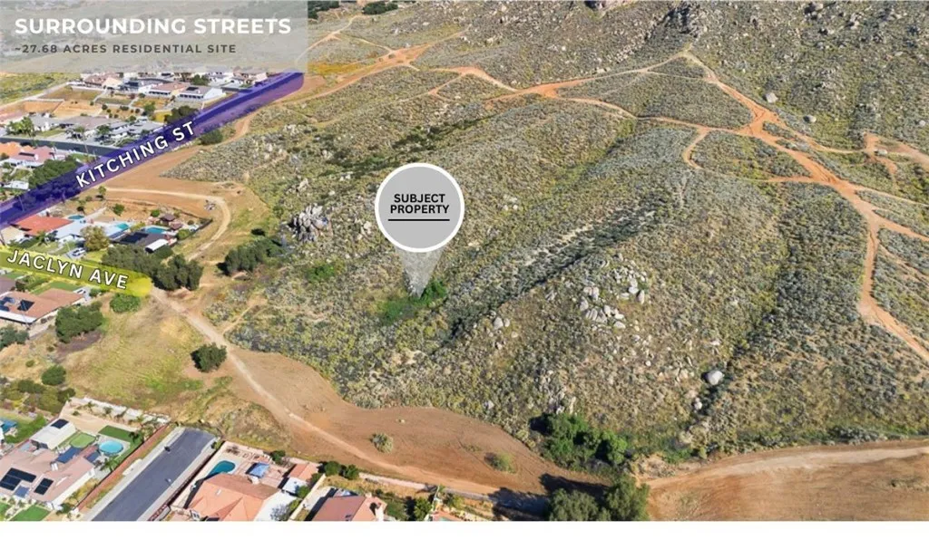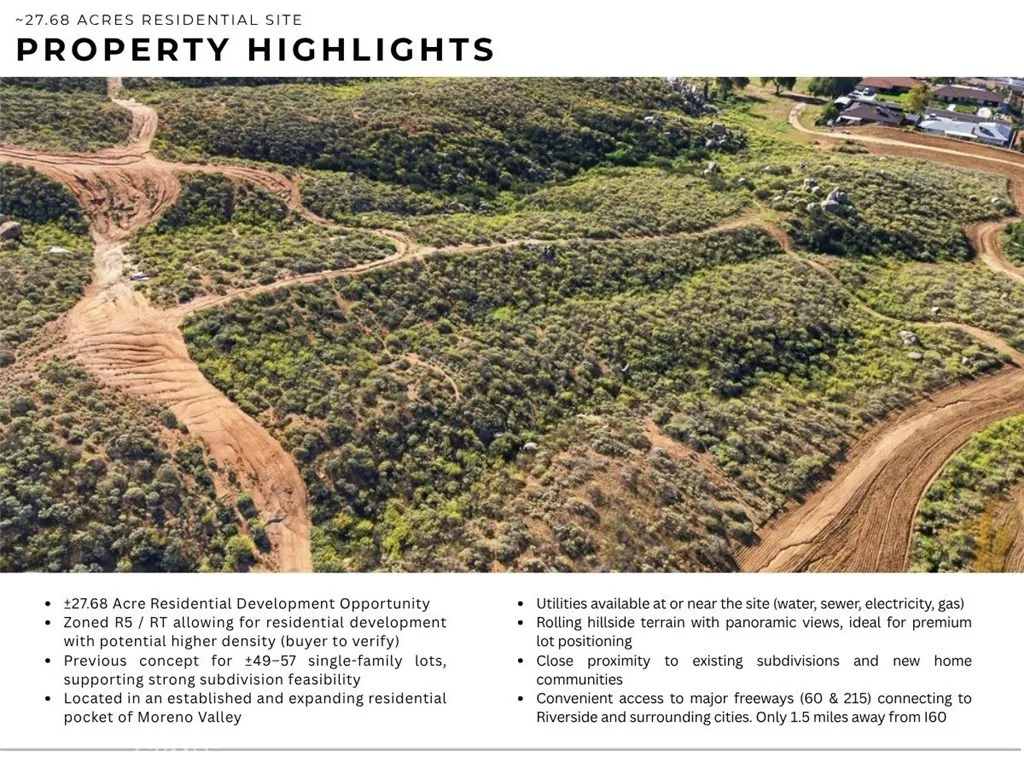 Exceptional residential development opportunity in Moreno Valley. This 27.68 acre parcel is ideally located east of Kitching St and north of Jaclyn Ave within an established and expanding residential area. Zoned R5 (Hillside Residential), allowing for single-family residential development (buyer to verify with the City). Previous development concepts indicate the potential for approximately 4957 single-family residential lots. The site features rolling hillside terrain with natural drainage channels and offers potential for scenic views. Surrounding properties include existing residential communities, providing strong context for future development. Utilities including water, sewer, electricity, and gas are near the site. A future project would require standard off-site improvements and infrastructure typical for development of this scale. Located within the growing Inland Empire region, the property benefits from strong housing demand and proximity to major transportation corridors including the i60 that is 1.5 miles away and the 215 freeways, as well as nearby schools, retail, and employment centers. Due diligence materials available include prior tentative tract maps, topographic survey, environmental information, and preliminary development concepts. No assigned street address. Property is identified by APN 474-100-025. Buyer to verify all information including zoning, utilities, development potential, and permitted uses with the City of Moreno Valley and applicable agencies.