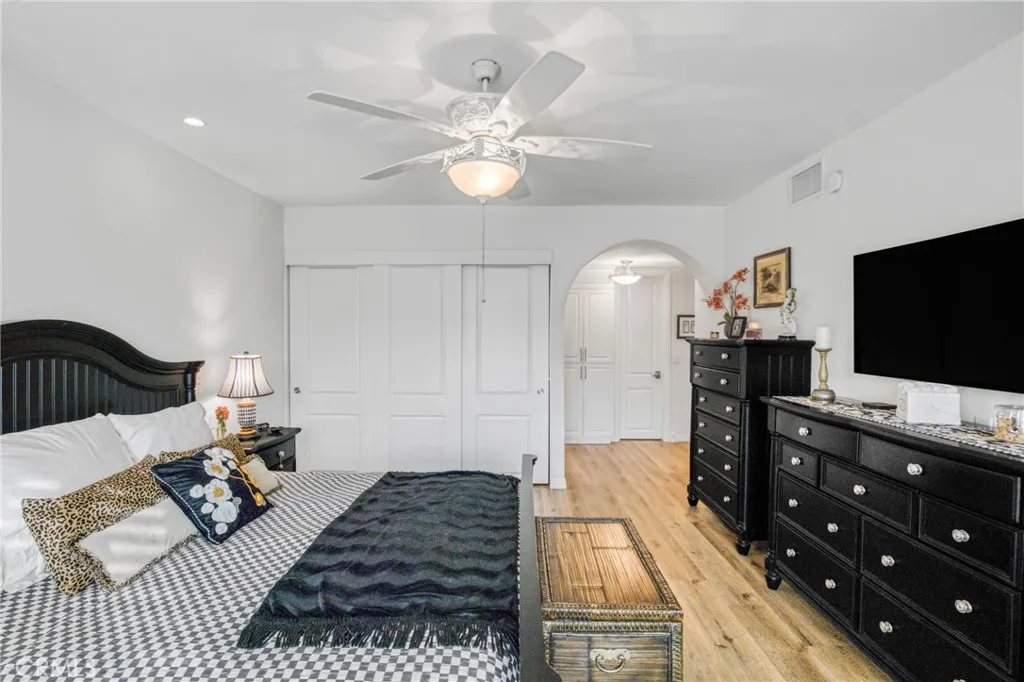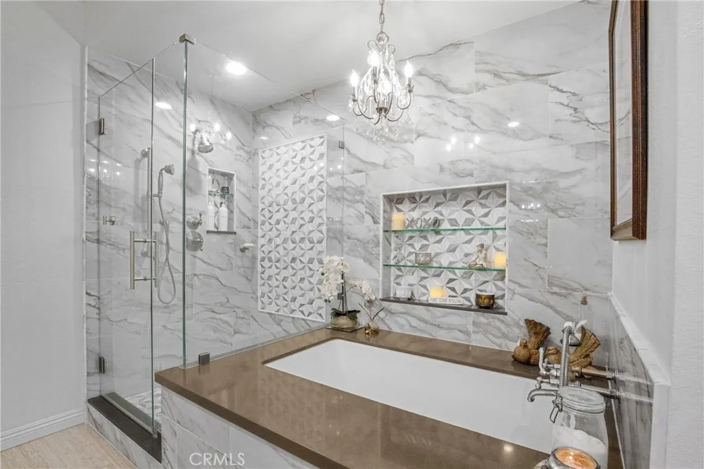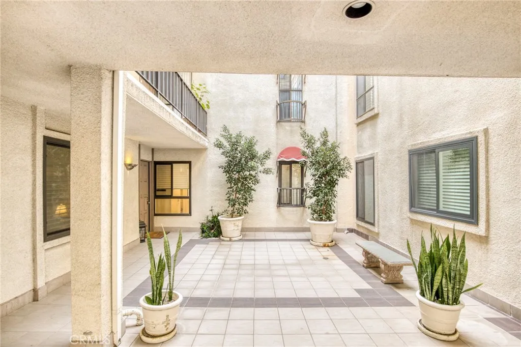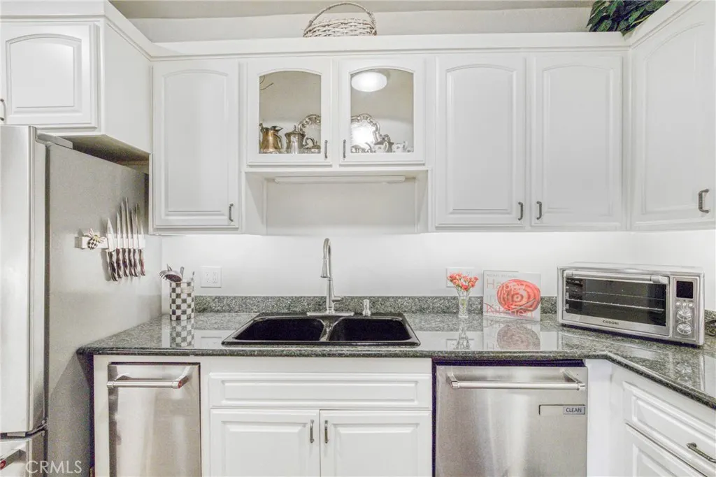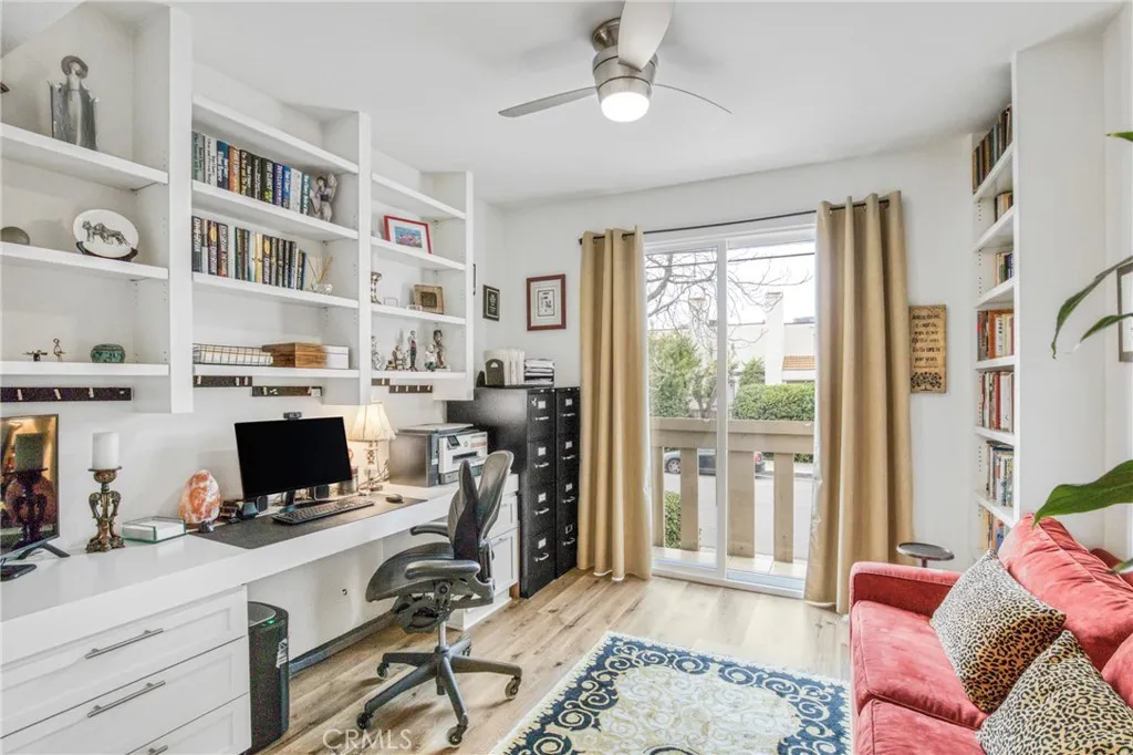 Welcome to Encino Spa South - This beautiful 2 bedroom 2 bath updated condominium is turnkey, generously sized, west facing, single-story and has only one shared wall. Features include a fabulous granite kitchen with Kitchen-Aid stainless steel appliances, breakfast area, coffee bar or desk area, and a newer stackable washer and dryer unit. Adjacent to the kitchen is a formal dining area that overlooks the living room and opens to the main balcony. The oversized primary suite with balcony is complete with plantation shutters, walk-in closet, large bypass closet, and both closets are equipped with organizers. There is also a floor to ceiling custom cabinet with adjustable shelves. The luxurious primary resort-style bathroom has a deep soaking tub, separate shower, and a custom-made vanity with a quartz counter. The guest bedroom (currently being used as an office) has a large built-in desk area and bookcase. Other special highlights include, LED recessed lighting, rich looking luxury vinyl flooring, custom window treatments in the living room, kitchen, hall and primary bathroom, interior doors that were replaced using precision-measured technology, and all windows and sliding doors were also replaced. The complex has secured parking, meandering walkways, community pool, spas, gym, sauna, rec room and guest parking. The HOA fee covers the maintenance for the amenities, water, reduced internet/cable/phone service and earthquake insurance. The unit has two tandem parking spots in the most convenient location and a private lockable storage cage. The property is conveniently loca