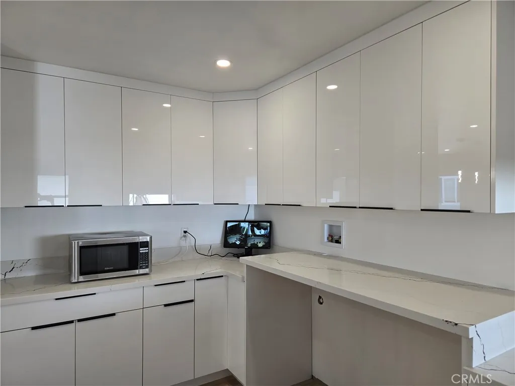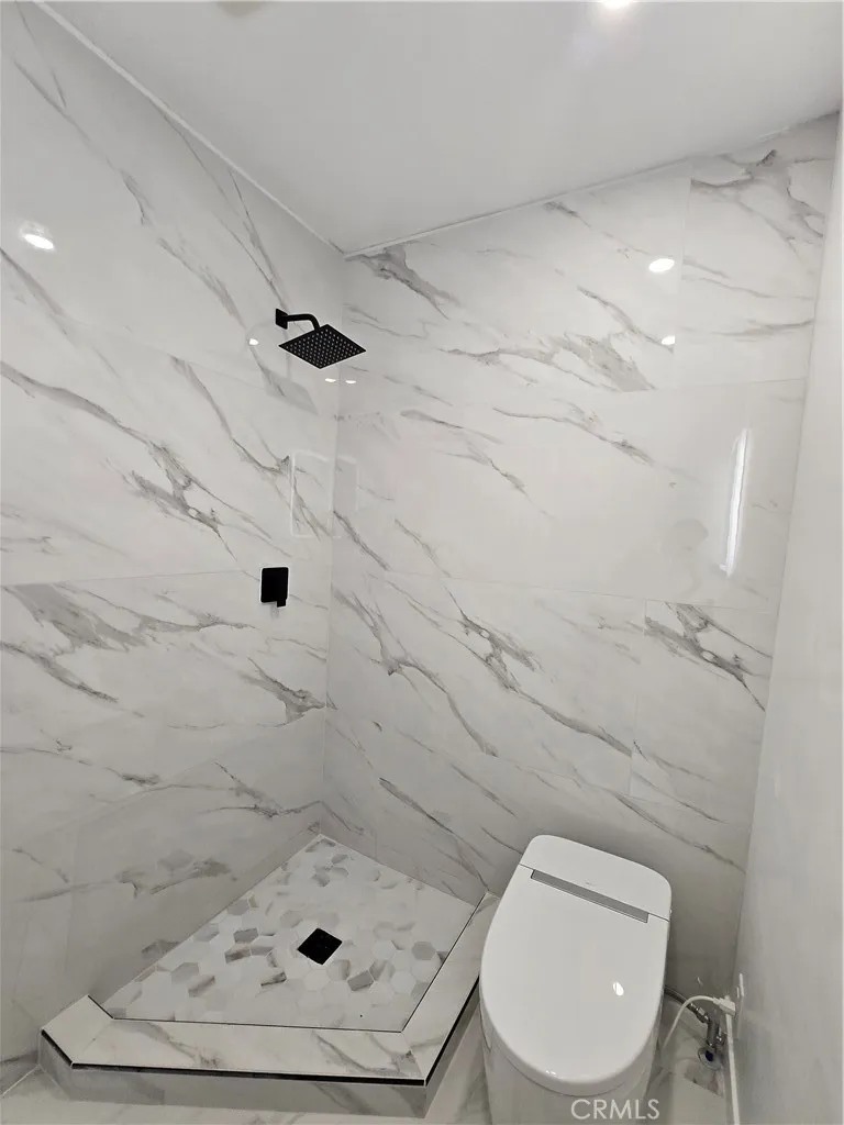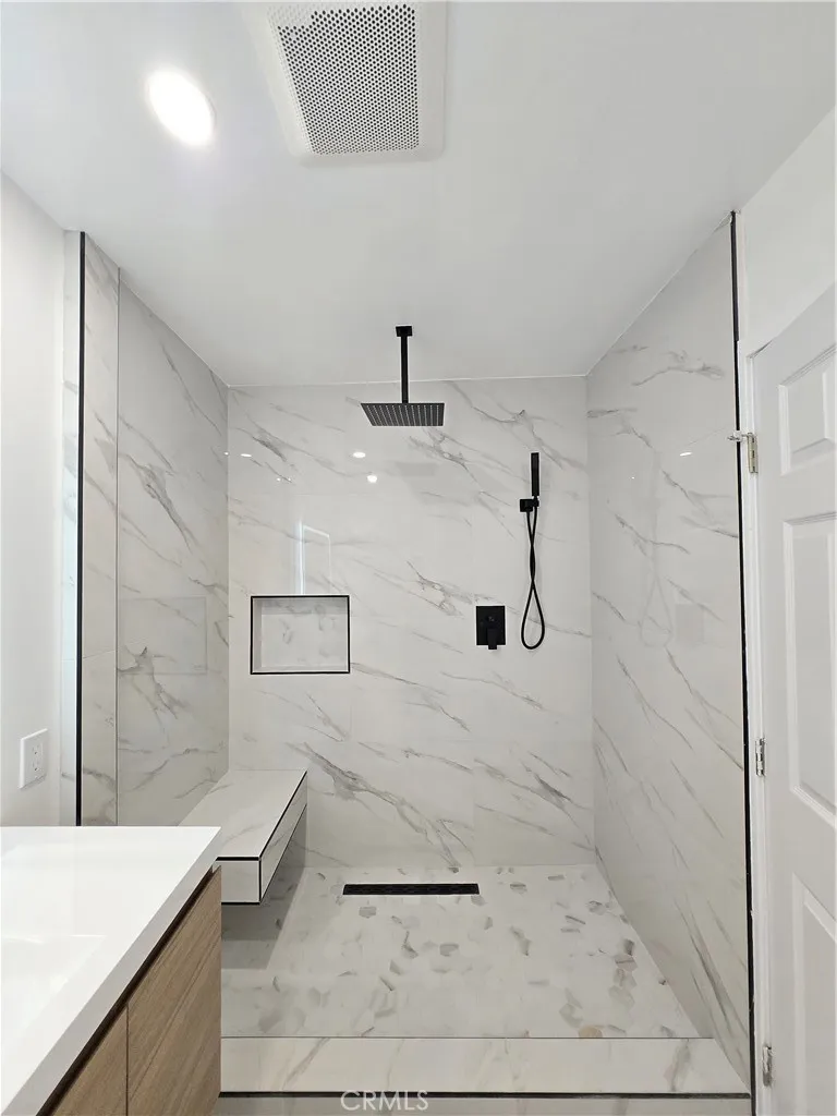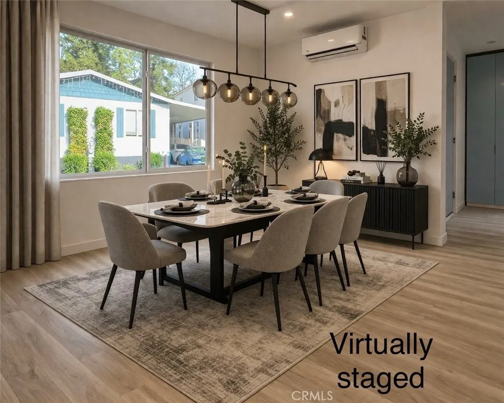 This is your chance to own a meticulously crafted, move-in-ready home where you own your land fee simple! Nestled in the highly desirable Top of Topanga, this beautifully upgraded 3-bedroom, 3-bathroom home offers the perfect blend of modern comfort and smart living .The open-concept living area is perfect for both entertaining and relaxation, featuring built-in ceiling speakers that set the tone for any occasion. Natural light floods the dining area, seamlessly connecting to a stunning contemporary kitchen. Designed for both style and functionality, the kitchen boasts a sleek quartz island peninsula, glossy white cabinetry with Cosmo stainless steel appliances, making it a chefs dream. The primary suite is a serene retreat, filled with natural light and complemented by a spacious walk-in closet. The spa-inspired primary bath is a true sanctuary, featuring a dual floating vanity with anti-fog LED mirrors, black fixtures, a freestanding soaking tub, and a walk-in shower with a rain shower head, handheld spray pressure and a built-in bench, all finished in sophisticated large-format tile for a clean, modern aesthetic. The second bedroom has a generous closet space with it's own private bathroom with a walk-in shower, floating vanity and anti-fog LED mirror. while the third bedroom is bright and inviting with it's nice closet and easy access to the third bathroom, that features a floating vanity, LED mirror and a tile shower. The laundry area has its own free standing sink complemented with quartz countertops and glossy white cabinetry. This manufactured home has a newer roof,