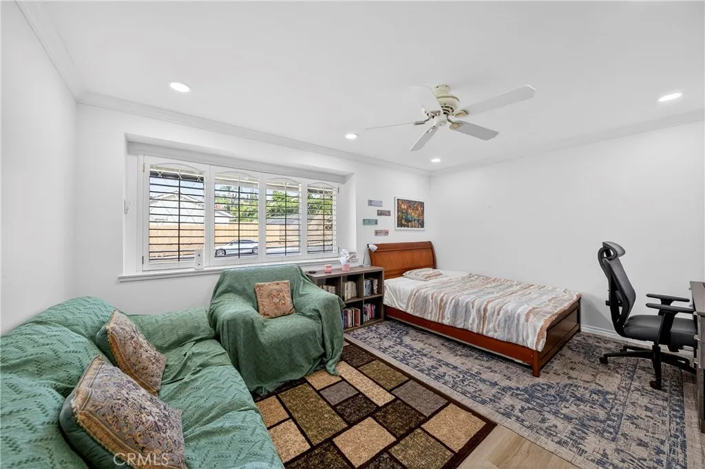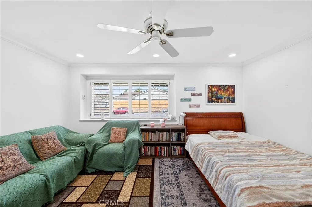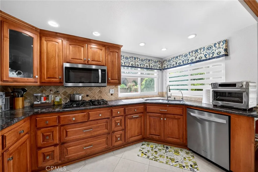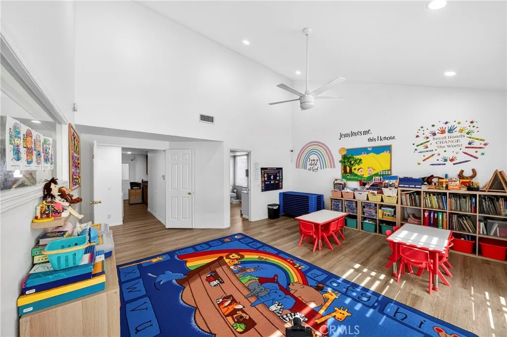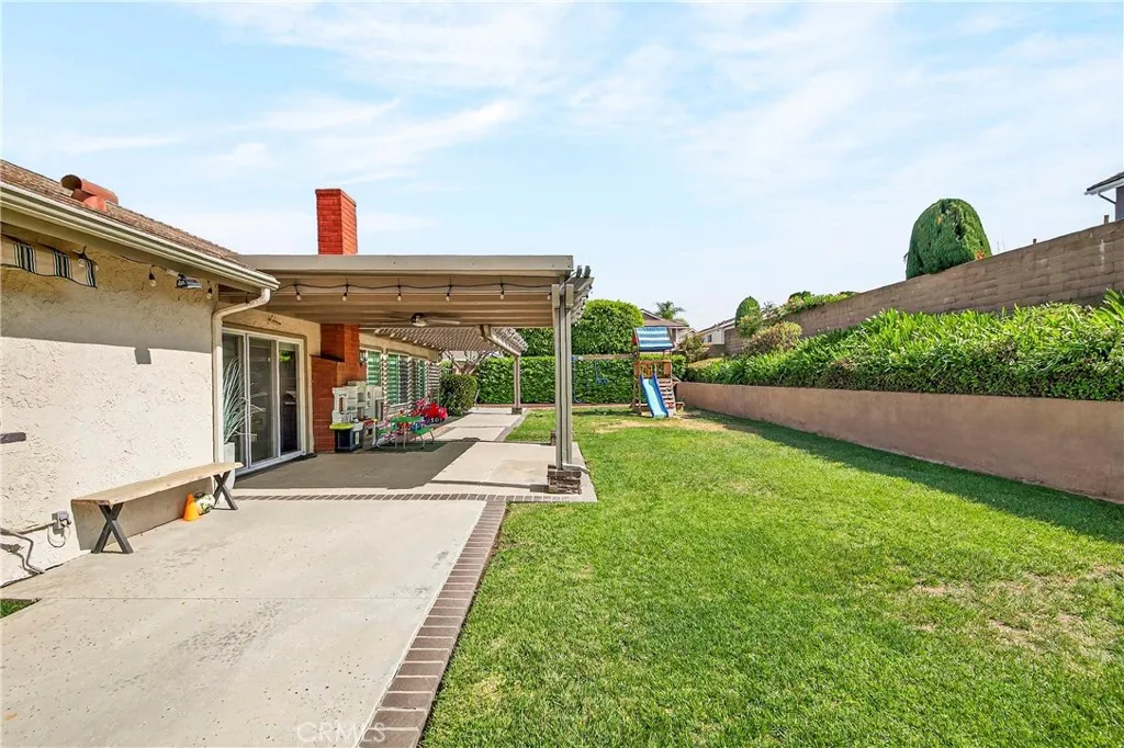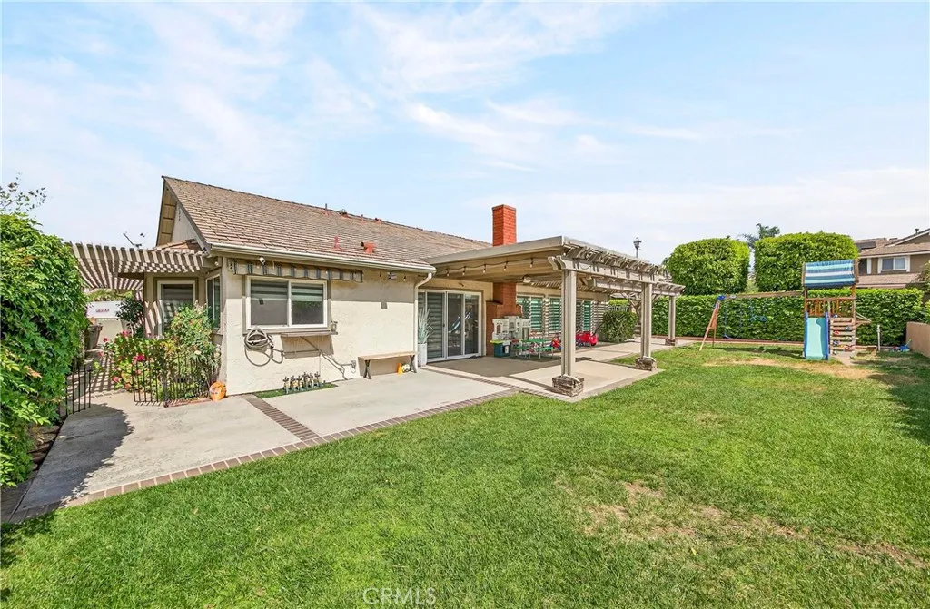 This exceptional single-story home in the highly sought-after Eagle Hills community offers a rare blend of comfortable living and business potential, perfectly suited for operating a home daycare. Situated on an expansive corner lot, the property features gated RV parkingideal for additional space, storage, or flexible use. A charming stone walkway and private gated front patio create a warm, welcoming entry. Inside, the home opens to bright, airy living spaces enhanced by soaring ceilings, dual-pane vinyl windows, and a striking marble-faced fireplace that anchors the formal living areas. The remodeled kitchen is both stylish and functional, featuring rich wood cabinetry, granite countertops, a stainless steel sink with built-in washing racks, black appliances, and an entire wall of pantry storageperfect for keeping both household and daycare essentials organized. A sunny breakfast nook overlooks the lush, landscaped yard, creating a cozy space for meals, activities, or small group learning. Flowing seamlessly from the kitchen is the family room, complete with vaulted ceilings, built-in cabinetry, and sliding glass doors that open to the backyardproviding easy indoor-outdoor access, ideal for supervised play and outdoor activities. The spacious primary suite offers a private retreat with double-door entry, vaulted ceilings, direct backyard access, and a luxurious bathroom featuring marble finishes, dual sinks, a soaking tub, separate shower, and a large cedar-lined walk-in closet. Recent upgrades include fresh interior paint, updated plumbing, dual-pane windows, an aluminu