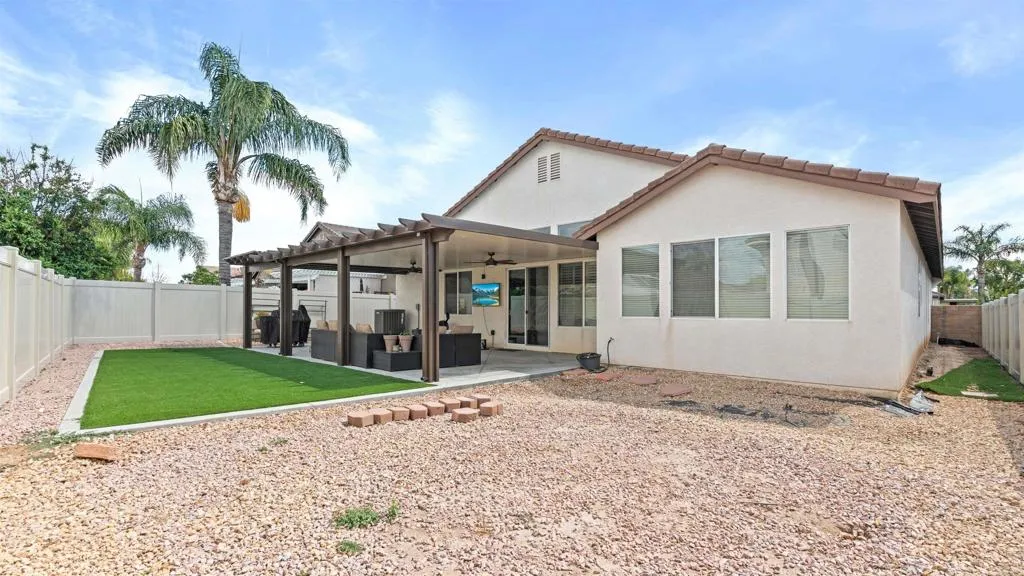 Step into modern luxury with this meticulously updated, single-story retreat in the heart of Menifee. This 4-bedroom, 2-bathroom home boasts over 2,500 sq. ft. of light-filled living space , characterized by soaring vaulted ceilings and stylish, contemporary flooring throughout. The open-concept layout seamlessly connects the formal living area to a spacious family room , anchored by a stunning central fireplace. Culinary enthusiasts will love the kitchens sleek quartz counters, large island, and charming breakfast nook. The primary suite offers a peaceful getaway with a walk-in closet and direct backyard access. Both bathrooms feature high-end, modern finishes for a spa-like feel. Outside, the private yard is an entertainers dream, featuring a massive covered patio and a lush grass area. Bonus features include a leased solar system for energy efficiency and a spacious 3-car garage.