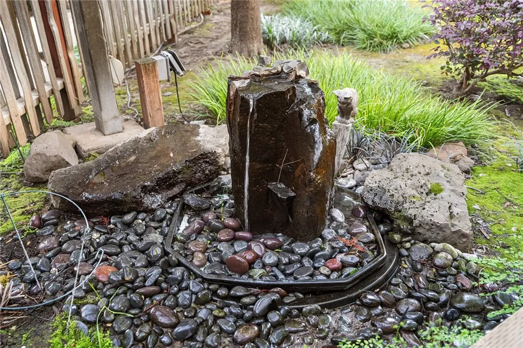 Step through a custom-crafted front door and into a sense of tranquility in this beautifully maintained 3-bedroom, 2.5 bath home plus office, thoughtfully designed with elements that create a serene and calming atmosphere. Built in 1980, this home offers a functional layout featuring a spacious living room, formal dining room, and well-appointed kitchen. The interior is designed for comfort and ambiance with dimmer switches throughout allowing you to create the perfect lighting for any mood. The kitchen is both practical and inviting, featuring convenient pull-out drawers for easy organization and access. The primary suite features a walk-in closet and direct access to the backyard. Outdoors, the property truly shines. Enjoy a peaceful retreat with a meticulously manicured yard, complete with stunning Japanese maples, a Zen garden, and water fountains and sculptures that promote relaxation. The outdoor sculptures and water fountain are beautifully illuminated in the evening, creating the perfect ambiance. The landscape is thoughtfully designed with a drip irrigation system throughout, ensuring easy maintenance and year-round care. Entertain or unwind under the screen-covered patio, surrounded by Trex decking and tranquil garden views. With its own private patio access, the primary suite offers added flexibility and a sense of privacy while still being seamlessly connected to the main outdoor living space. Enjoy peace of mind with recent upgrades, including a newer HVAC system (2023) and a recently serviced septic system (pumped six months ago). This home also features a who