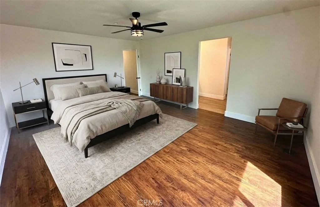 Beautifully updated home located in the Sierra Lakes Golf Community with NO HOA!! Spacious corner lot two-story house has 5 bedrooms and 2.5 bathrooms, open floor plan with new interior and exterior paint, laminate wood flooring throughout, and all new windows with lots of natural light. The main level includes a convenient downstairs bedroom, an updated half bathroom along with a laundry room. Has a separate dining area, remodeled kitchen featuring updated cabinetry, quartz countertops, a stylish backsplash, and under-cabinet lighting, has recessed lighting throughout the home. Upstairs has 4 bedrooms and 2 updated bathrooms, Master bathroom with a walk in closet, central air conditioner and heating. Attached 2-car garage, and a spacious backyard with a gazebo and kids playsetgreat for entertaining or relaxing outdoors. Centrally located within walking distance to major shopping centers, restaurants, Chase bank, and Lowes hardware store, just minutes from the 210 freeway, Costco and nearby schools. A must see!!