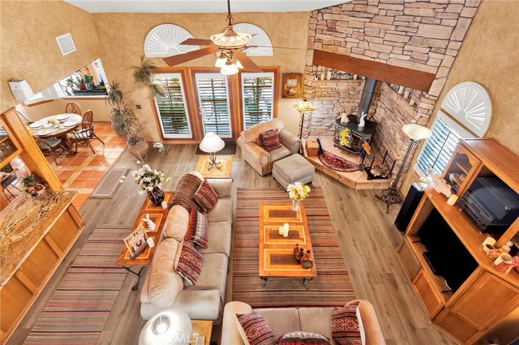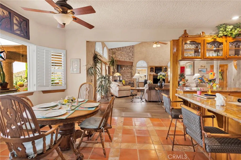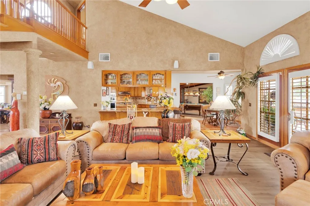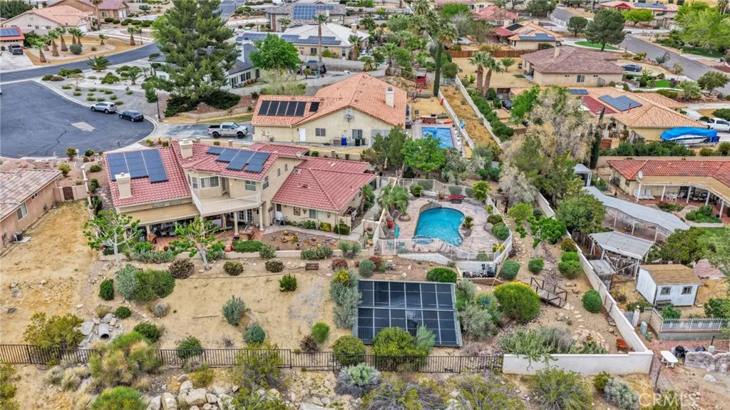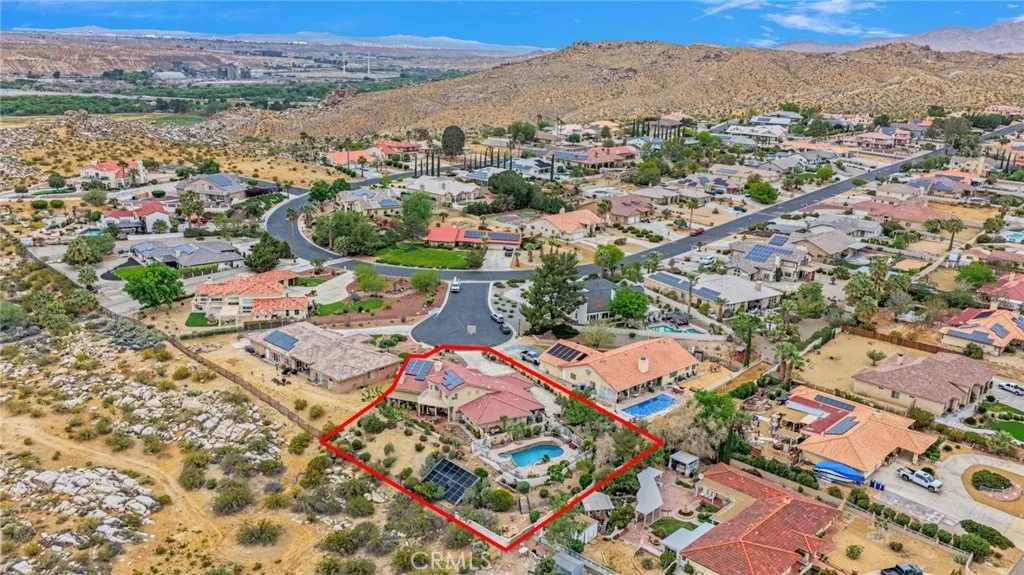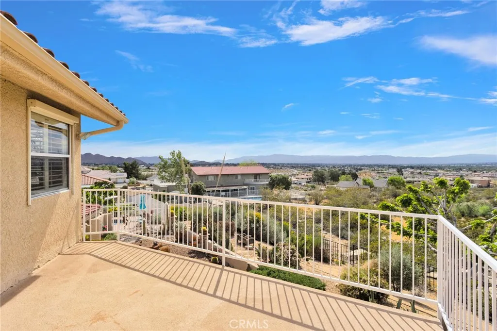 New on the Market in the Exclusive Gated Community of Ridge Estates in Apple Valley! This stunning home offers breathtaking city lights and mountain views and is ideally situated at the end of a quiet cul-de-sac on an oversized -acre lot. Featuring 4 bedrooms, 3.5 bathrooms, this home showcases a unique Southwest-inspired interior with textured painted walls and warm, inviting design elements throughout. The spacious game room with a wet bar is perfect for entertaining, while the open-concept layout seamlessly connects the living spaces. The modern kitchen is truly the heart of the home, complete with oak cabinetry, granite countertops, newer stainless steel appliances, and a breakfast nook perfectly positioned to take in those incredible views. The family room features a raised brick hearth with a cozy wood-burning stove, creating the perfect space for gathering. The primary suite is located upstairs, offering a private retreat with its own balcony to enjoy sunrise coffee or evening cocktails with a view. Youll also love the fireplace, cedar-lined walk-in closet, and well-appointed en-suite bathroom with a soaking tub, separate walk-in shower, and dual-sink vanities. Downstairs, youll find three additional spacious bedrooms, including two with a pass-through bathroom layout, along with a hallway bathroom that offers direct outdoor accessideal for poolside convenience. Step outside to your own private oasis! The recently updated pool and spa have been beautifully refreshed and are fully enclosed by white wrought-iron fencing, offering both safety and unobstructed views. Add