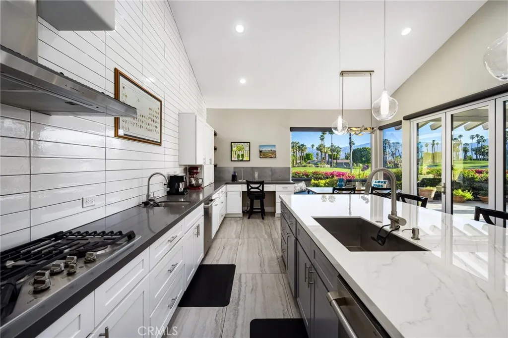FOR SUN OPEN HOUSE 12-2 TELL GUARD YOU ARE GOING TO 371 RED RIVER. Rarely available south-facing Santa Fe floorplan in The Lakes Country Club with sweeping fairway, water, and Santa Rosa Mountain views. Thoughtfully reimagined in 2018 with an open-concept design, this approximately 2,764 sq. ft. residence offers 2 bedrooms, a den, and 3.5 baths, blending relaxed desert living with effortless entertaining. A coveted private gated side yard with tranquil water feature creates a serene retreat for games or cozy TV time outside. Inside, expansive accordion doors open the great room and chefs kitchen to an extended patio designed for al fresco dining, sunset gatherings, and fireside evenings. Vaulted ceilings and abundant natural light enhance the spacious great room, dining area, and beautifully appointed kitchen with large island, premium appliances, walk-in pantry, and casual seating. The primary suite is a private sanctuary with direct side yard access, a reconfigured bath, and custom closet built-ins. Guest accommodations include a den with office area and guest bedroom, both with ensuite baths, plus a powder room. The former golf cart garage has been converted into a versatile home gym with mini split. Ideally located with direct access to a community pool and spa, this exceptional home is offered turnkey furnished with golf cartan incredible opportunity to enjoy The Lakes lifestyle from day one. The Lakes Country Club offers a robust schedule of social and fitness activities at the exquisite Clubhouse and Health and Wellness Center. Enjoy Tennis, Pickleball or Pop Tennis,