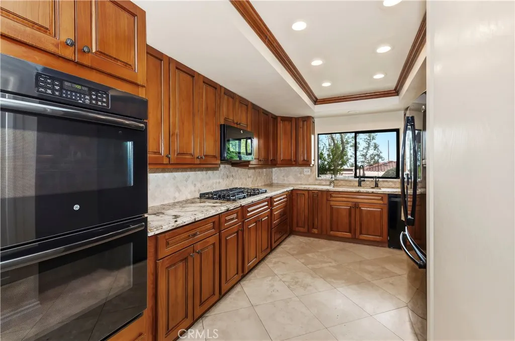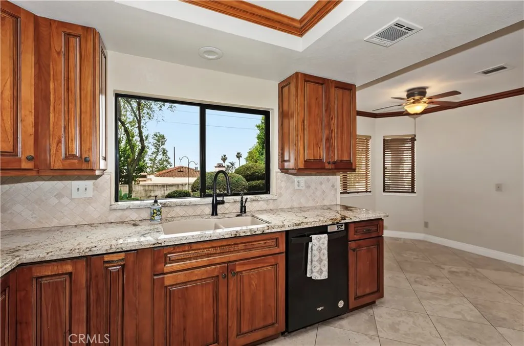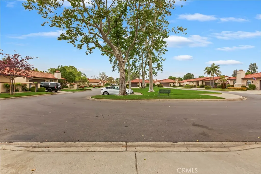 This lovely upscale single story home is located in the highly desired gated community of Villa Montelena in Upland, and sits on a premium corner lot that offers a long driveway with plenty of parking. The overly spacious floorplan is generous in all of its rooms. The secondary bedroom is a primary suite in itself with its own private full bath and large sliding doors opening to the central covered courtyard. The family room/den offers an additional adjoining office/library lined with a wall of oak bookshelves, with the rooms being easily converted to 3rd bedroom. The main living room also has views and sliding doors to the courtyard, and offers a beamed ceiling and classy fireplace with massive oak mantle and surround. Dining is a pleasure in the large dining area adorned with wood crown moldings which continue throughout the breakfast area and kitchen. A remodeled kitchen offers beautiful wood cabinetry, granite counters, glistening travertine floors, and SO much storage and counter space! A full, separate laundry room is located off the kitchen and has a sink, cabinets, and folding area. Double doors invite you into the spacious primary suite offering 2 separate closets and a luxurious remodeled bath with oval tub, separate walk in shower with bathing bench and grab bars, and dual vanities with beautiful wood cabinetry and granite counters. Five sets of sliding doors and multiple windows grace the home with plenty of light. The back yard has a covered patio accessible from the primary bedroom plus a 2nd patio area off the dining room, all surrounded by low maintenance ve