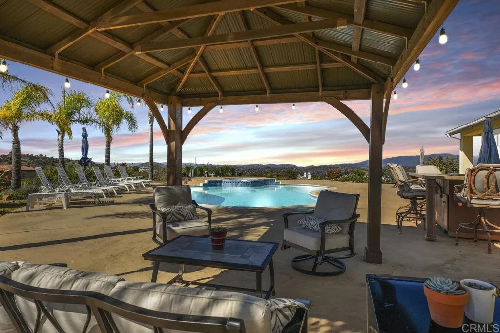 Welcome to Oak Ridge Estates, a sought-after gated community known for its privacy, space, and sweeping views stretching across the valley to Palomar Mountain. Set on 7.13 acres, this single-story estate offers owned solar, a sparkling Mission-style pool and spa, and a detached 700 sq ft ADU (2 bed / 1 bath) complete with a full kitchen, private yard, viewing deck, and mini-split ACideal for guests, multigenerational living, or rental income. Step through grand double doors into formal living and dining spaces filled with natural light, soaring ceilings, and expansive windows. Wide hallways lead to the heart of the homea spacious great room anchored by a cozy fireplace and designed for everyday living and entertaining. The chefs kitchen features stainless steel Jenn-Air appliances, gas cooktop, double ovens, an oversized island with seating, and a generous walk-in pantryall positioned to capture the homes breathtaking, unobstructed views. The primary suite offers a true retreat with its own fireplace, direct access to the pool, and a spa-inspired bathroom with soaking tub, oversized shower, dual vanities, and a large walk-in closet. Secondary bedrooms are well-appointed, including a Jack-and-Jill layout and a private guest suite with its own ensuite bath. Step outside to a resort-style setting where the pool, patio, and surrounding grounds are perfectly positioned to take in panoramic sunsets and cool evening breezes. The property is enhanced by a thriving orchard featuring over 200 guava trees, multiple avocado varieties including Hass, Reed, Zutano, and GEM, along with a