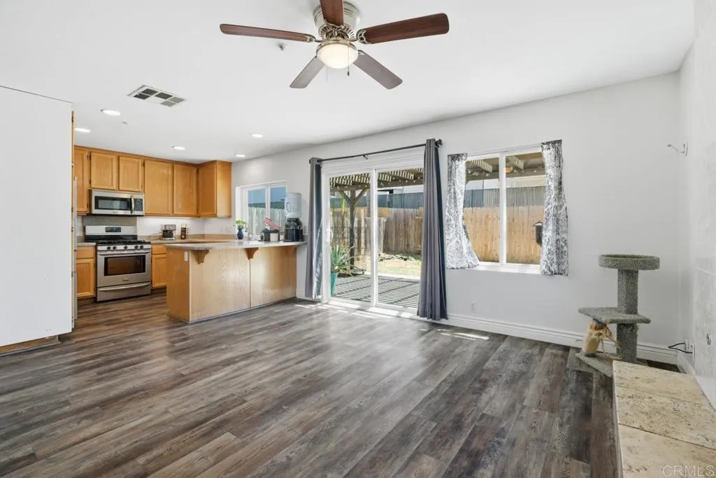 OAK CREEK VILLAGE!! 3 Bdrm/2.5 Bath Home in Friendly Community Neighborhood Near Town. Nicely Landscaped and Near Inviting Community Pool & Guest Parking! Private Fenced Backyard Area Ready for your BBQ. located at the end of 14th street for extra privacy and reduced traffic. Walkable to Schools and TownCenter!!! *** Large Private Primary Bedroom and Bath Upstairs at End of Open Railed Hallway with Overlook to Living Room. Secondary Bedrooms and Bath at Opposite End Near Hall Linens.**** Downstairs Open and Airy vaulted Living Room with Dining/Office/Library Alcove. *** Family Room With Fireplace Open to Kitchen. Wood cabinetry & Granite 'look' Counters. UPDATED with LVR Flooring & New Windows Throughout!*** Ceiling Fans & Freshly Painted Interiors. Sliders to back patio and fenced yard.