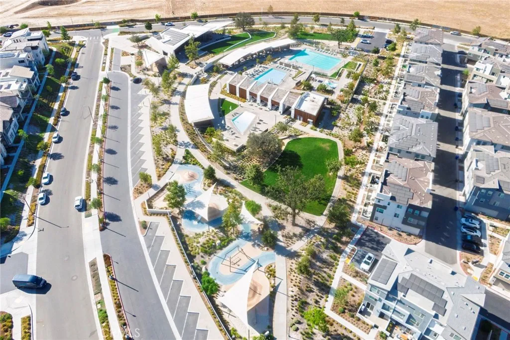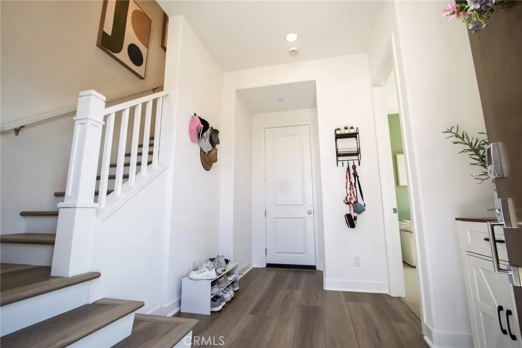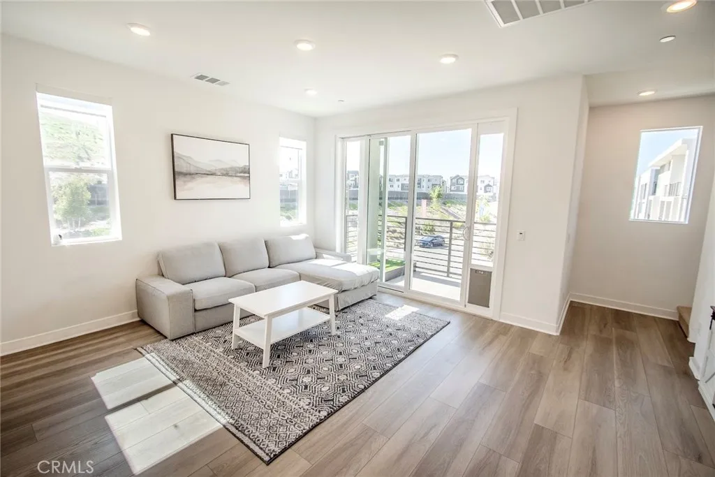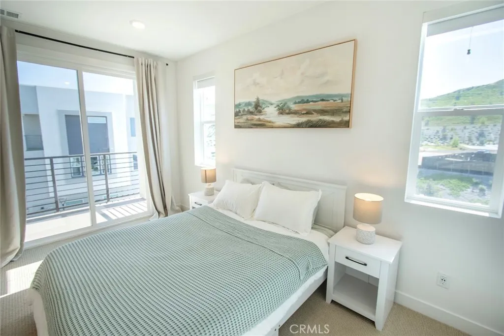 Beautiful end-unit, 3-story condo offering modern design, abundant natural light, and mountain views. The entry level features a private bedroom and full bathroom ideal for guests, a home office, or multi-generational living along with direct access to the attached garage. The main living level showcases a spacious open-concept great room with a large balcony overlooking the mountains, perfect for relaxing or entertaining. A generous family room and dining area flow seamlessly into the upgraded kitchen, complete with a large eat-at island, quartz countertops, soft-close cabinetry, and stainless steel appliances. A light-filled powder room is thoughtfully positioned on this level for added convenience. The third floor offers three additional well-sized bedrooms, including a spacious primary suite with an en-suite bathroom. Luxury vinyl flooring runs throughout the main living areas, adding both style and durability. Built just two years ago, this home feels fresh, clean, and move-in ready. Located in a beautifully maintained community featuring a large clubhouse, two pools, and a play area offering both comfort and lifestyle. Solar is leased and saves your SCE bill.