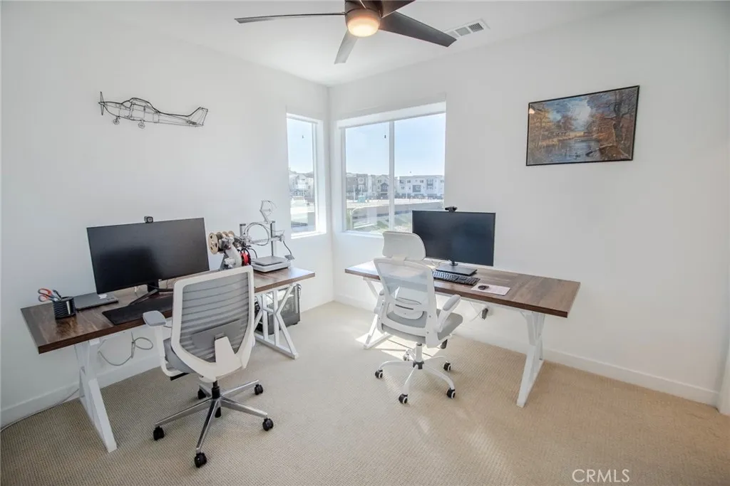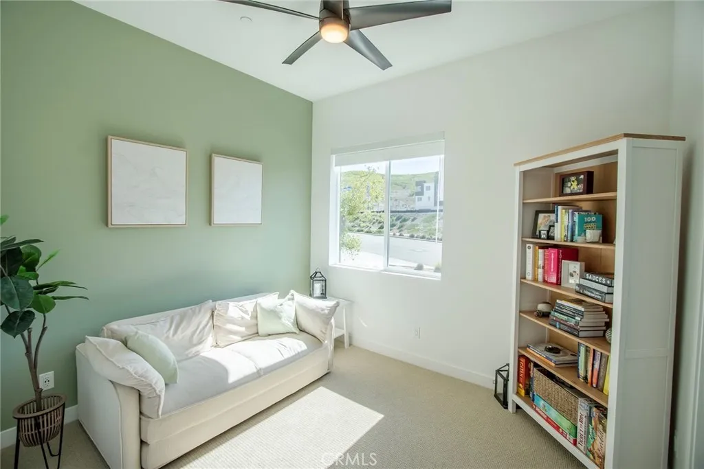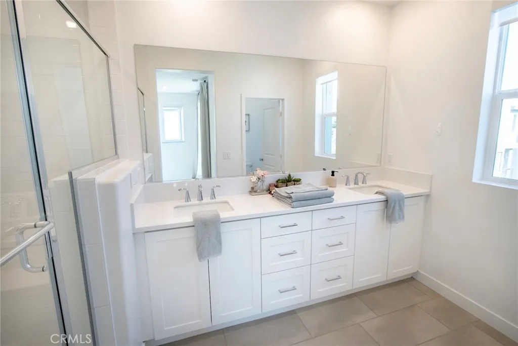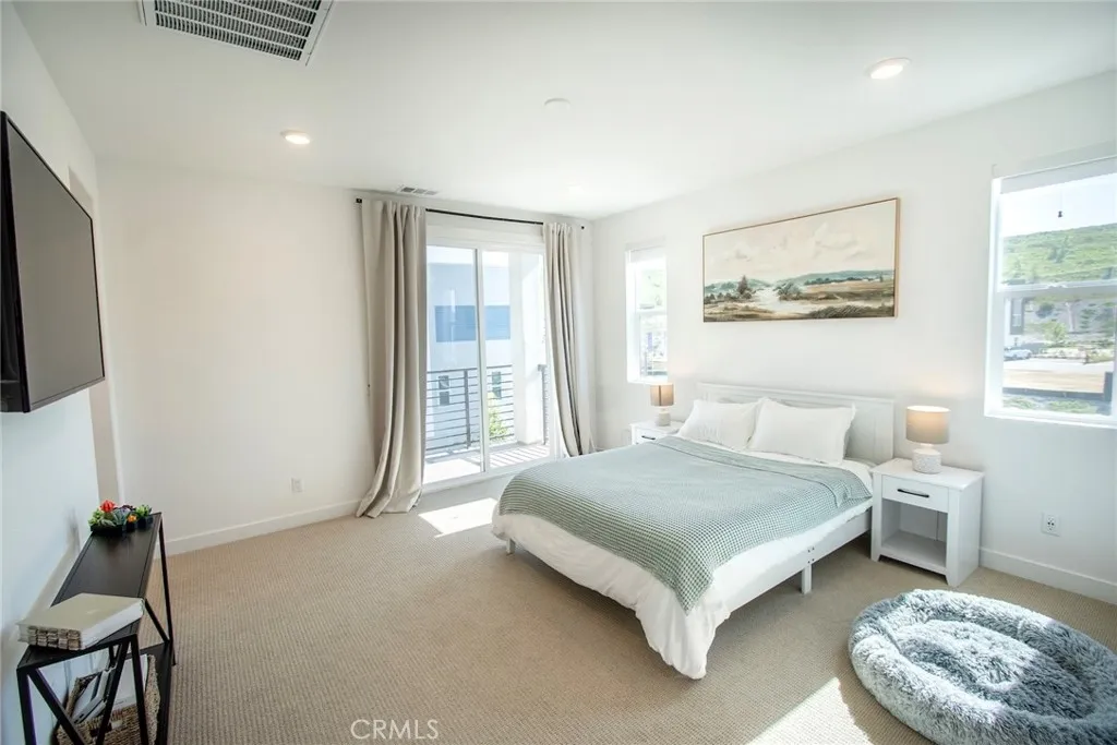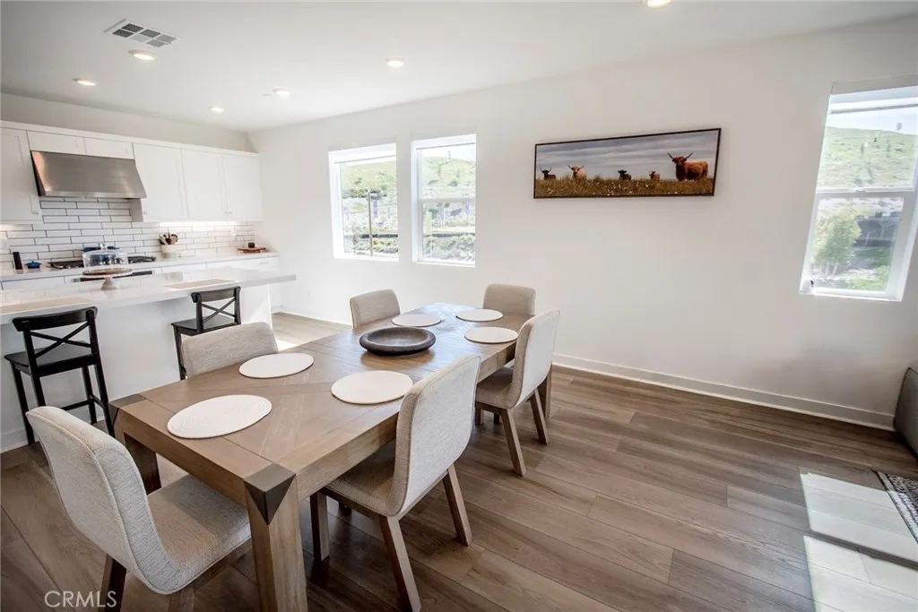 Beautiful end-unit, 3-story condo offering modern design, abundant natural light, and mountain views. The entry level features a private bedroom and full bathroom ideal for guests, a home office, or multi-generational living along with direct access to the attached garage. The main living level showcases a spacious open-concept great room with a large balcony overlooking the mountains, perfect for relaxing or entertaining. A generous family room and dining area flow seamlessly into the upgraded kitchen, complete with a large eat-at island, quartz countertops, soft-close cabinetry, and stainless steel appliances. A light-filled powder room is thoughtfully positioned on this level for added convenience. The third floor offers three additional well-sized bedrooms, including a spacious primary suite with an en-suite bathroom. Luxury vinyl flooring runs throughout the main living areas, adding both style and durability. Built just two years ago, this home feels fresh, clean, and move-in ready. Located in a beautifully maintained community featuring a large clubhouse, two pools, and a play area offering both comfort and lifestyle. Solar is leased and saves your SCE bill.