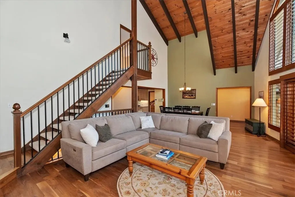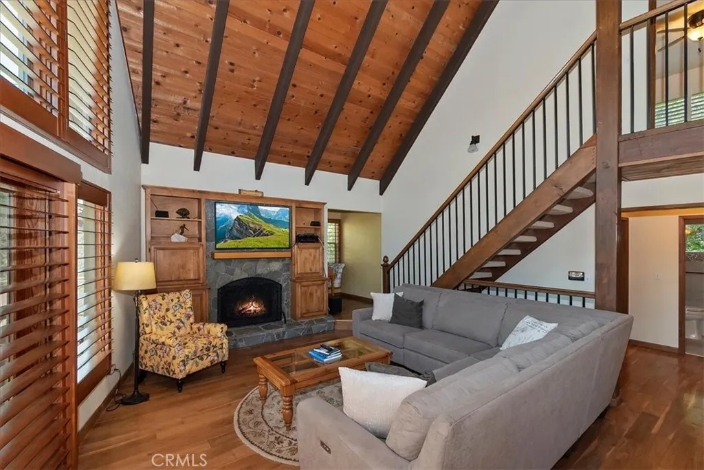 Mountain Modern Luxury at the Country Club. ~ Escape to this stunning 2,290 sq. ft. retreat, perfectly positioned on over a third of an acre of usable, forested land. Located directly across from the prestigious Lake Arrowhead Country Club, Golf Course and Grass Valley Park. This home offers the ultimate blend of sophisticated updates and rugged mountain charm. ~ The Home: Awesome "Prow style" that features level-entry! Step into everyones favorite open floor plan, where the gourmet kitchen, dining, and living areas flow seamlessly together. Soaring two-story vaulted and beamed ceilings and floor-to-ceiling windows with remote-control solar shades flood the space with natural light, framing serene forest views. Every inch has been thoughtfully updated, including modern flooring, designer baths, and expansive new decks perfect for entertaining. ~ The Layout: Upper Level: A dedicated sanctuary. The entire top floor is a private Master Retreat, offering unmatched scale and comfort. Main Level: Features a guest-friendly bedroom and full bath for easy living. ~ The Garage: A rare 700 sq. ft. attached space. At 38 feet deep, its a dream for boat storage, a workshop, or multiple vehicles AND extra nice driveway for parking for plenty of guests. ~ The Lifestyle: Offered wonderfully furnished & decorated. Enjoy the convenience of a level-entry home on a county-maintained, plowed road with all public utilities and high-speed internet plus XL indoor laundry room, Central heat AND A/C, too! Youre just 5 minutes from the Lake Arrowhead Village and private lake access. ~ ncludes Full Lak
