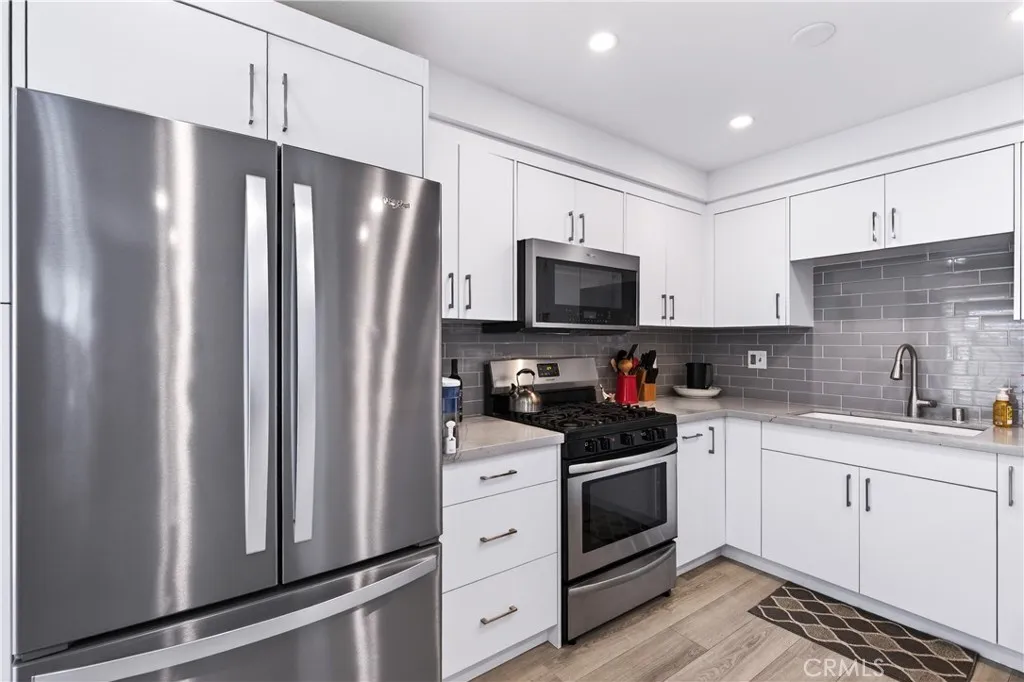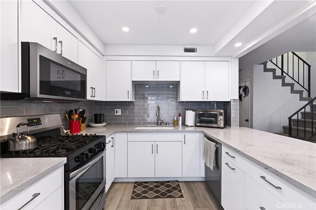 Welcome to this beautifully upgraded 3-bedroom, 1.5-bath townhome located in the desirable Tamarack Village community. This well-maintained home features a remodeled kitchen with sleek white cabinetry, stainless steel appliances, and recessed lighting that enhances the kitchen, dining area, and living room with a bright, modern feel. Upstairs, all three bedrooms offer privacy and comfort, including one with its own private balcony. The upstairs bathroom and primary bedroom have been remodeled as part of the homes improvements. Additional upgrades include newer windows and sliding doors throughout, along with the added convenience of an electric vehicle charger. The spacious private patio creates an ideal indoor-outdoor living space for relaxing or entertaining. Interior improvements also include painted ceilings, stair hand railing, kitchen, living room, and bathroom areas completed during prior renovation work. Residents enjoy access to a community pool and a pet-friendly environment with no weight or size restrictions. Conveniently located near Lambert Park and Fulton Park, with shopping and dining nearby at Old World Village/OC Circle (approx. 2 miles) and Bella Terra (approx. 3 miles). Easy freeway access and just a short drive to the beach make this home an excellent opportunity for comfortable coastal-adjacent living.