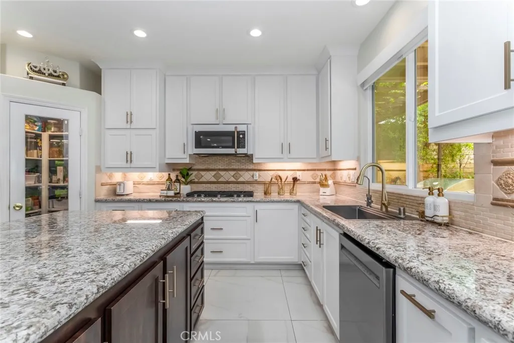 Welcome to this stunning Executive Pool Home, ideally situated at the end of a beautiful cul-de-sac in upper Stevenson Ranch in the highly desired Twilight Vista tract. From the moment you arrive, the home makes a lasting impression with exceptional curb appeal, highlighted by a private courtyard with professional landscaping and tranquil fountains. Through the grand double doors you will find a breathtaking formal entry, where soaring ceilings and a dramatic wrought-iron staircase create a striking focal point. Rich marble-inspired 20 x 20 tile flooring spans the lower level, while the upper level is beautifully finished with warm wood flooring, creating a cohesive blend of elegance and comfort throughout. Spanning nearly 3600 sq ft, the expansive floor plan features 5 bedrooms, 5 baths, a huge great room, formal dining, office nook and upstairs laundry. The expanded great room includes modern wood slat wall detail, ambiance lighting and tons of windows filling the space with natural light. At the center of it all, the newly updated kitchen impresses with an oversized center island, white shaker cabinetry, gorgeous granite counters, walk in pantry, stainless appliances, and modern hardware. The space opens seamlessly to the inviting great room perfect for hosting large gatherings. The main level also features a generously sized bedroom and a private full bath, ideal for guests, multigenerational living, or a home office. Upstairs, the primary suite offers a true retreat, complete with a private balcony capturing sweeping views of Stevenson Ranch and the surrounding mountai