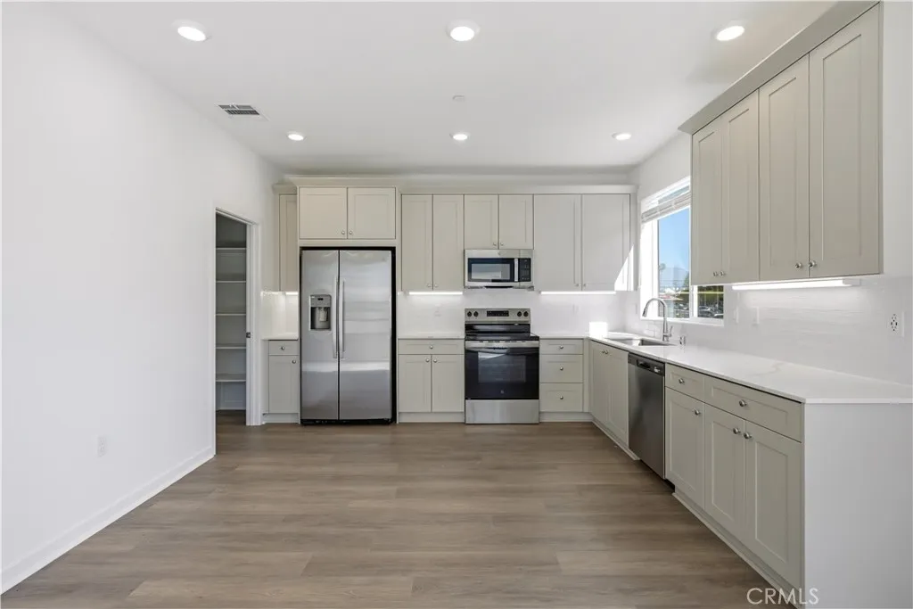 BRAND NEW TOWNHOME! This is a nicely upgraded true 3 bedrooms and 2.5 bathrooms!! Nestled in the heart of North Hills, this private gated community of 58 trilevel condominiums highlights modern urban living. This location offers unparalleled convenience, with easy access to everything you need. Just minutes from the 405 freeway, you can commute to work or play with saving you time and fuel! This is a prime location and an end unit with a gated senior community behind which is very quiet and has lots of mature landscaping. This is also one of only two homes left with a small private yard and a spacious balcony. This home comes with an oversized side by side two car garage with plenty of room for both your cars and lots of room for storage left over. Step inside this modern home and be greeted by a spacious covered entryway with beautiful LVP flooring that is also on the stairs leading you to the second level. The second floor features more LVP flooring, upgraded quartz countertops with a full custom backsplash, undercabinet lighting, nine-foot ceilings, and large windows flooding the space with natural light and creating a perfect ambiance for relaxation and entertainment. On the third level, youll find the primary bedroom, and two secondary bedrooms with direct access to their shared bathroom. This nicely upgraded home has it all, making it an ideal choice for buyers seeking a comfortable and spacious living environment. Come see this home right away to take advantage of our large INCENTIVES that will make this home even more affordable! "Photos are for illustrative purpose