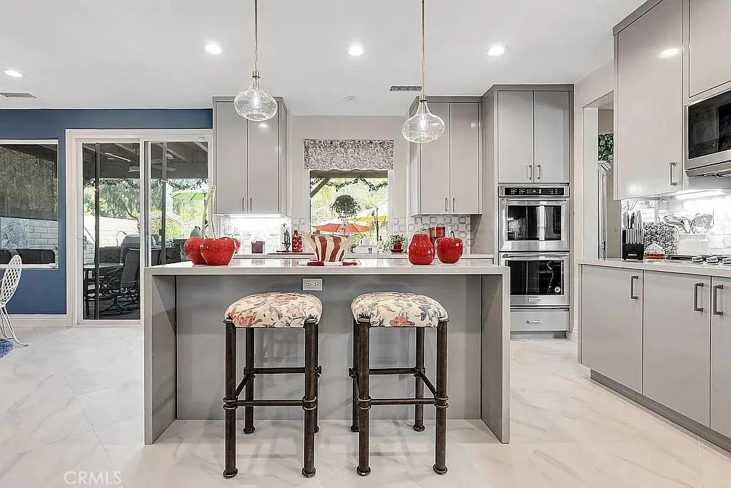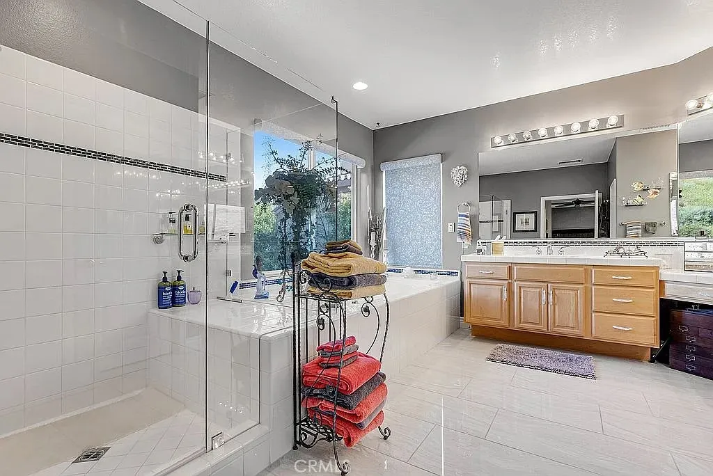 A half acre lot located at the end of a cul-de-sac features a tropical grotto pool setting with water spouts, waterfalls, and fountain. A ten person spa provides party fun. Privacy is the key word to describe this home as a picturesque hill provides backyard privacy. Exterior side walkway is perfect for guests arrival when entertaining. Large Master bedroom is enhanced by French door opening onto a 300 sf deck overlooking pool and private hillside. Master Bedroom with Bidet. Two fully built out walk in closets lead you to your large bath with spa tub, new glass enclosed shower, and remote controlled window coverings. Your kitchen was taken down to the studs in 2025 and designed to work with any color you choose as it has a blend of various shades of cool grays and cream in countertops and cabinets that extend clear to the ceiling. New soft white porcelain floors throughout kitchen, family room, laundry and hallways. Kitchen offers an island and separate informal eating area with designer chandelier. Family room has new window shades and fireplace tile. Home has two full and two half baths, one half bath serves the pool with outside entry, no wet feet in your home. Enjoy a private, formal dining room with gold and crystal chandelier. Fourth large bedroom offers wall to wall built ins for alternate choice as office. Flooring: Porcelain, Wood throughout. Roof: Concrete. Exterior: Stucco, Wood. Fireplace in Family Room. Deck: 300 sq. ft., glass railing, off master bedroom, beautiful pool/hillside view. Garage: 3 bay, built ins, one bay used for storage with shelving at this tim