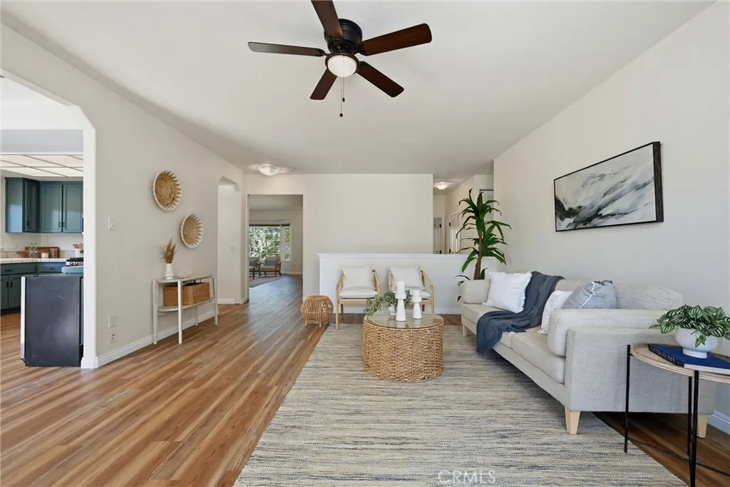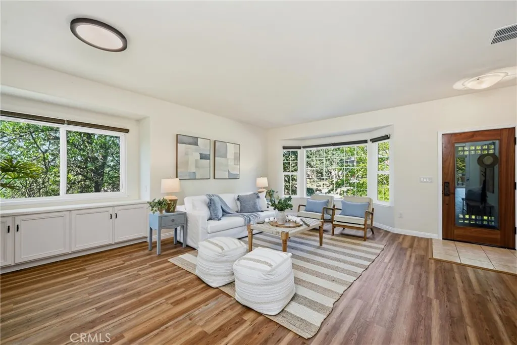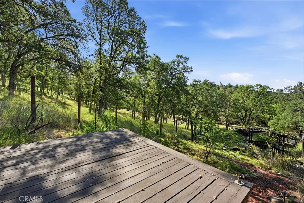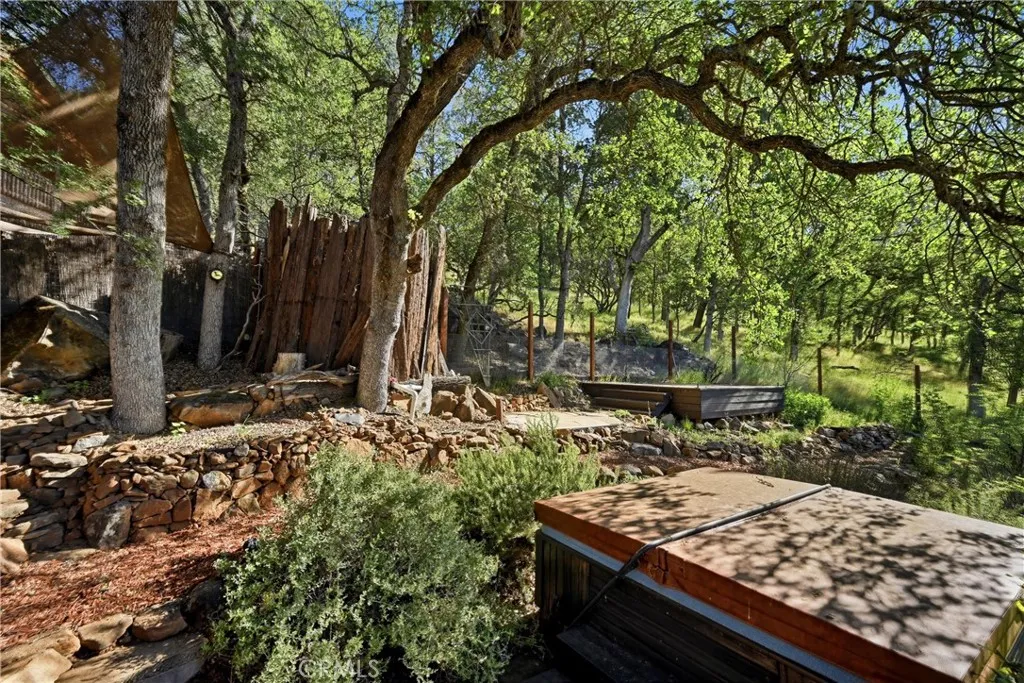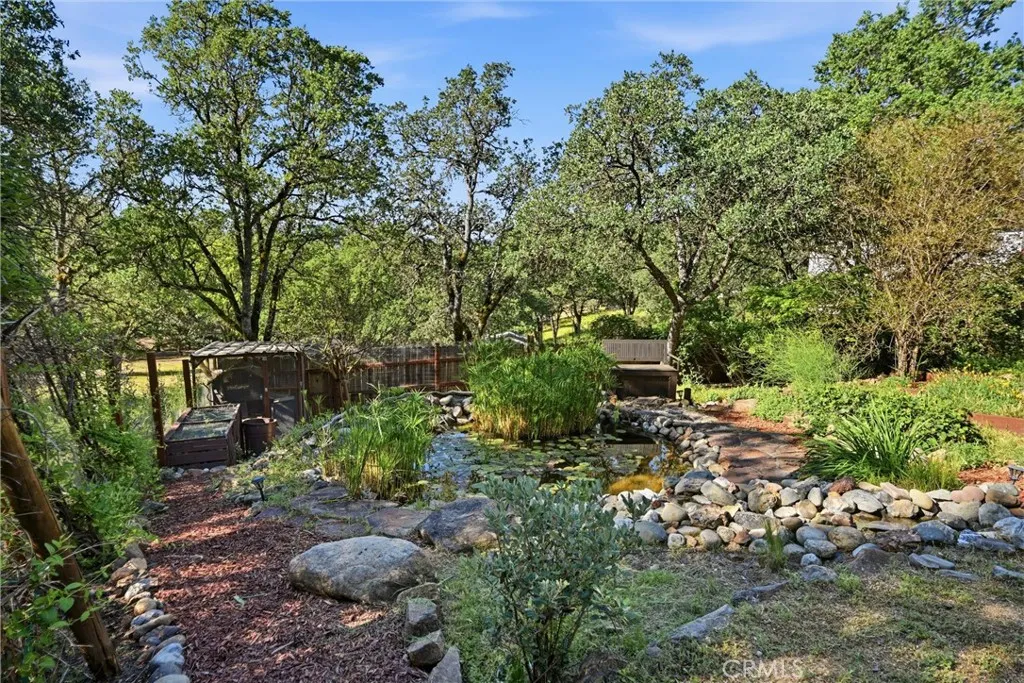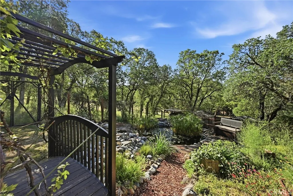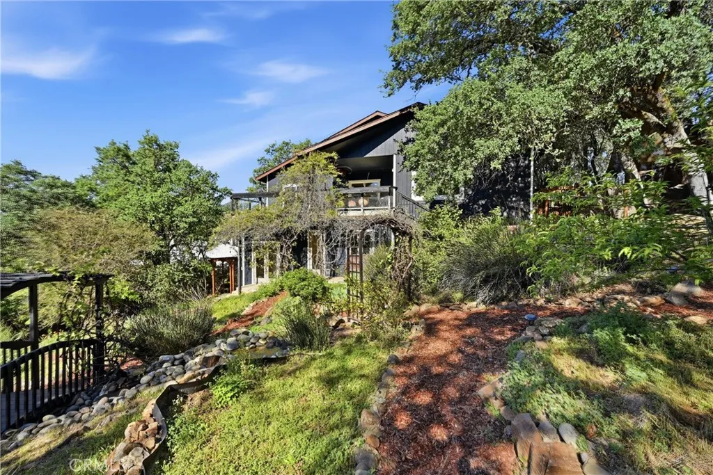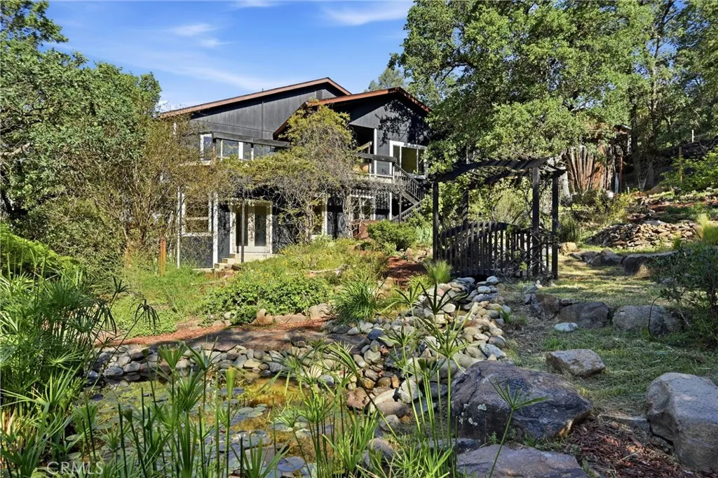 Welcome to 19345 Moon Ridge Rd, where the backyard is a true paradise and the home offers a comfortable lifestyle with space to live, work, and relax. This five-bedroom, three-bath home offers over 3,100 sq ft of living space with unobstructed views of a beautifully landscaped garden featuring a variety of fruit trees, vegetables, herbs, and flowers. Outdoor amenities include a campfire circle, waterfall, stream, large fish pond, two-story arbor covered in wisteria, full-sized Coleman hot tub, outdoor shower, and an automatic drip irrigation system supported by a 3,000-gallon rainwater catchment tank. The living/great room features a built-in fireplace and a corner spiral staircase leading to additional bedrooms, offices, and utility or recreation rooms, with solid core doors in all bedrooms. New paint both interior and exterior with all new flooring throughout makes the home shine. Solar power with battery storage adds efficiency and security, and remotely controlled rooftop sprinklers provide an added layer of protection, making this property well-equipped for comfortable daily living.