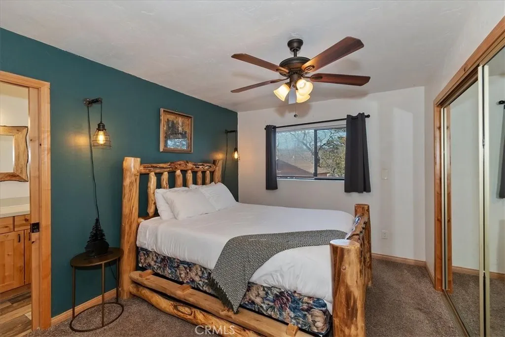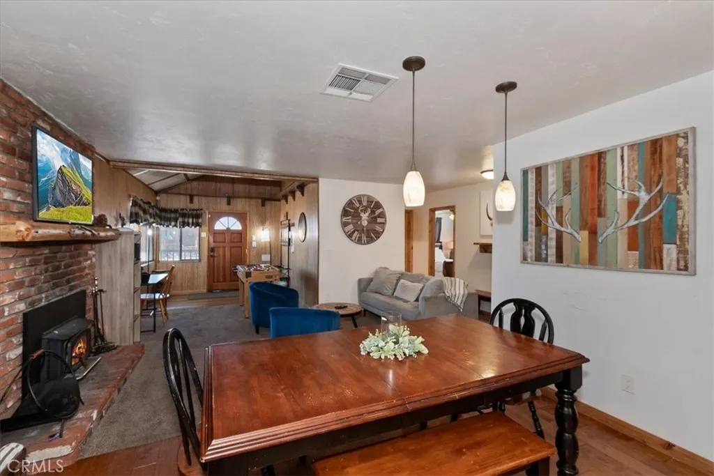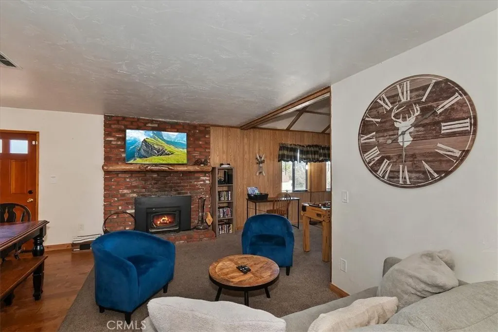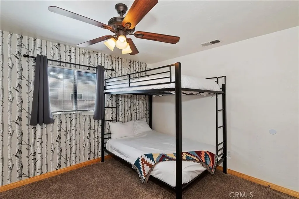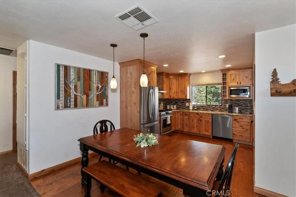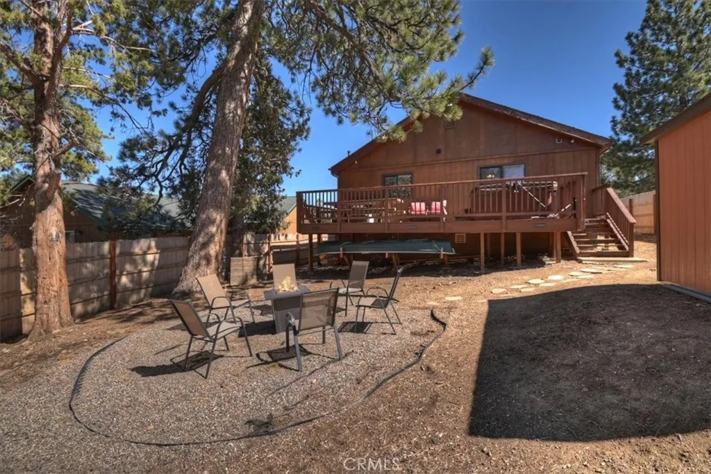 Looking for a profitable short term investment property in Big Bear with a strong proven track record? THIS WELL-APPOINTED HOME GENERATED OVER $76,000 in 2025, making it an exceptional opportunity for investors seeking both personal enjoyment and steady vacation rental revenue. This single-story upper Moonridge home is completely move-in ready and turnkey, allowing you to block out the dates you want for personal use while continuing to generate income the rest of the year. Inside, the inviting living room features vaulted ceilings, newer carpeting, and a cozy brick fireplace insert, creating the perfect mountain retreat atmosphere for guests. The remodeled kitchen is designed for functionality and style with wood flooring, granite countertops, custom wood cabinetry, and stainless-steel appliances. The home offers three spacious bedrooms, including a private primary suite with en-suite bathroom, providing comfortable accommodations for guests and families. Both bathrooms have been tastefully updated with wood-grain tile flooring, newer vanities, sinks, and modern fixtures. Step outside to enjoy the expansive wrap-around back deck, complete with a hot tub and bbq, ideal for relaxing after a day on the slopes or hiking trails. The fenced backyard features a playground area and fire pit, creating a perfect setting for outdoor entertaining and memorable mountain evenings. Situated on a level 7,200 square foot lot, the property also includes a large storage shed for ski gear, bikes, and seasonal equipment, along with a convenient concrete circular driveway for easy year-round ac