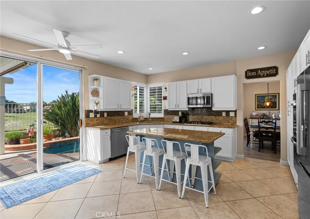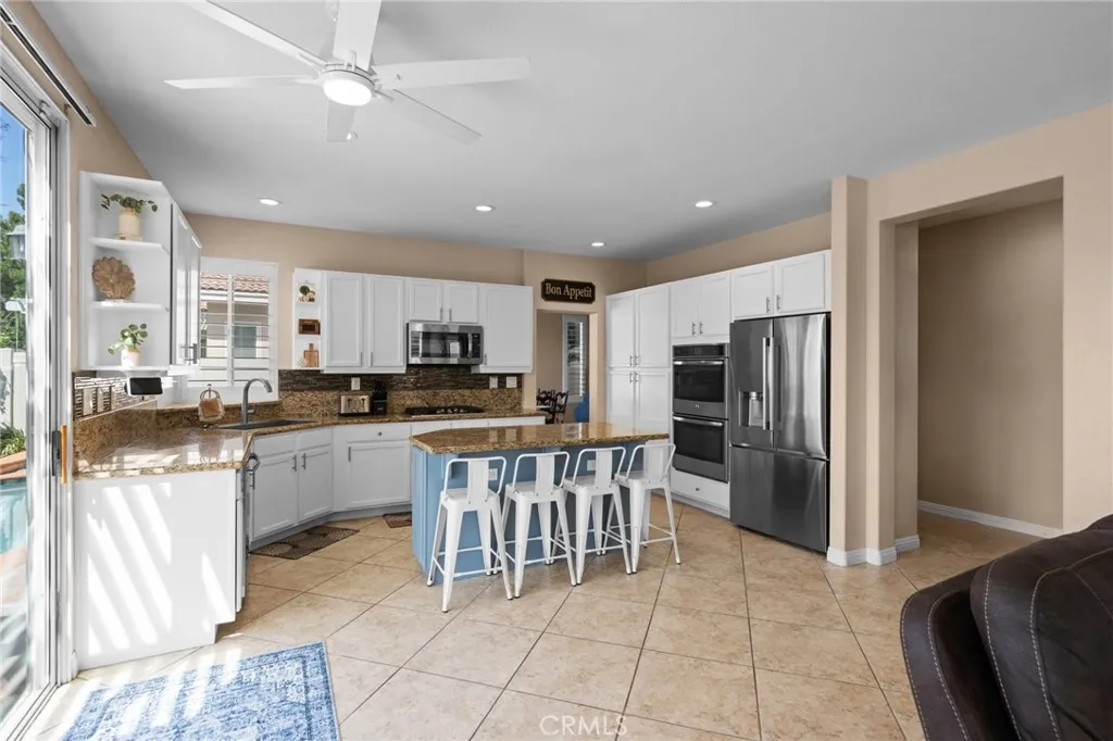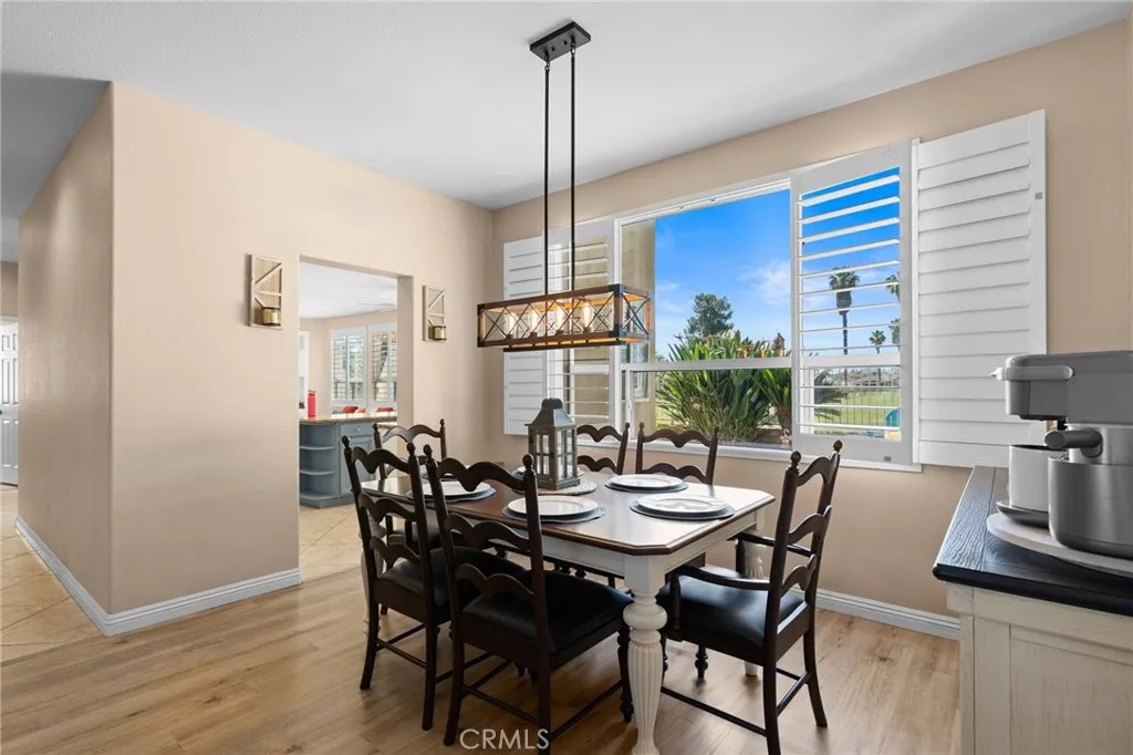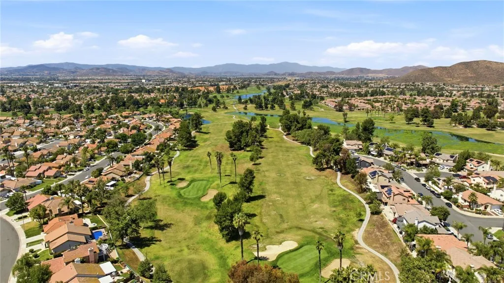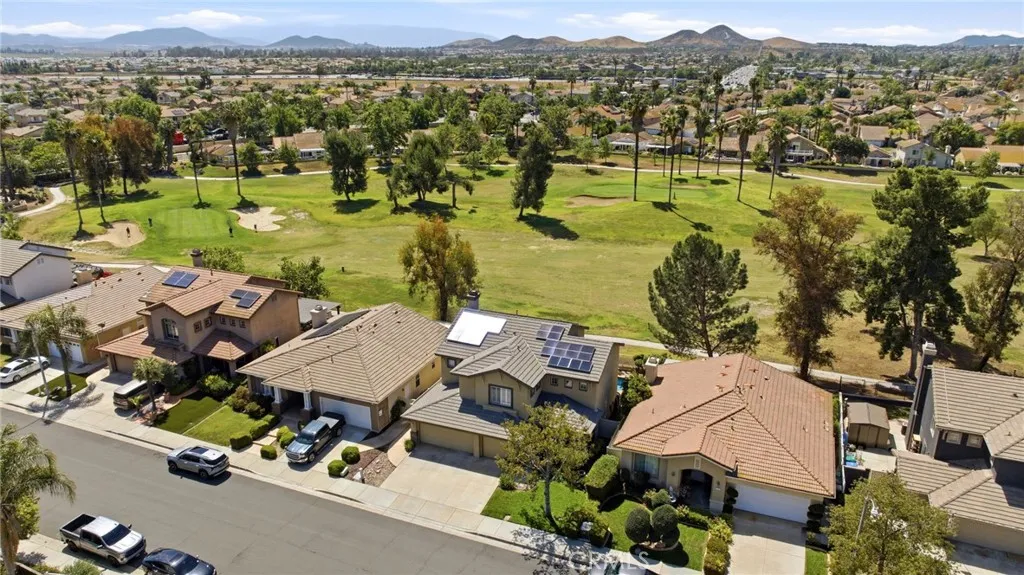 This elegant two-story home, located on the Menifee Lakes golf course, overlooks the 16th and 17th holes. This beautifully maintained home features four bedrooms, three baths, a loft, and 2508 square feet. One bedroom and bathroom are conveniently situated downstairs, which includes a new vanity. The home boasts elegant designer touches throughout, including plantation shutters and newer flooring upstairs enhancing the overall aesthetic. The kitchen boasts granite countertops, a tile backsplash, a central island with barstool seating, a farmhouse-style sink, and GE stainless steel appliances, including a five-burner cooktop and double oven. Theres ample cabinet storage, with 14 pullout shelves for easy access. Upstairs, the primary bedroom offers stunning views of the golf course and includes dual sinks, a large soaking tub, a separate walk-in shower, and a spacious walk-in closet. Two additional bedrooms share a guest bathroom, and the loft area is perfect for an office, play area, or potential conversion into a fifth bedroom. The property is equipped with solar panels, which will be paid off at the close of escrow. The HVAC system is approximately five to six years old and complemented by a whole house fan. The spacious three-car garage features overhead shelving for additional storage. The low-maintenance backyard includes a small pool and spa, all while providing beautiful views of the golf course. No HOA and very low taxes, with convenient access to shopping and restaurants off Newport Rd.