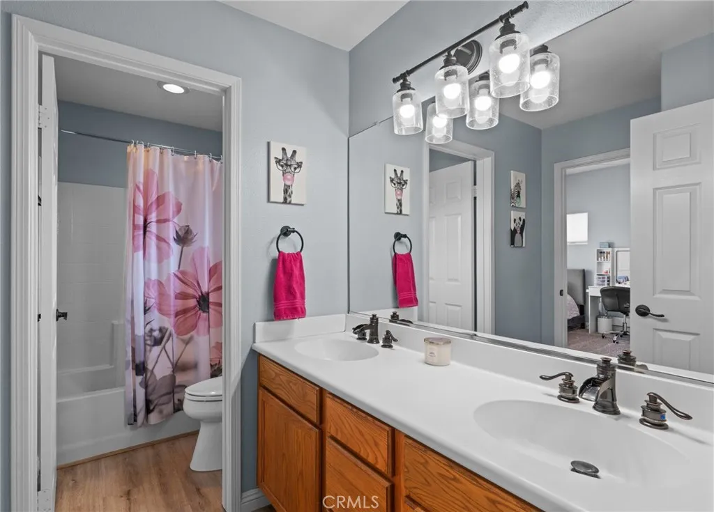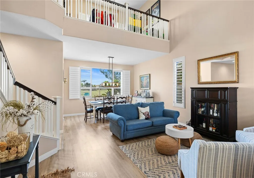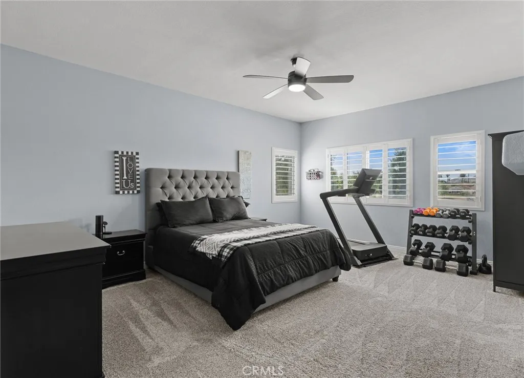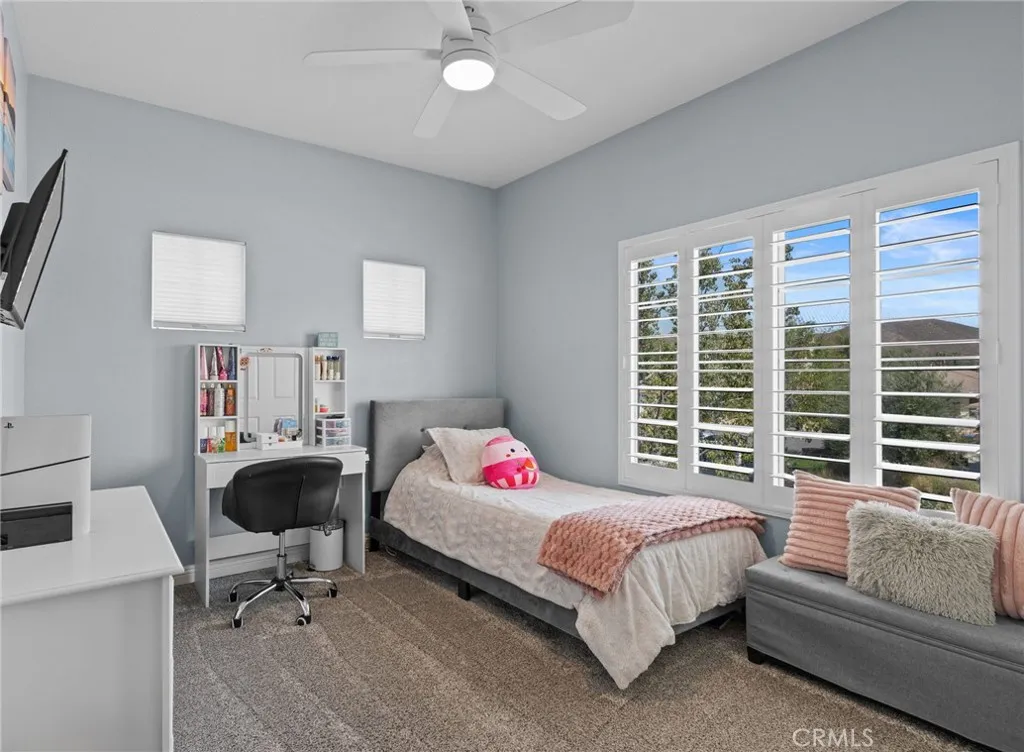 This elegant two-story home, located on the Menifee Lakes golf course, overlooks the 16th and 17th holes. This beautifully maintained home features four bedrooms, three baths, a loft, and 2508 square feet. One bedroom and bathroom are conveniently situated downstairs, which includes a new vanity. The home boasts elegant designer touches throughout, including plantation shutters and newer flooring upstairs enhancing the overall aesthetic. The kitchen boasts granite countertops, a tile backsplash, a central island with barstool seating, a farmhouse-style sink, and GE stainless steel appliances, including a five-burner cooktop and double oven. Theres ample cabinet storage, with 14 pullout shelves for easy access. Upstairs, the primary bedroom offers stunning views of the golf course and includes dual sinks, a large soaking tub, a separate walk-in shower, and a spacious walk-in closet. Two additional bedrooms share a guest bathroom, and the loft area is perfect for an office, play area, or potential conversion into a fifth bedroom. The property is equipped with solar panels, which will be paid off at the close of escrow. The HVAC system is approximately five to six years old and complemented by a whole house fan. The spacious three-car garage features overhead shelving for additional storage. The low-maintenance backyard includes a small pool and spa, all while providing beautiful views of the golf course. No HOA and very low taxes, with convenient access to shopping and restaurants off Newport Rd.