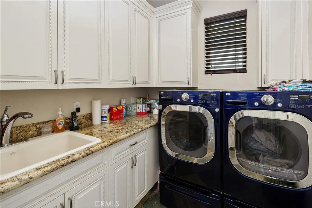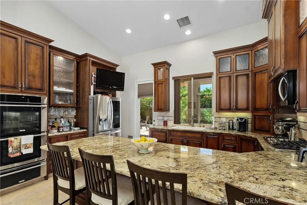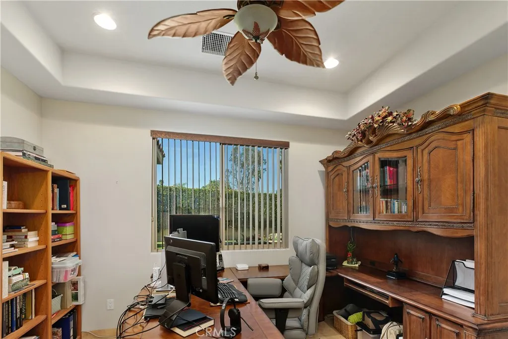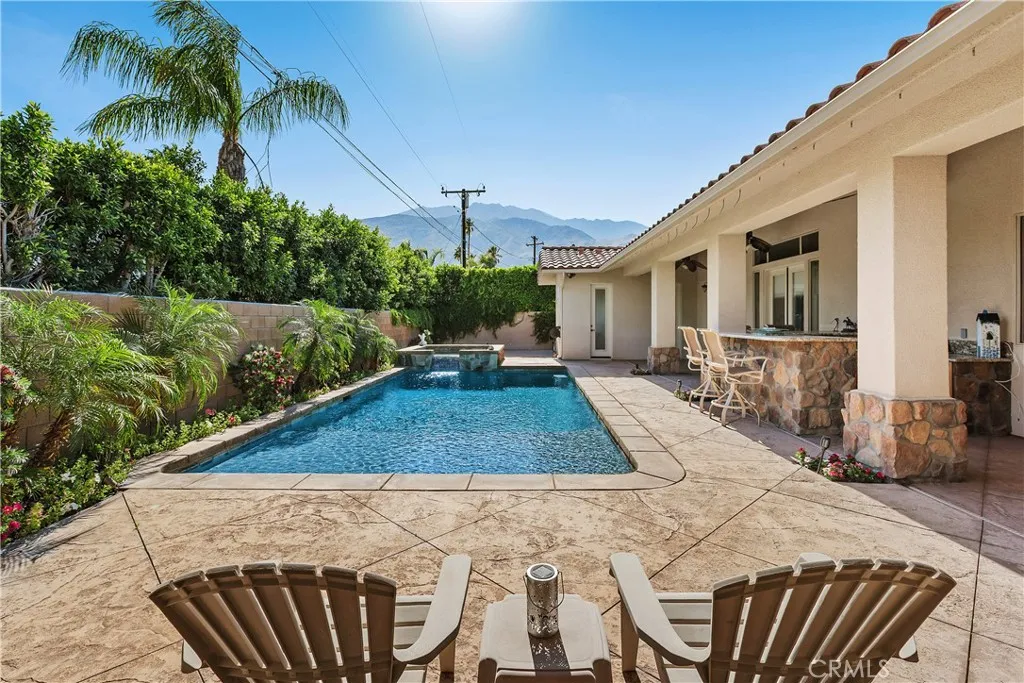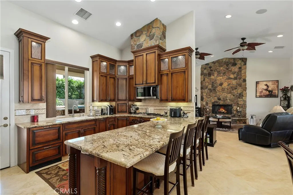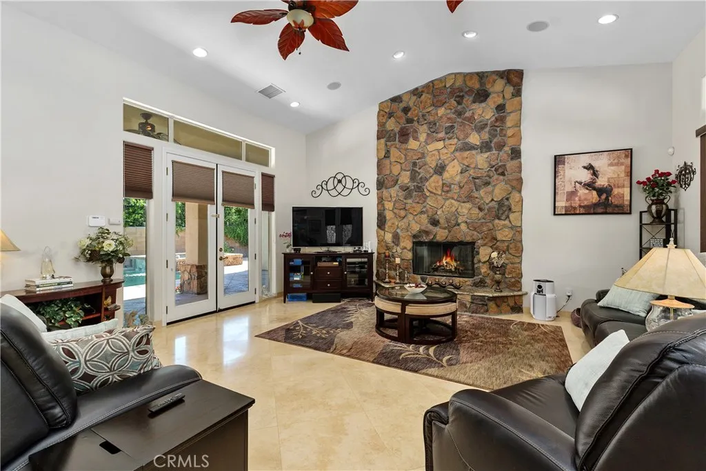 Step into refined comfort and effortless style in this beautifully upgraded single-level residence. Designed with both elegance and functionality in mind, this home features three spacious bedrooms, a dedicated office with a sophisticated tray ceiling, two full bathrooms, and two half baths. From the moment you enter, youre greeted by soaring vaulted ceilings, rich 24 x 24 travertine flooring throughout, and striking 8-foot custom interior doors that elevate the homes architectural appeal. The inviting living area centers around a large, statement fireplaceperfect for cozy evenings and entertaining alike. The gourmet kitchen is a chefs dream, showcasing custom cabinetry, granite countertops, a walk-in pantry with matching finishes, a five-burner gas cooktop, double ovens, and a convenient warming drawer. Thoughtful touches like built-in wine shelving and recessed lighting add both charm and practicality. The luxurious primary suite offers a relaxing retreat, complete with a cedar-lined walk-in closet and a spa-inspired bathroom featuring a jacuzzi tub. Comfort is enhanced throughout the home with overhead ceiling fans, solar lighting, and a water softener system. Additional highlights include a dedicated laundry room, custom built-in hallway cabinetry, and a finished two-car garage with epoxy flooring and custom storage solutions. Step outside to your private backyard oasisperfect for entertaining or unwinding. Enjoy the saltwater pool, private sauna, outdoor pool shower, and covered patio area with a built-in bar. Ambient outdoor lighting and fully paid solar add efficienc
