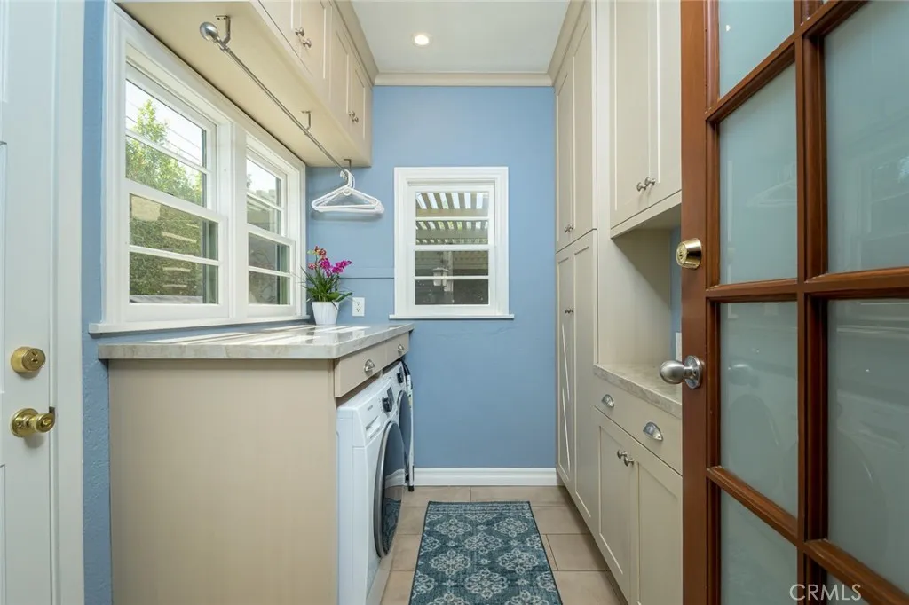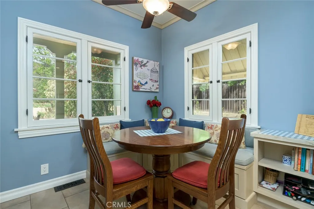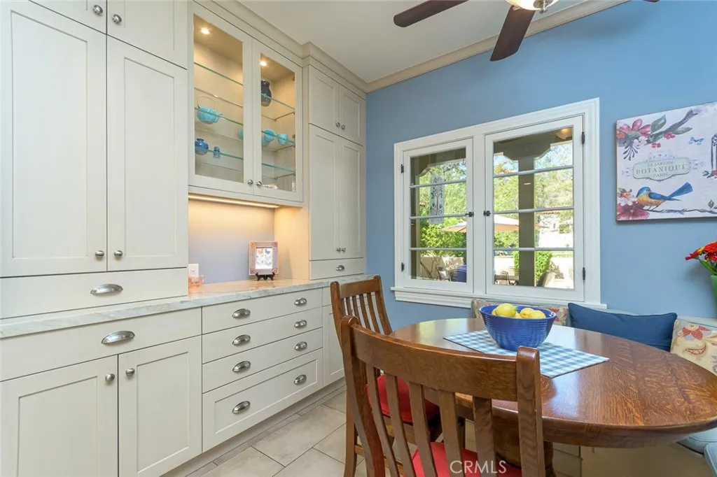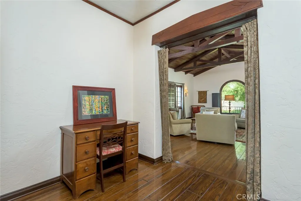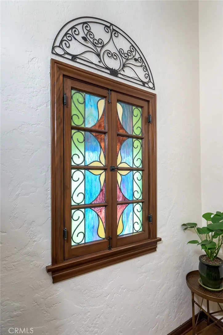 Spanish Revival Architecture is having a major moment and this home showcases all of the signature design elements that make this style so popular, features like arched doorways and a large picture window, dark wood ceiling beams, wood-framed French windows, wrought-iron railings and fixtures, a handsome fireplace and hearth trimmed in Spanish tiles, intricate carved wood detailing at the mantle and decorative lintels, and a delightful little niche in the hallway. From the moment you enter through the wrought iron gate, you're welcomed by a large, vibrant courtyard designed for entertaining or relaxing beside the peaceful fountain and outdoor fireplace. This blend of classic architecture from the 1920s has all of today's modern conveniences and luxury as well. The well-designed kitchen is outfitted with top-tier Wolf appliances, a Shaws handcrafted sink and custom Wood Mode easy-clean cabinets. (You'll have to look closely to find the seamlessly integrated refrigerator and dishwasher.) The charming breakfast nook with its built-in seating is perfect for morning coffee or a cozy casual dining area. This nook also offers a wall of cabinets and a lighted, glass display case. The adjacent laundry room provides additional cabinet space. One thing is for sure: you won't lack for cabinet space here! Polished peg and groove wood floors in the living room and formal dining room add to the richness and beauty of this home. Climb the wood staircase with its wrought-iron railing and experience the beauty of the large stained glass window above the landing. Upstairs, the spacious primar