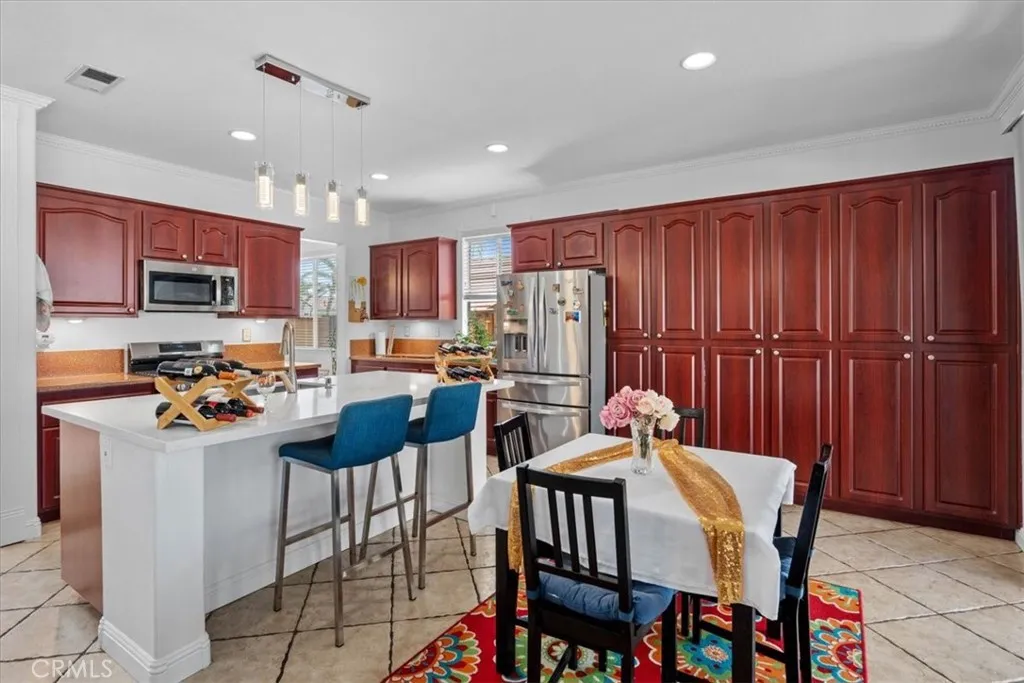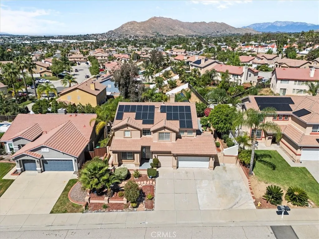 Turnkey pool home with solar, upgrades, and panoramic views in Moreno Valley. Welcome to 12059 Franklin St, a beautifully maintained and extensively upgraded 5 bedroom, 3 full bathroom home featuring a highly desirable floor plan with one bedroom and full bath on the main level and four additional bedrooms plus a spacious loft upstairs. Filled with plenty of natural light, this move in ready residence offers a bright and inviting atmosphere throughout. The home has undergone over $65,000 in upgrades since 2021, not including the fully installed 23 panel solar system that produces more power than the home consumes and generates valuable energy credits. The interior showcases fresh interior paint, updated lighting, new window blinds, and a remodeled kitchen island with quartz countertops and stainless steel sink, creating a clean and modern feel. Flooring includes ceramic on the first level and a combination of hardwood and carpet upstairs. Every bedroom offers closet space, while the primary suite features a generously sized walk in closet. Additional improvements include a new electrical panel, EV charging station, Google Nest thermostat, mini split AC in the upstairs loft, attic fans, and high speed fiber internet. The backyard is designed for both relaxation and entertaining with mature landscaping, a private pool and spa supported by a fully upgraded system including new pump, heater, filter, and automation controls. Exterior enhancements include fresh exterior paint, new vinyl fencing, upgraded irrigation system, enhanced motion lighting, a new garage door, security scr