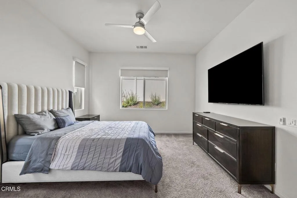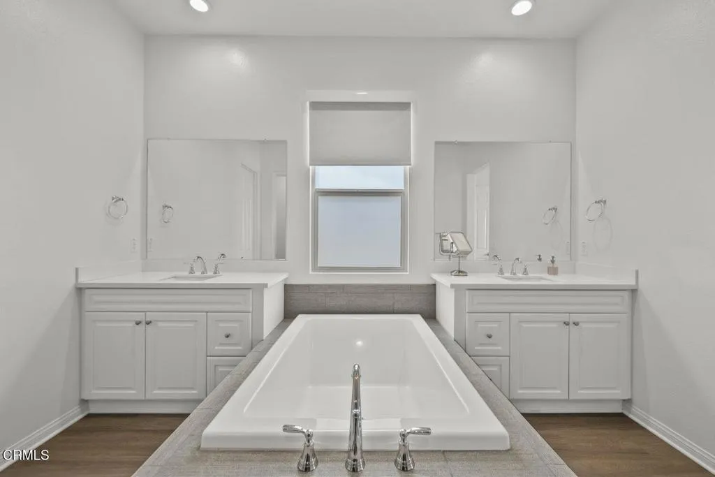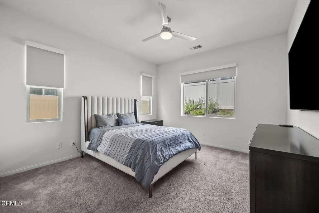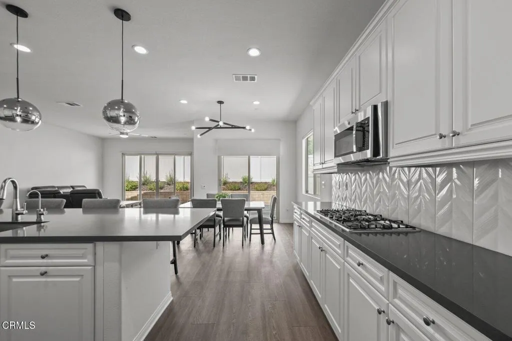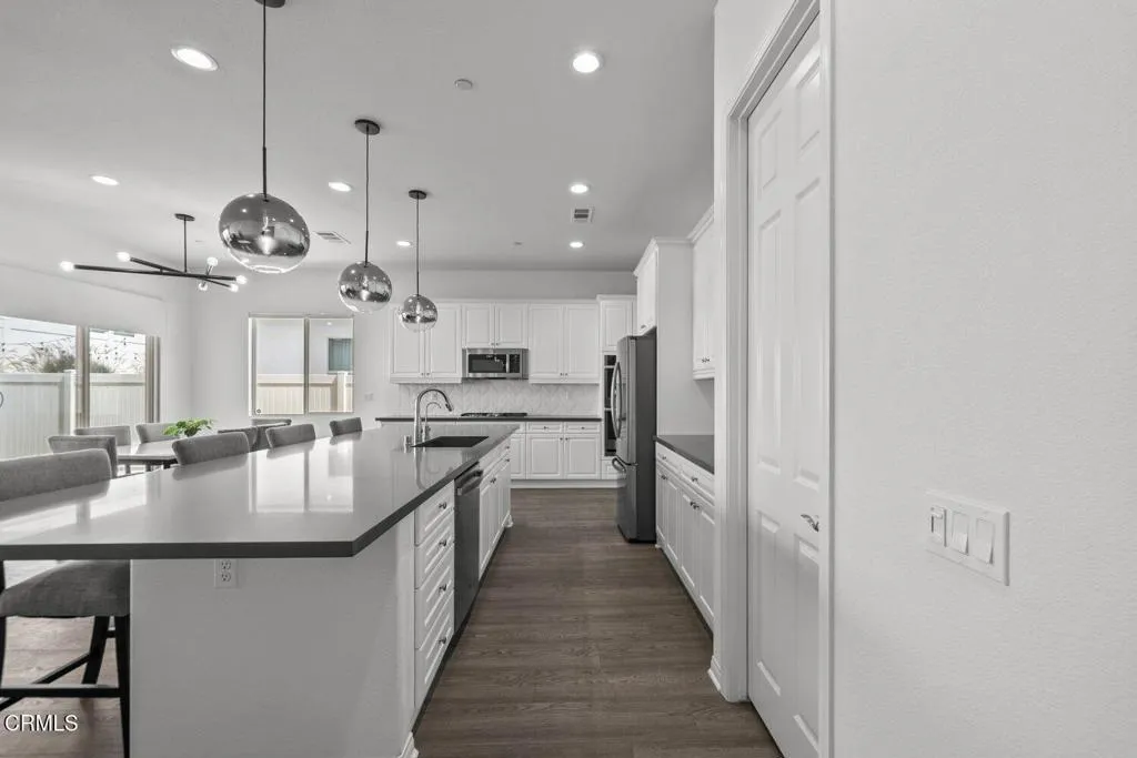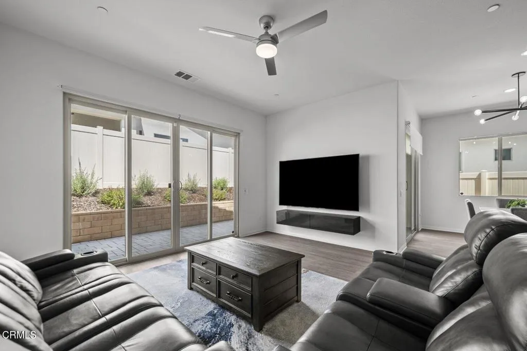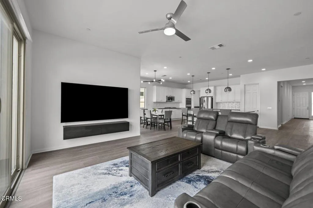 Welcome to 2075 Seville Drive, located in the highly sought-after Harvest at Limoneira community. Single-story homes in this neighborhood are limited and this move-in ready residence is one of them.Built in 2020, this 3 bedroom, 2 bathroom home offers approximately 1,950 square feet of thoughtfully designed living space, featuring high ceilings, upgraded flooring, and a bright, open layout that feels both modern and inviting.The spacious hallway leads you into the heart of the home, where the kitchen, dining, and living areas come together seamlessly. The kitchen is designed for both everyday living and entertaining, complete with quartz countertops, an oversized island with bar seating, and ample storage. Natural light pours in through dual sliding glass doors, creating a seamless connection to the backyard and enhancing the indoor-outdoor lifestyle Southern California is known for.The primary suite is privately situated and offers a true retreat, featuring a spa inspired bathroom with dual vanities, a soaking tub, a separate shower with upgraded finishes, and a generously sized walk-in closet.Additional bedrooms are well-appointed with detailed finishes and natural light, offering flexibility for guests, a home office, or growing households.The backyard provides the perfect space to relax or entertain, with easy access from the main living areas. A 2-car garage and driveway offer convenient parking and additional storage.Residents of Harvest at Limoneira enjoy resort-style amenities including a fitness center, pool and spa, walking trails, sports fields, playgrounds, BBQ