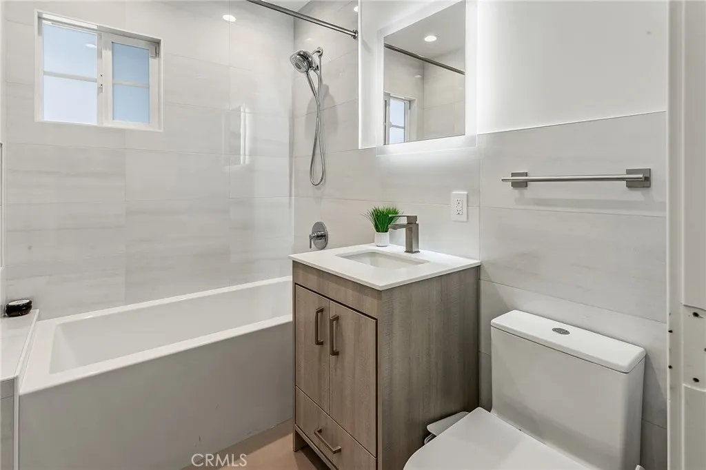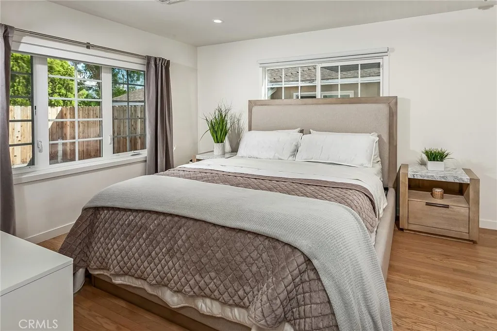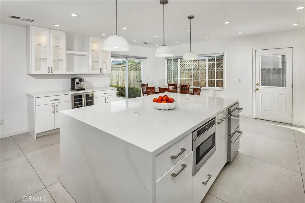 Renovated Smart home with Control4 automation, Level 2 EV charger, and indoor/outdoor living with integrated AV, hardwood floors, new windows, new exterior doors, cedar fencing, fresh exterior paint, and upgraded drainage. 12-zone Rain Bird irrigation system with drip and spray lines. Integrated Control4 system with central automation hub, enterprise-grade networking, and distributed wireless access points providing full-coverage Wi-Fi. System controls lighting, TVs, and audio indoors and outdoors; pre-wired for additional switches and keypads and fully expandable. Family room features custom millwork built-ins, 220V electric fireplace, integrated AV system with 7 in-wall speakers, subwoofer, receiver, RGB accent lighting. Kitchen includes quartz waterfall countertops, custom lacquered cabinetry with glass display uppers and lighting, center island with breakfast bar, in-kitchen dining area, pantry, motorized window shades, pop-up outlets, and undermount sink with pull-down faucet. Equipped with pro-style Thor appliances including 6-burner gas range, double oven, hood, refrigerator, dishwasher, microwave drawer, warming drawer, and wine cooler. Primary suite offers walk-in closet and natural light. Primary bath features floor-to-ceiling tile, dual vanity, frameless backlit mirror with integrated digital display, zero-entry glass shower with multiple heads and body jets, bidet, and customizable RGB lighting. Additional bedrooms include hardwood floors, recessed lighting, and ample closet space. Guest bath updated with tile walls, modern vanity, undermount basin, and tub/show