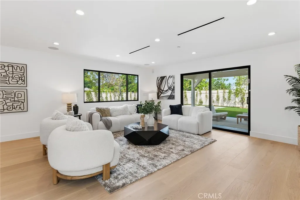 Gorgeous completely reimagined single story smart home desirably located adjacent to Walnut Acres. The expanded property truly feels like new construction as it was completely remodeled to the studs and boasts newly built pool, spa, and 220 SF covered patio. The front yard features large grass lawn, paver stone driveway that leads to the 2-car attached garage, and long covered front porch for added privacy. Step inside to find a completely open floor plan drenched in natural light featuring wide plank oak wood flooring throughout. The stunning kitchen features center island with second prep sink and breakfast bar seating, custom soft close cabinetry, Taj Mahal quartz waterfall counters, pantry space, and stainless smart appliances including double ovens and 5-burner stove with pot filler. The kitchen opens directly to both the dining area and spacious living room with built-in surround sound system and glass slider that opens to the yard. A guest powder bathroom is conveniently located off the entry near the living spaces. The primary suite is positioned perfectly to overlook the backyard and features large walk-in closet with custom built-ins and luxurious en-suite bathroom with dual sinks, designer tiling, and walk-in shower. There are three additional well appointed bedrooms, each with mirrored closets with custom organizers. One secondary bedroom has en-suite bathroom with walk-in shower. A large hall bathroom with tub and shower services the other two secondary bedrooms. There is direct access to the finished 2-car garage with epoxy flooring, recessed lighting, and bui