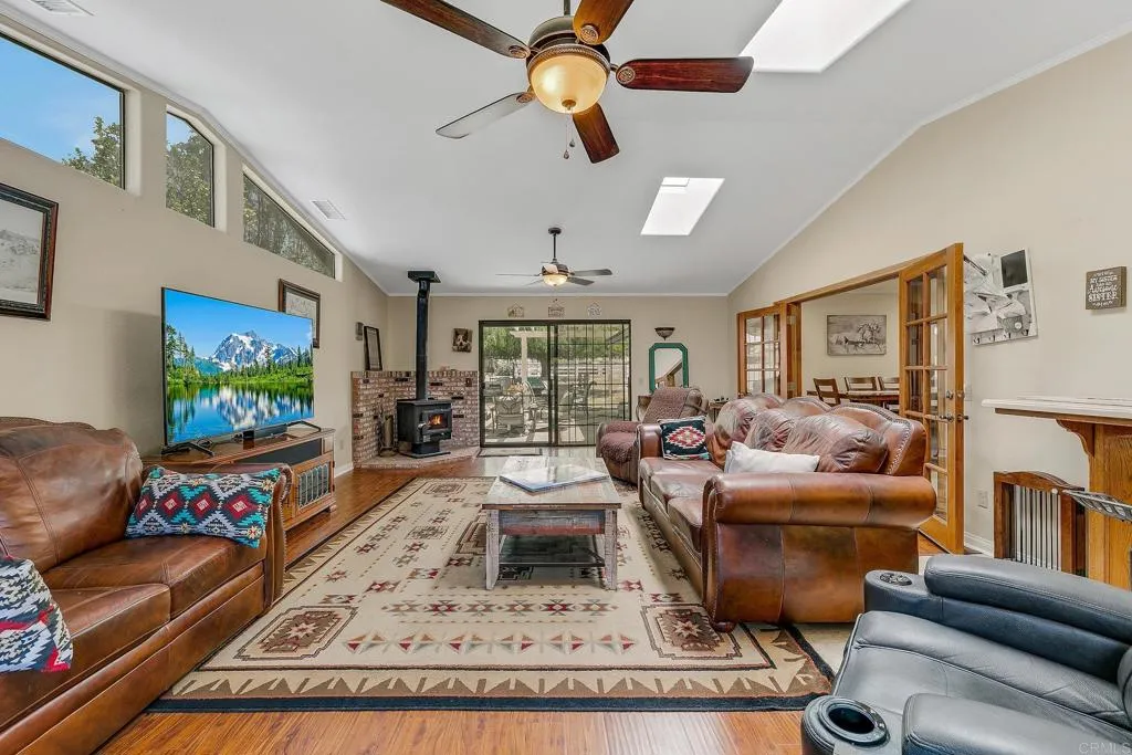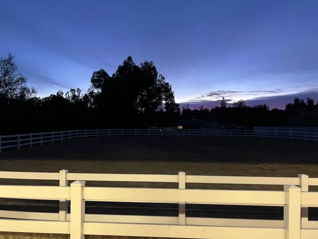 Set beneath a canopy of mature trees, this beautifully maintained and fully gated ranch property offers the perfect blend of comfort, functionality, and premier horse facilities. This is a place your horses would love to call home! The single-story home features approximately 2,005 sq ft with 3 bedrooms and 2 bathrooms, showcasing travertine, wood, and carpet flooring throughout. The thoughtfully designed kitchen includes Kitchen Aid appliances, a large 7-foot island, abundant cabinetry, and a spacious pantry. Multiple living spaces offer warmth and charm with a wood-burning brick fireplace, cozy wood stove, skylights, and French oak doors that open to the spacious family room. Step outside to a covered Aluma wood patio complete with ceiling fans, a mounted TV, and ideal for entertaining. Equestrian facilities are truly exceptional. The 5-stall show barn includes: (4) 12x16 stalls and (1) 12x24 foaling stall, stall mats, corner feeders, lighting, tack room, feed room with epoxy flooring, refrigerator, wash bay with hot water, and satellite/XM radio with exterior speakers. The property also features: 100x125-ft riding arena with sand footing and 3-rail vinyl fencing, 50-ft round pen with lights and automatic sprinklers, two turnout paddocks (60x60 & 60x90) with shelters, misters, and auto water, vinyl fencing and fully fenced 6-ft perimeter with electric gate entry, and two additional storage sheds. Additional highlights include a permitted 2,000 sq ft detached garage (currently used as an art/sewing studio with bedroom and bath), 22 fully paid solar panels, updated HVAC and
